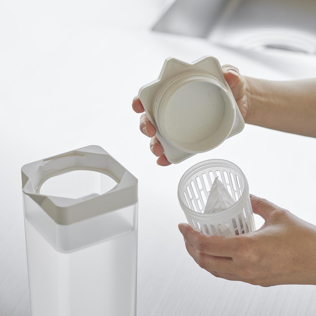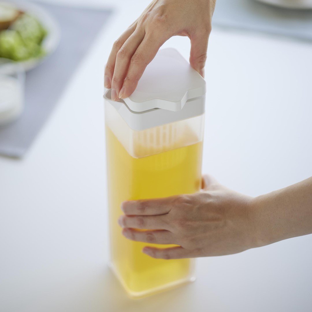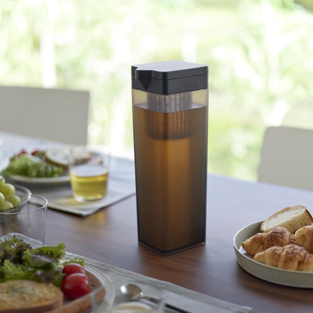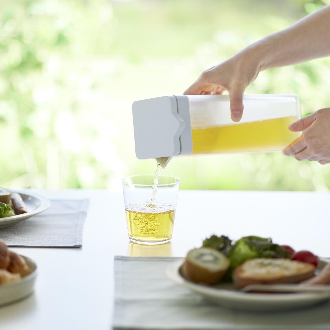 こぼさず横置きできる冷水筒パッキンが付いたフタのおかげで、横に倒した状態でも中の液体がこぼれにくい構造です。牛乳やジュースの紙パックでドアポケットのスペースが埋まっているときも、横置きで収納できるので冷たいお茶を作るのを諦めなくてOK。食卓にもなじみやすい、2色のカラーバリエーションカラーは、中のドリンクの色が見えやすいホワイトと、スタイリッシュなブラックをご用意しました。どちらも冷蔵庫や食卓に置いておいても違和感を感じさせないシンプルなカラーリングです。冷蔵庫やお手持ちのテーブルウェアにあわせてお好きなカラーをお選びください。四角いすっきりとしたフォルム冷蔵庫のドアポケットに収納しやすい四角い形状です。取っ手で場所を圧迫されないので他の物を入れるスペースも確保できます。底に向かって少し細くなっていくデザインは片手で持った時の安定感を高めます。簡単に注げて、水出しドリンクも作りやすいストレーナー付き飲み物を注ぐときには、フタを反時計回りに90°回すだけ。ティーバッグを入れられるストレーナーがフタに付属しているので、暑い夏にうれしい水出しの麦茶も手軽に作れます。ストレーナーがフタに付いているから、ティーバッグの取り出しもスムーズです。お手入れラクチン。 食洗機で洗えるティーバッグ入れやパッキンはフタから取り外して、こまかな箇所まですみずみと洗えて衛生的です。食器洗い乾燥機対応なので、ドリンクを飲み終えたら他の食器と一緒に食洗機にセット。※食器洗い乾燥機は70~80℃以内の物に対応。必ず食器洗い乾燥機の説明書をご参照ください。