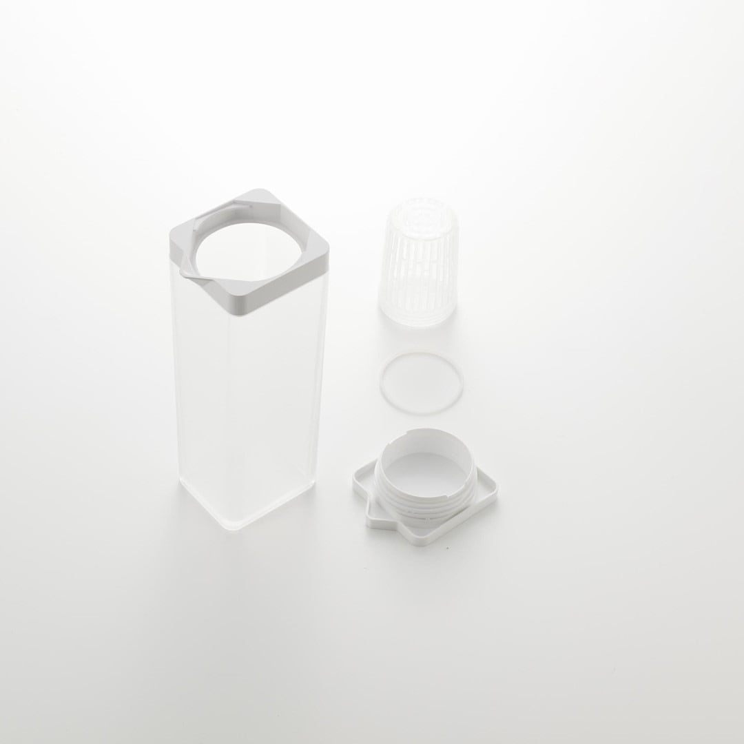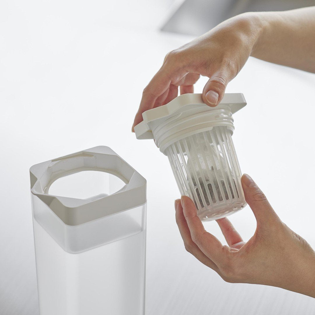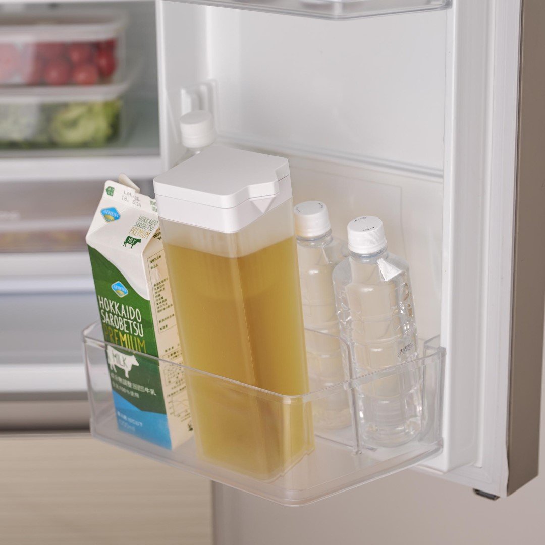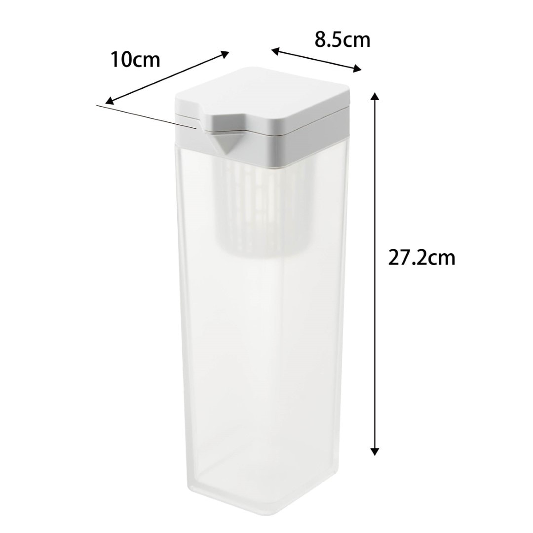 こぼさず横置きできる冷水筒パッキンが付いたフタのおかげで、横に倒した状態でも中の液体がこぼれにくい構造です。牛乳やジュースの紙パックでドアポケットのスペースが埋まっているときも、横置きで収納できるので冷たいお茶を作るのを諦めなくてOK。食卓にもなじみやすい、2色のカラーバリエーションカラーは、中のドリンクの色が見えやすいホワイトと、スタイリッシュなブラックをご用意しました。どちらも冷蔵庫や食卓に置いておいても違和感を感じさせないシンプルなカラーリングです。冷蔵庫やお手持ちのテーブルウェアにあわせてお好きなカラーをお選びください。四角いすっきりとしたフォルム冷蔵庫のドアポケットに収納しやすい四角い形状です。取っ手で場所を圧迫されないので他の物を入れるスペースも確保できます。底に向かって少し細くなっていくデザインは片手で持った時の安定感を高めます。簡単に注げて、水出しドリンクも作りやすいストレーナー付き飲み物を注ぐときには、フタを反時計回りに90°回すだけ。ティーバッグを入れられるストレーナーがフタに付属しているので、暑い夏にうれしい水出しの麦茶も手軽に作れます。ストレーナーがフタに付いているから、ティーバッグの取り出しもスムーズです。お手入れラクチン。 食洗機で洗えるティーバッグ入れやパッキンはフタから取り外して、こまかな箇所まですみずみと洗えて衛生的です。食器洗い乾燥機対応なので、ドリンクを飲み終えたら他の食器と一緒に食洗機にセット。※食器洗い乾燥機は70~80℃以内の物に対応。必ず食器洗い乾燥機の説明書をご参照ください。
