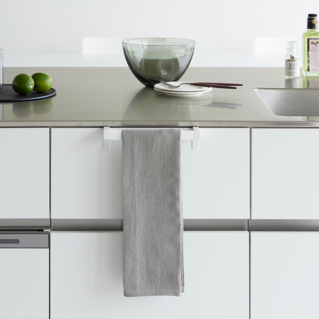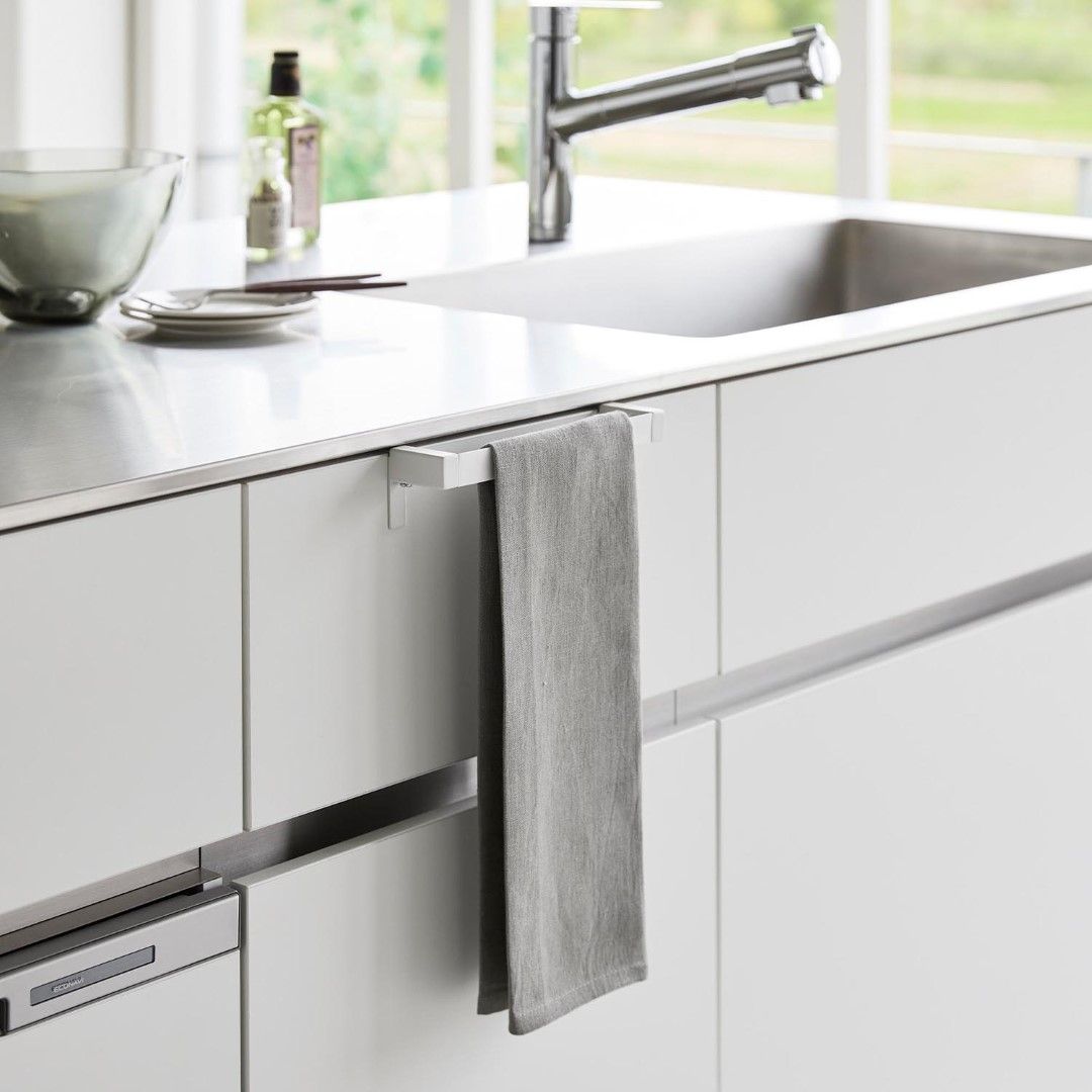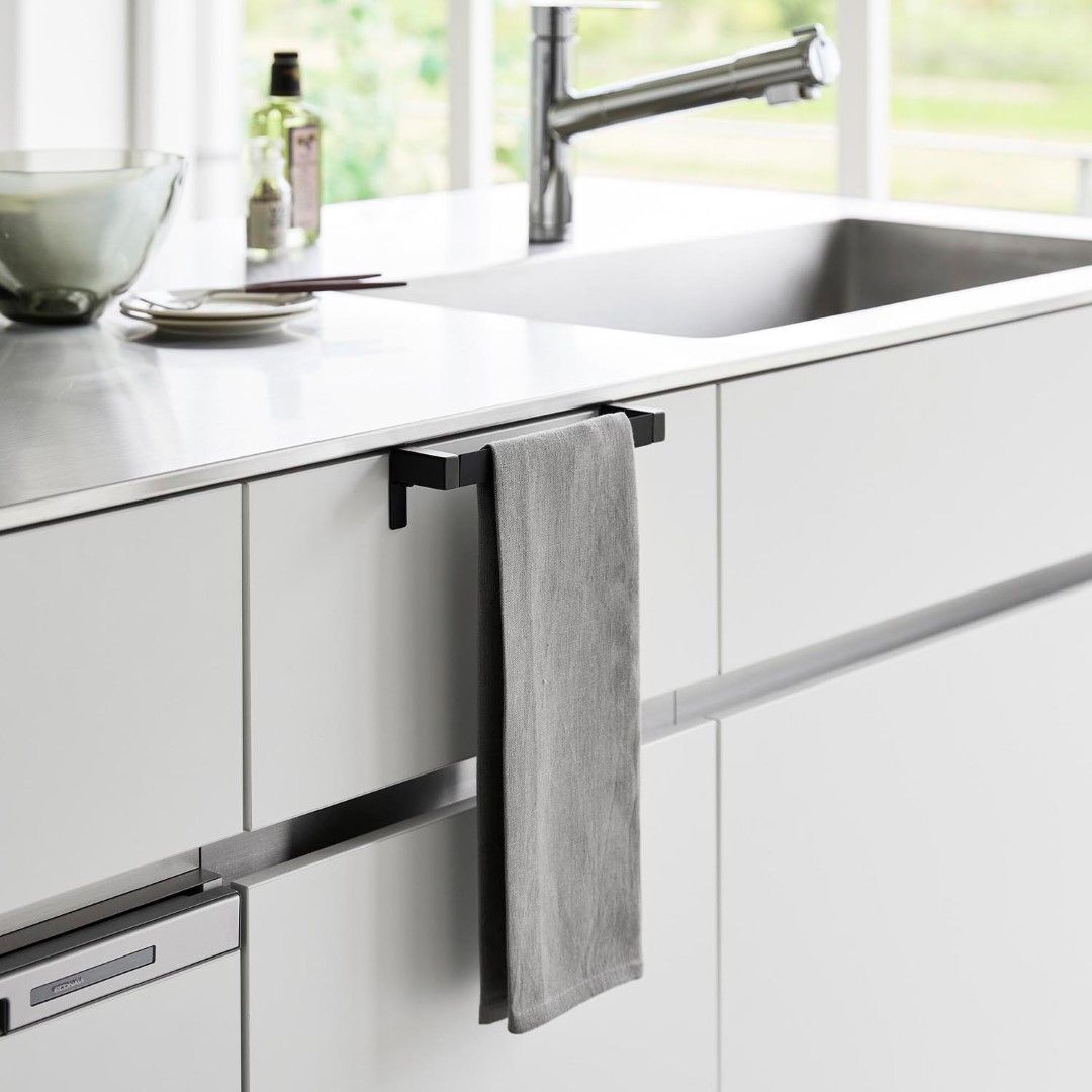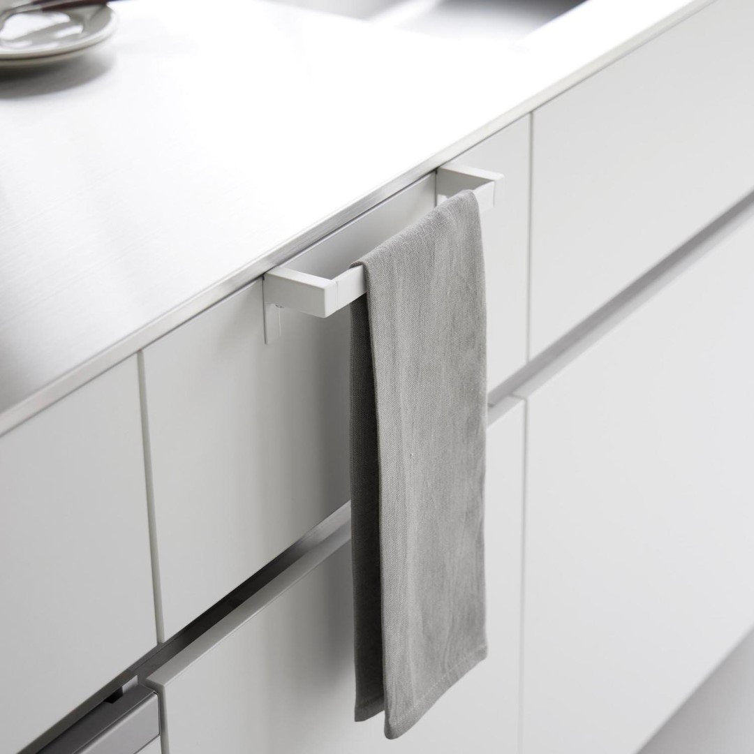 タオルが落ちづらい、キッチンタオルハンガーバー シンク下の引き出し収納に取り付けられるタオルハンガーバーです。フックを挟むだけの簡単設置。フック部分が伸縮するため、ご使用の引き出しや扉に合わせてしっかりとフィット。ネジと緩衝材を使用すればさらにしっかりと固定します。空間になじむ、2色のカラーバリエーション カラーは、清潔感のあるホワイト、スタイリッシュなブラックをご用意しました。どんな雰囲気のキッチンや洗面所にも合わせやすいモノトーンカラーです。シンク周辺のインテリアやキッチン小物に合わせてお好みのカラーをお選びください。シリコーン製バーだから圧倒的な滑りにくさ ハンガーのバー部分がシリコーン製となっているため掛けたタオルが滑り落ちづらい仕様です。柔らかく軽い素材感のタオルを掛けてもスルっと滑らなくなるので、落ちてしまったタオルをいちいち拾ったり、落ちたタオルの衛生面を気にすることがグンと減ります。シンク回りでの作業がしやすい薄型ハンガーバー ハンガーの奥行きは4.5cmの薄型設計です。作業の邪魔にならない厚みなので腰に負担が掛かりづらいのもうれしいポイント。バーの上部はタオルがしっかりと引っ掛かる角ばった形状のためさらに滑り落ちづらい工夫が。使い方に合わせて選べる2サイズ展開 こちらのレギュラーサイズの他に、幅広のタオルや、タオルを2枚かけられるワイドサイズもご用意しております。手指やワークトップ用のキッチンタオル、食器を拭き上げる用のタオルと用途に合わせて2種類のタオルを掛けたい方にはワイドタイプがおすすめ。ライフスタイルに合わせて2つのサイズからお選びいただけます。※こちらの商品は『滑り落ち防止キッチンタオルハンガーバー』の商品となり、『滑り落ち防止キッチンタオルハンガーバーワイド』の商品は別売です。