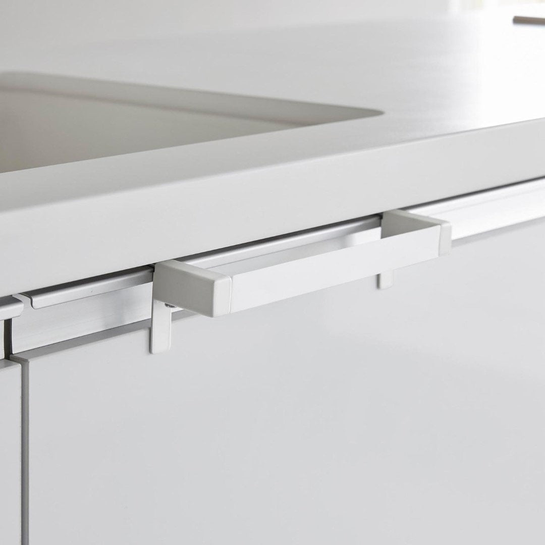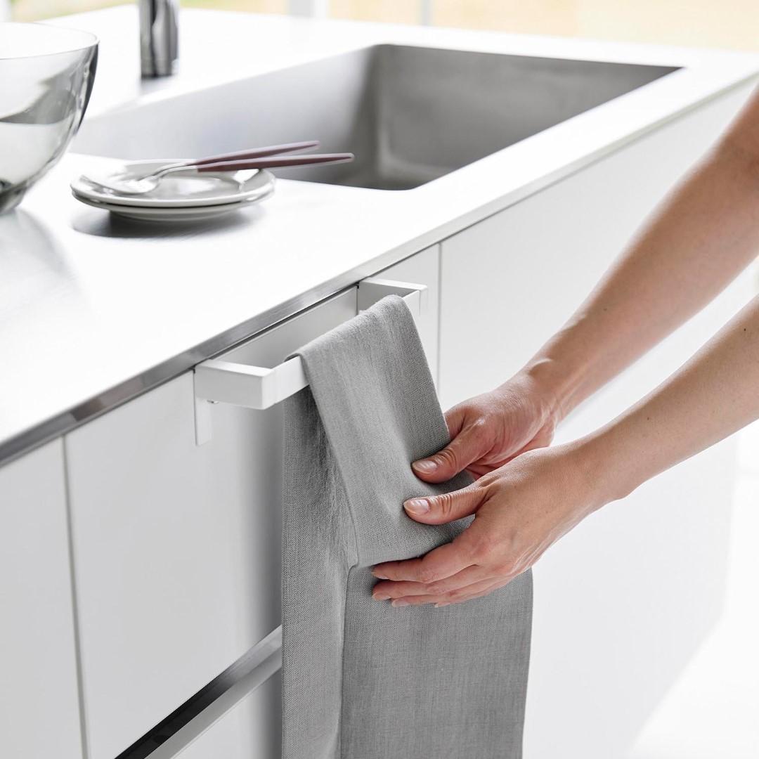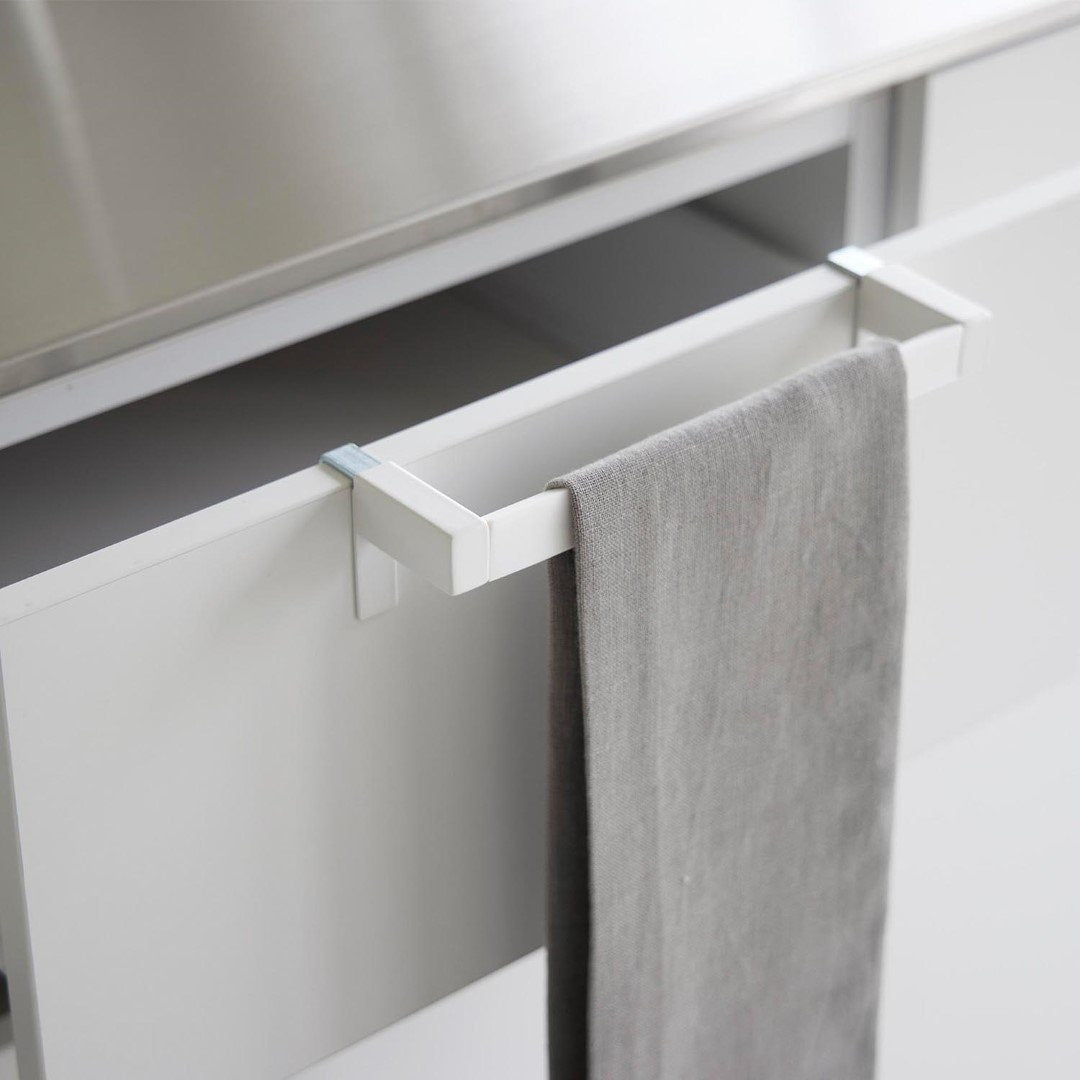タオルが落ちづらい、キッチンタオルハンガーバー シンク下の引き出し収納に取り付けられるタオルハンガーバーです。フックを挟むだけの簡単設置。フック部分が伸縮するため、ご使用の引き出しや扉に合わせてしっかりとフィット。ネジと緩衝材を使用すればさらにしっかりと固定します。空間になじむ、2色のカラーバリエーション カラーは、清潔感のあるホワイト、スタイリッシュなブラックをご用意しました。どんな雰囲気のキッチンや洗面所にも合わせやすいモノトーンカラーです。シンク周辺のインテリアやキッチン小物に合わせてお好みのカラーをお選びください。シリコーン製バーだから圧倒的な滑りにくさ ハンガーのバー部分がシリコーン製となっているため掛けたタオルが滑り落ちづらい仕様です。柔らかく軽い素材感のタオルを掛けてもスルっと滑らなくなるので、落ちてしまったタオルをいちいち拾ったり、落ちたタオルの衛生面を気にすることがグンと減ります。シンク回りでの作業がしやすい薄型ハンガーバー ハンガーの奥行きは4.5cmの薄型設計です。作業の邪魔にならない厚みなので腰に負担が掛かりづらいのもうれしいポイント。バーの上部はタオルがしっかりと引っ掛かる角ばった形状のためさらに滑り落ちづらい工夫が。使い方に合わせて選べる2サイズ展開 こちらのレギュラーサイズの他に、幅広のタオルや、タオルを2枚かけられるワイドサイズもご用意しております。手指やワークトップ用のキッチンタオル、食器を拭き上げる用のタオルと用途に合わせて2種類のタオルを掛けたい方にはワイドタイプがおすすめ。ライフスタイルに合わせて2つのサイズからお選びいただけます。※こちらの商品は『滑り落ち防止キッチンタオルハンガーバー』の商品となり、『滑り落ち防止キッチンタオルハンガーバーワイド』の商品は別売です。