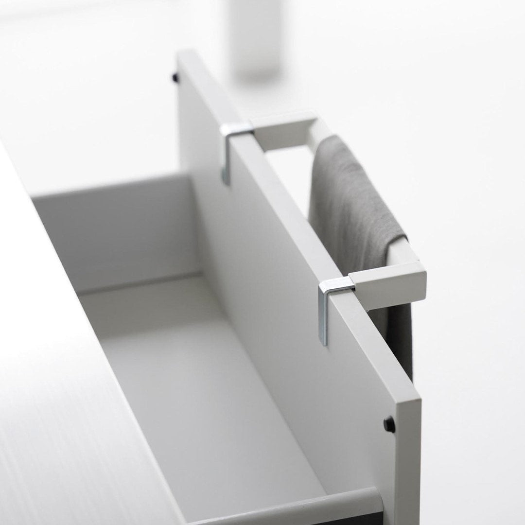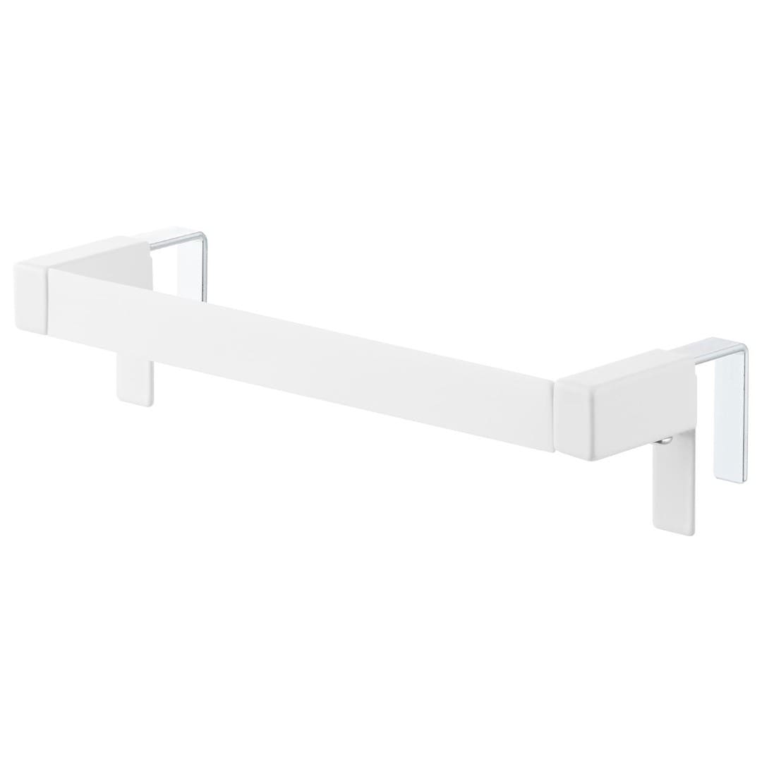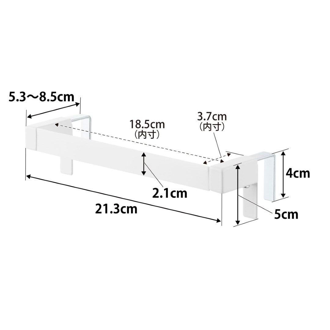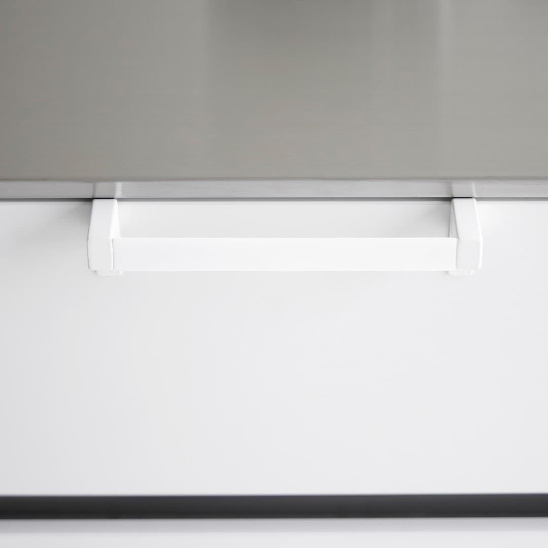 タオルが落ちづらい、キッチンタオルハンガーバー シンク下の引き出し収納に取り付けられるタオルハンガーバーです。フックを挟むだけの簡単設置。フック部分が伸縮するため、ご使用の引き出しや扉に合わせてしっかりとフィット。ネジと緩衝材を使用すればさらにしっかりと固定します。空間になじむ、2色のカラーバリエーション カラーは、清潔感のあるホワイト、スタイリッシュなブラックをご用意しました。どんな雰囲気のキッチンや洗面所にも合わせやすいモノトーンカラーです。シンク周辺のインテリアやキッチン小物に合わせてお好みのカラーをお選びください。シリコーン製バーだから圧倒的な滑りにくさ ハンガーのバー部分がシリコーン製となっているため掛けたタオルが滑り落ちづらい仕様です。柔らかく軽い素材感のタオルを掛けてもスルっと滑らなくなるので、落ちてしまったタオルをいちいち拾ったり、落ちたタオルの衛生面を気にすることがグンと減ります。シンク回りでの作業がしやすい薄型ハンガーバー ハンガーの奥行きは4.5cmの薄型設計です。作業の邪魔にならない厚みなので腰に負担が掛かりづらいのもうれしいポイント。バーの上部はタオルがしっかりと引っ掛かる角ばった形状のためさらに滑り落ちづらい工夫が。使い方に合わせて選べる2サイズ展開 こちらのレギュラーサイズの他に、幅広のタオルや、タオルを2枚かけられるワイドサイズもご用意しております。手指やワークトップ用のキッチンタオル、食器を拭き上げる用のタオルと用途に合わせて2種類のタオルを掛けたい方にはワイドタイプがおすすめ。ライフスタイルに合わせて2つのサイズからお選びいただけます。※こちらの商品は『滑り落ち防止キッチンタオルハンガーバー』の商品となり、『滑り落ち防止キッチンタオルハンガーバーワイド』の商品は別売です。