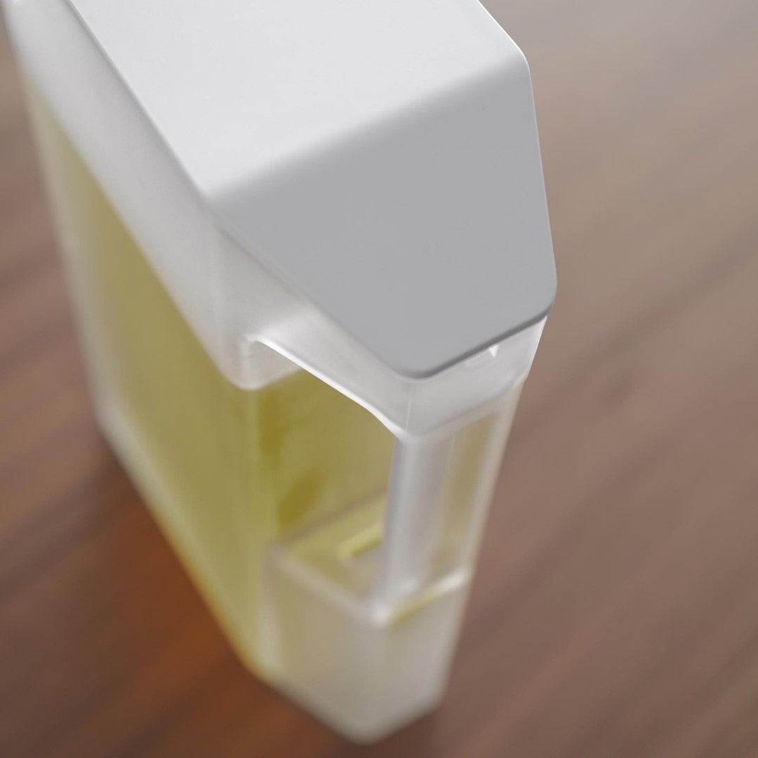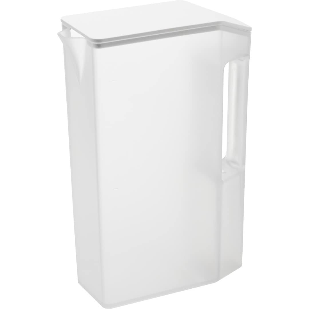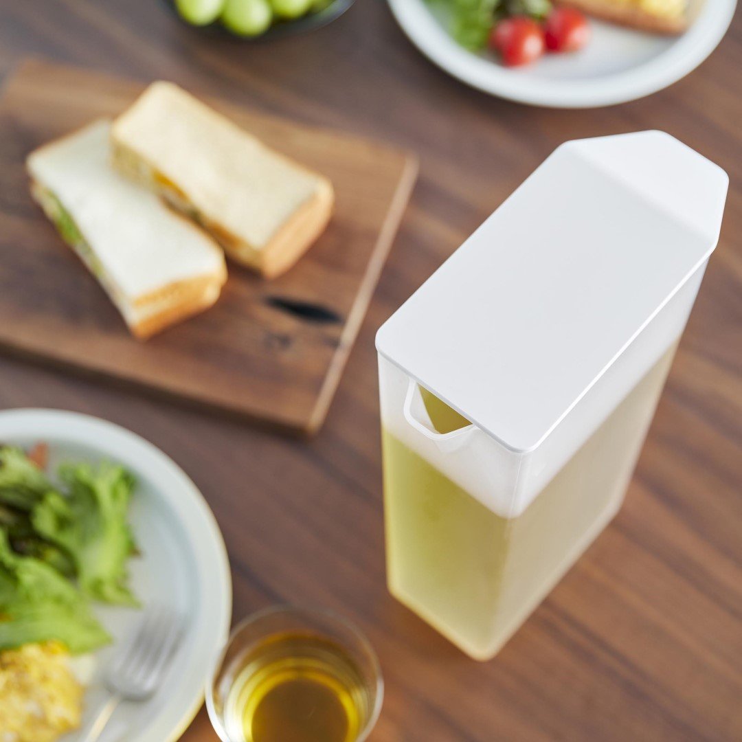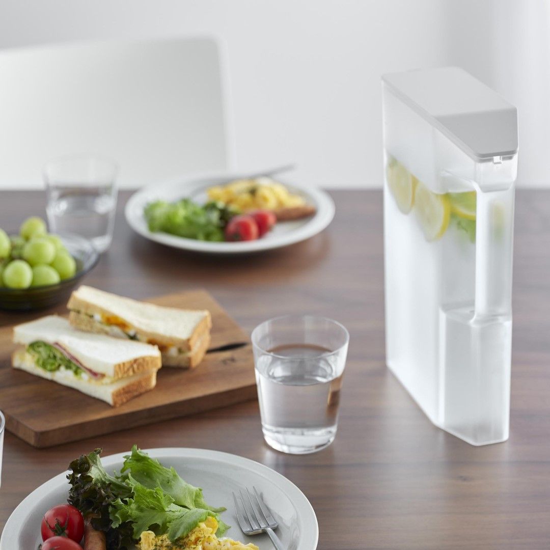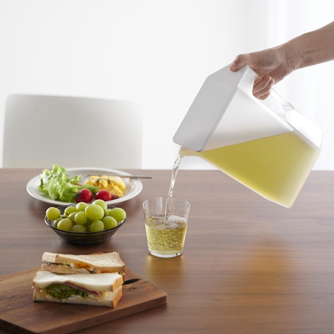 持ちやすく、注ぎやすく、収まりが良いスリムさ安定して持ち運びやすい取っ手付きの冷水筒です。幅8.1cmの薄型設計ボトルは冷蔵庫の手前ドアポケットにもスッキリと収まりやすいスリムさです。太めのハンドルは片手で持ったときに親指を添えやすく、握りやすい形状をしています。キッチンや食卓に似合う、2色のカラーバリエーションカラーは、明るい印象のホワイト、スタイリッシュなブラックをご用意しました。キッチンや冷蔵庫、食卓にマッチし、ドリンクの色を邪魔しないシンプルなカラーリングです。お手持ちのテーブルウェアなどに合わせてお好みのカラーをお選びください。中が見やすく涼やかな半透明ボトル飲み物の色が見えやすい半透明のボトルは、2種類以上のドリンクをストックしていても欲しいドリンクがパッと一目でわかります。カットしたレモンやオレンジ、ミントを入れたフレーバーウォーターも、ボトルの見た目から楽しめます。希釈飲料水も作りやすい便利な目盛り付き本体には1Lと2Lが一目でわかる目盛り付きです。濃縮タイプの麦茶や紅茶、コーヒーなどを使ってお茶を作るときも、軽量カップを使わずに冷水筒だけで適切な水の量を計ることが可能です。使う道具が少なければ洗い物が少なく済みます。少ないパーツや水抜き穴で、お手入れしやすい工夫フタと本体だけのシンプルな構造です。余計なパーツが無いからお手入れがラクちんです。洗った容器を逆さまに伏せると、持ち手の内側にある穴からも水が抜ける設計になっています。早く乾かせるから洗うのが億劫にならず、清潔に使い続けられます。