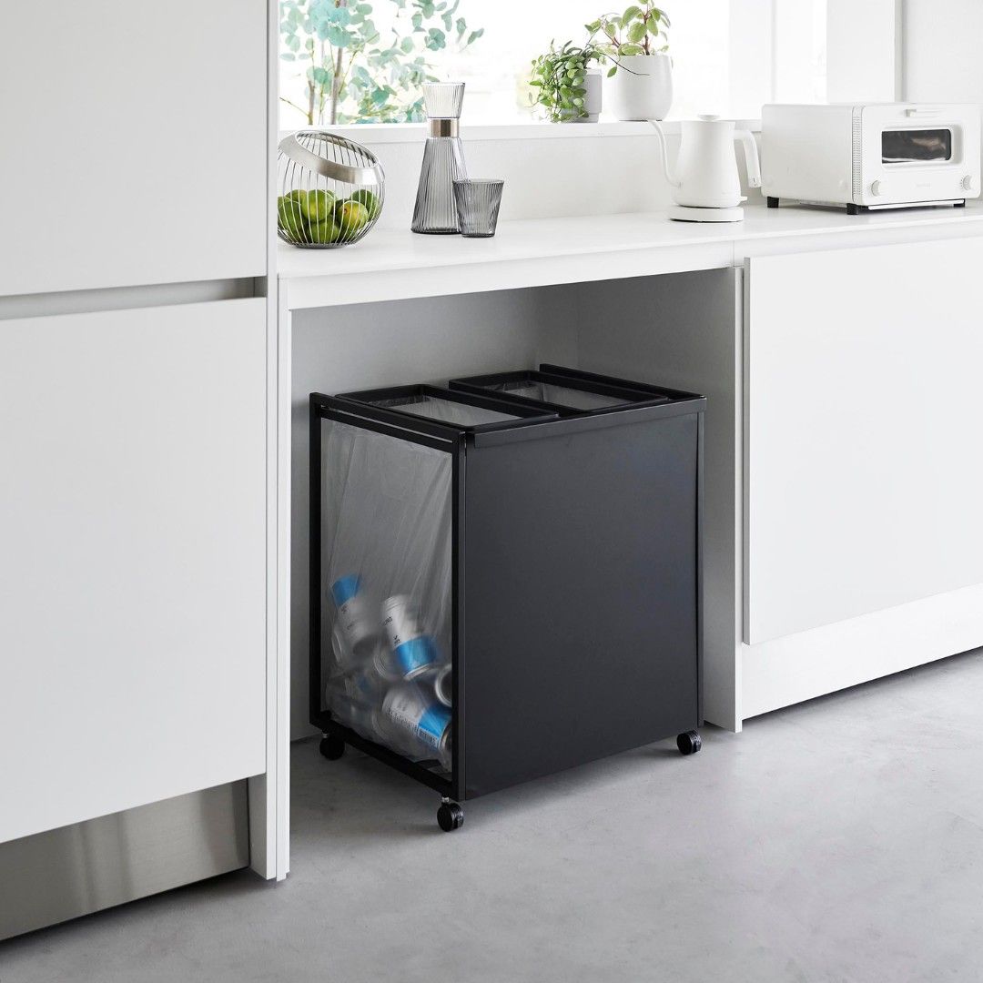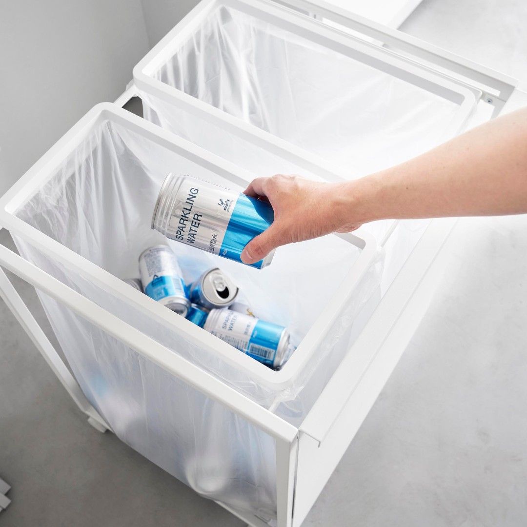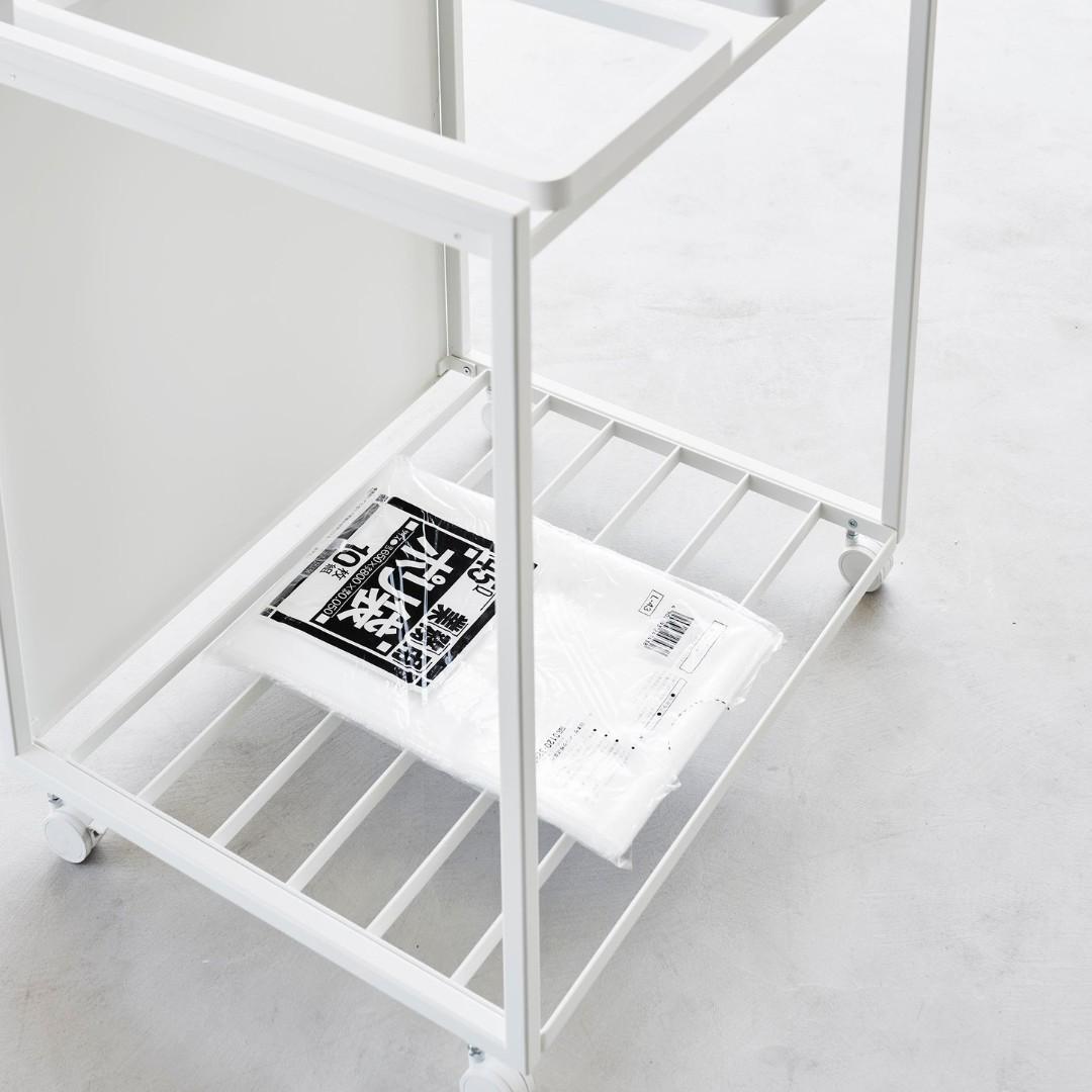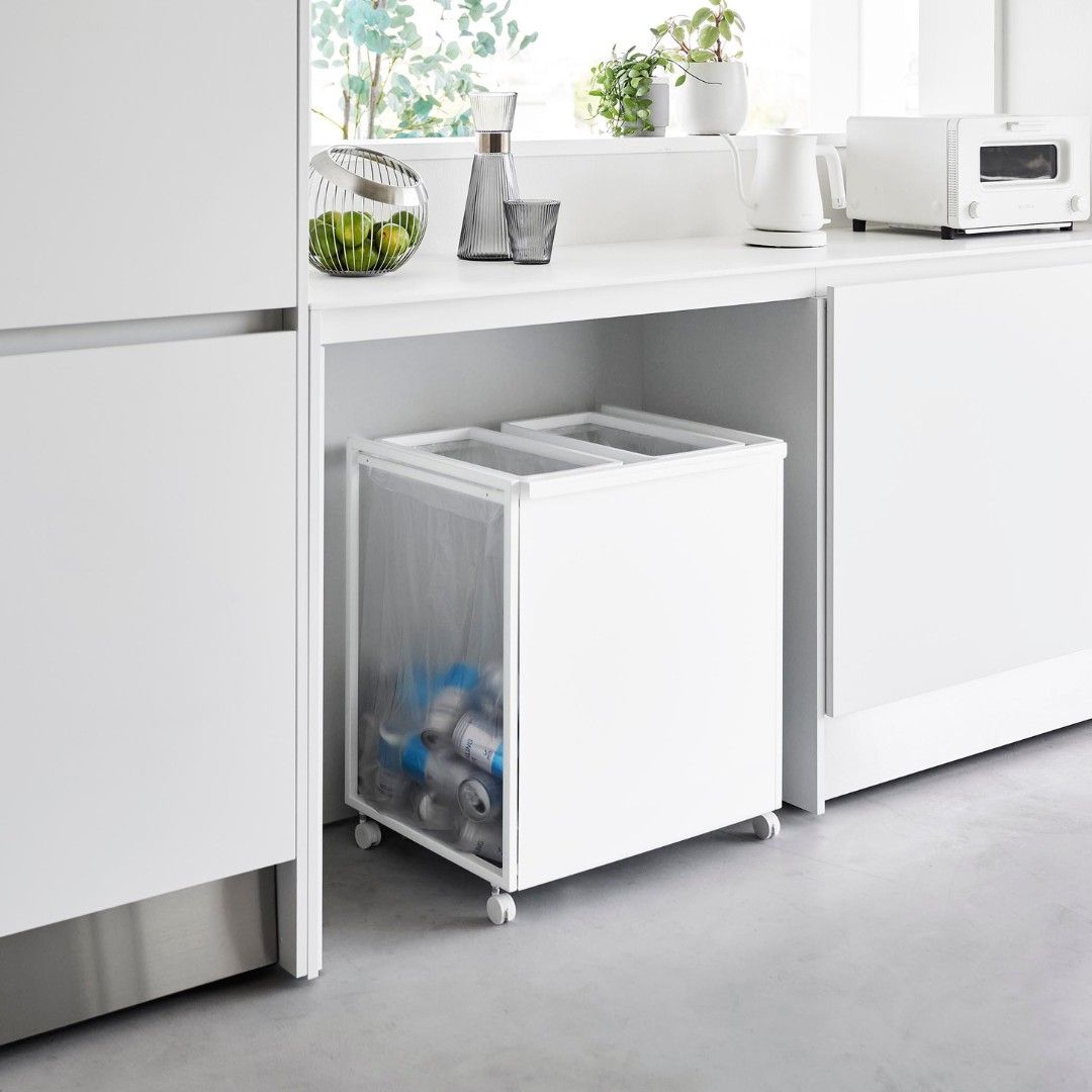 45Lのゴミを隠してスマートに分別 目隠ししながら2種のゴミを分別できるダストボックス。パッと見ただけではごみ箱だと気が付かれにくい洗練されたデザインです。目隠し面を表にしてキッチンカウンター横に置いておいても違和感を与えません。カウンター下などのスペースにも収まります。キッチンに合わせて選べる、2色のカラーバリエーション カラーは、清潔感のあるホワイト、スタイリッシュなブラックをご用意しました。どんなインテリアにも似合うモノトーンカラーです。キッチンのイメージに合わせてお好みのカラーをお選びください。蓋開けの動作は省力。 そのまま捨てるだけのシンプル設計 蓋なしのスッキリとしたデザインなので、ごみ捨ての度にわざわざ開ける必要がありません。ビン・缶・ペットボトル・プラスチックなどの分別にぴったりのアイテムです。飲み終わったペットボトルや缶の中身をすすいだら、そのままシンク横のダストボックスへポイッと捨てるだけ。移動が便利なハンドル&キャスター付き ハンドルを押したり引いたりすればキャスターがコロコロ転がり、ラクにダストボックスを移動させられます。ゴミ袋のストックはワゴン下部の棚網がおすすめです。ゴミ袋交換がスムーズに行えるうえ、「そろそろストックが無くなりそう」というのもすぐ気が付けます。袋のセットも、回収も、簡単すぎる。 上部のストッパーでゴミ袋の口を固定したらセットが完了。 ゴミ箱の底に手を伸ばして袋をセット、といった大変な手間がなくなります。ゴミ袋の回収時はストッパーを外して手前からサッと引き出すだけ。重いゴミを持ち上げる必要はありません。※別ページにて3分別タイプもご用意しております。