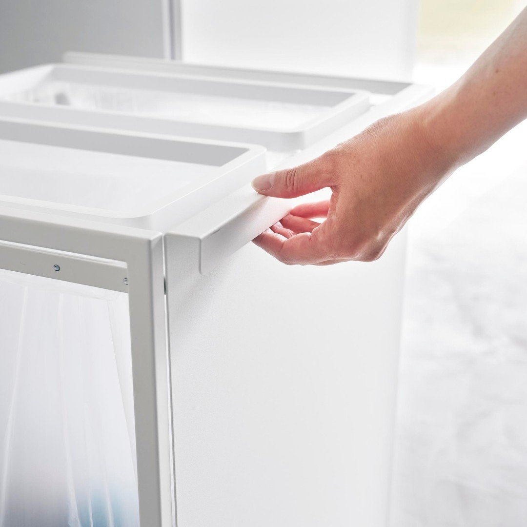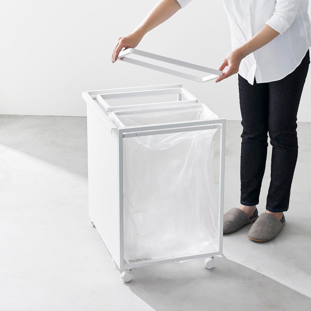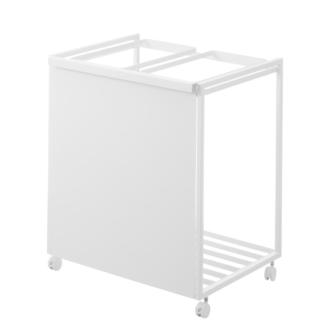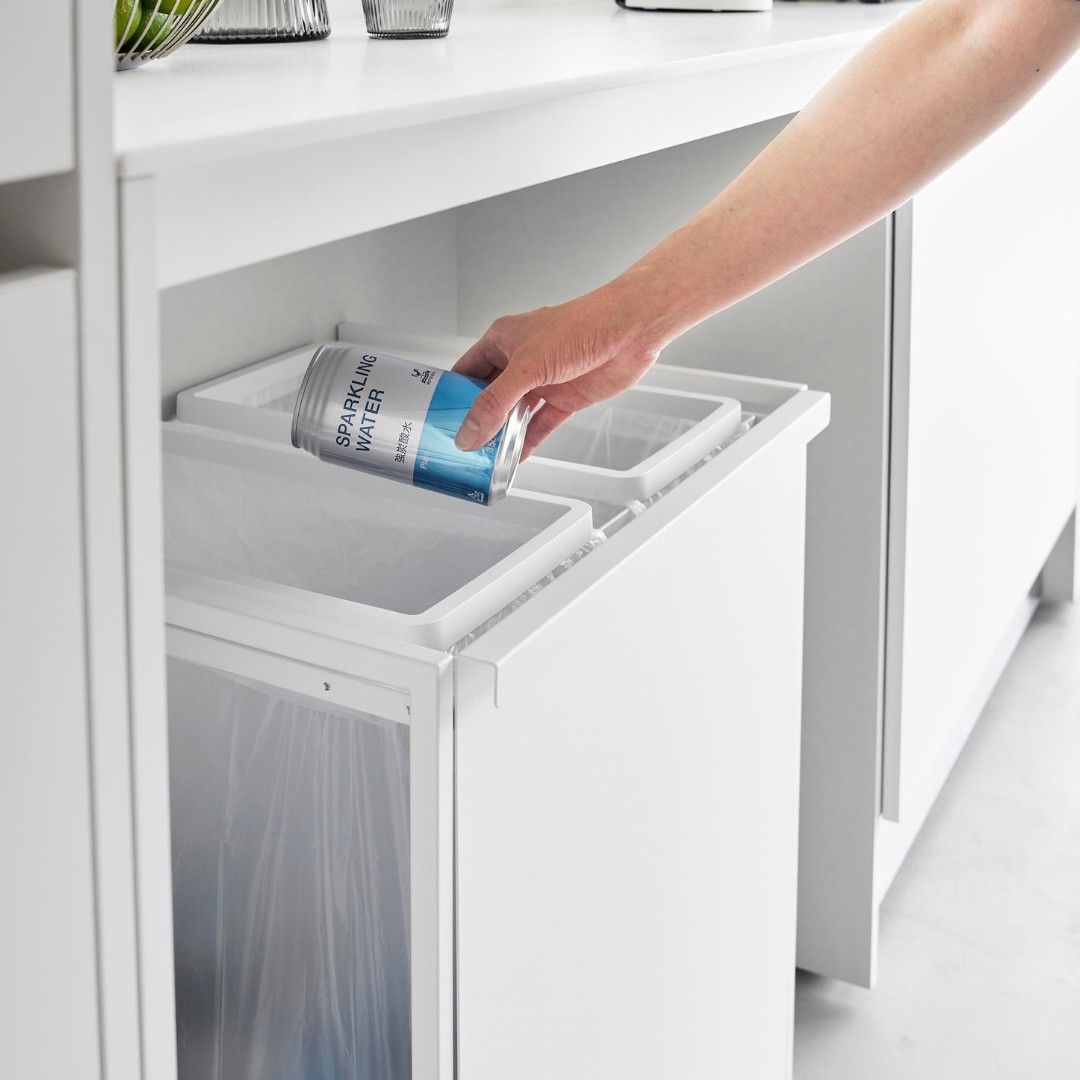 45Lのゴミを隠してスマートに分別 目隠ししながら2種のゴミを分別できるダストボックス。パッと見ただけではごみ箱だと気が付かれにくい洗練されたデザインです。目隠し面を表にしてキッチンカウンター横に置いておいても違和感を与えません。カウンター下などのスペースにも収まります。キッチンに合わせて選べる、2色のカラーバリエーション カラーは、清潔感のあるホワイト、スタイリッシュなブラックをご用意しました。どんなインテリアにも似合うモノトーンカラーです。キッチンのイメージに合わせてお好みのカラーをお選びください。蓋開けの動作は省力。 そのまま捨てるだけのシンプル設計 蓋なしのスッキリとしたデザインなので、ごみ捨ての度にわざわざ開ける必要がありません。ビン・缶・ペットボトル・プラスチックなどの分別にぴったりのアイテムです。飲み終わったペットボトルや缶の中身をすすいだら、そのままシンク横のダストボックスへポイッと捨てるだけ。移動が便利なハンドル&キャスター付き ハンドルを押したり引いたりすればキャスターがコロコロ転がり、ラクにダストボックスを移動させられます。ゴミ袋のストックはワゴン下部の棚網がおすすめです。ゴミ袋交換がスムーズに行えるうえ、「そろそろストックが無くなりそう」というのもすぐ気が付けます。袋のセットも、回収も、簡単すぎる。 上部のストッパーでゴミ袋の口を固定したらセットが完了。 ゴミ箱の底に手を伸ばして袋をセット、といった大変な手間がなくなります。ゴミ袋の回収時はストッパーを外して手前からサッと引き出すだけ。重いゴミを持ち上げる必要はありません。※別ページにて3分別タイプもご用意しております。