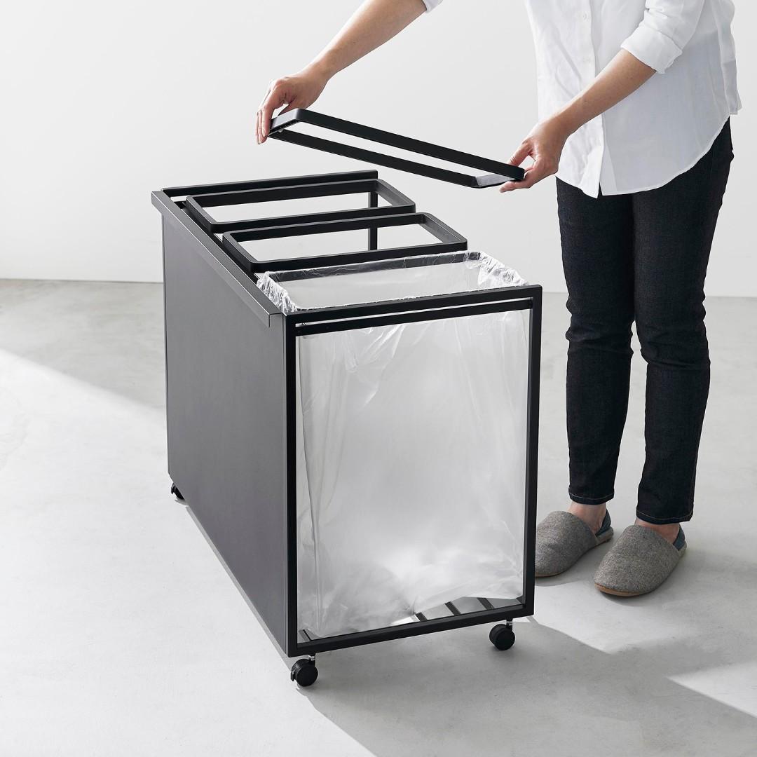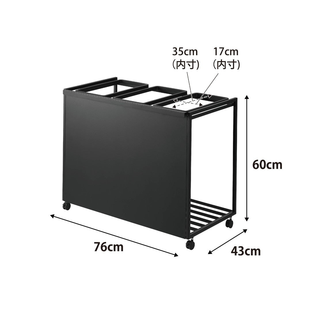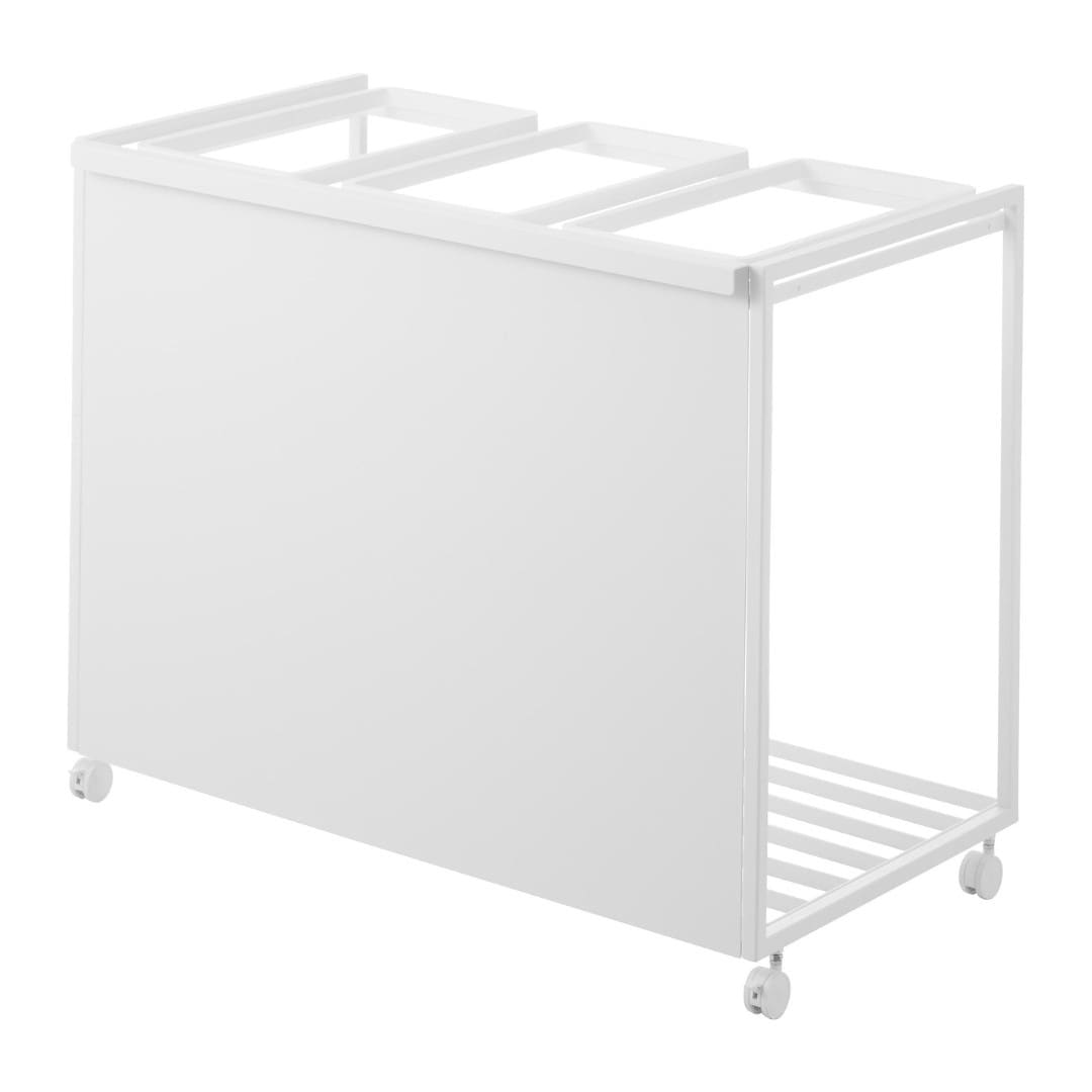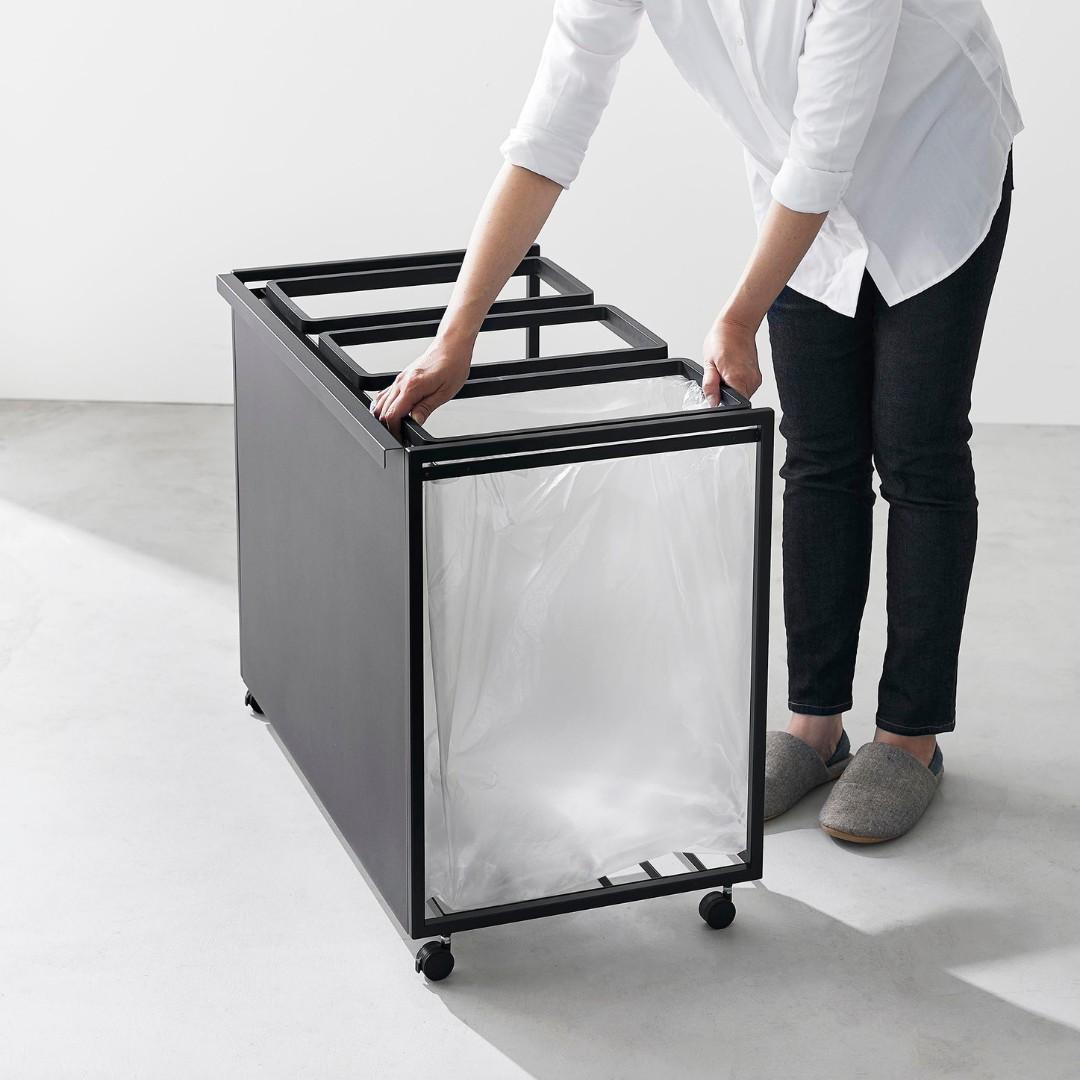 45Lのゴミを隠してスマートに分別 目隠ししながら3種のゴミを分別できるダストボックス。パッと見ただけではごみ箱だと気が付かれにくい洗練されたデザインです。目隠し面を表にしてキッチンカウンター横に置いておいても違和感を与えません。カウンター下などのスペースにも収まります。キッチンに合わせて選べる、2色のカラーバリエーション カラーは、清潔感のあるホワイト、スタイリッシュなブラックをご用意しました。どんなインテリアにも似合うモノトーンカラーです。キッチンのイメージに合わせてお好みのカラーをお選びください。蓋開けの動作は省力。 そのまま捨てるだけのシンプル設計 蓋なしのスッキリとしたデザインなので、ごみ捨ての度にわざわざ開ける必要がありません。ビン・缶・ペットボトル・プラスチックなどの分別にぴったりのアイテムです。飲み終わったペットボトルや缶の中身をすすいだら、そのままシンク横のダストボックスへポイッと捨てるだけ。移動が便利なハンドル&キャスター付き ハンドルを押したり引いたりすればキャスターがコロコロ転がり、ラクにダストボックスを移動させられます。ゴミ袋のストックはワゴン下部の棚網がおすすめです。ゴミ袋交換がスムーズに行えるうえ、「そろそろストックが無くなりそう」というのもすぐ気が付けます。袋のセットも、回収も、簡単すぎる。 上部のストッパーでゴミ袋の口を固定したらセットが完了。 ゴミ箱の底に手を伸ばして袋をセット、といった大変な手間がなくなります。ゴミ袋の回収時はストッパーを外して手前からサッと引き出すだけ。重いゴミを持ち上げる必要はありません。※別ページにて2分別タイプもご用意しております。