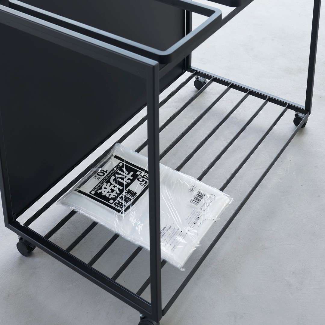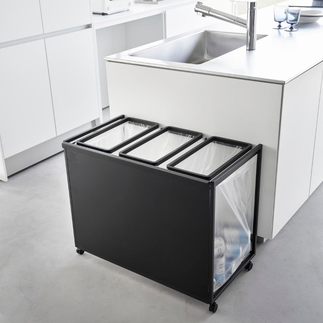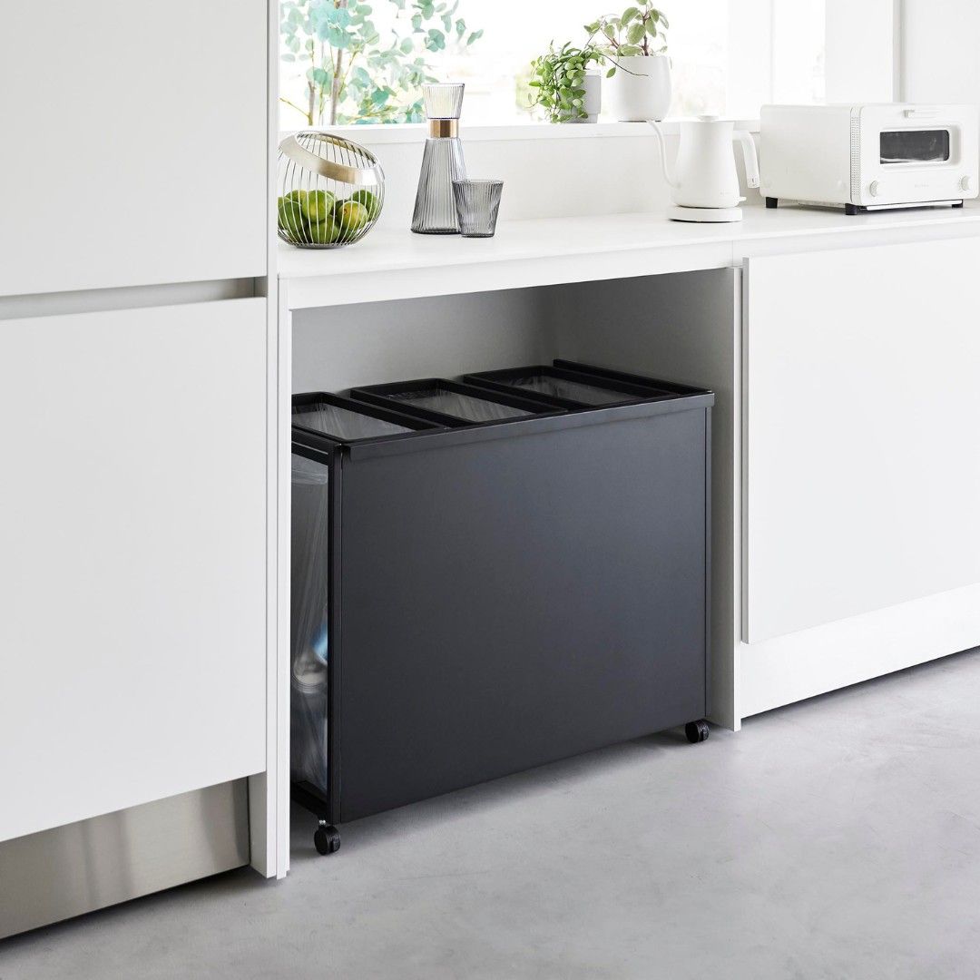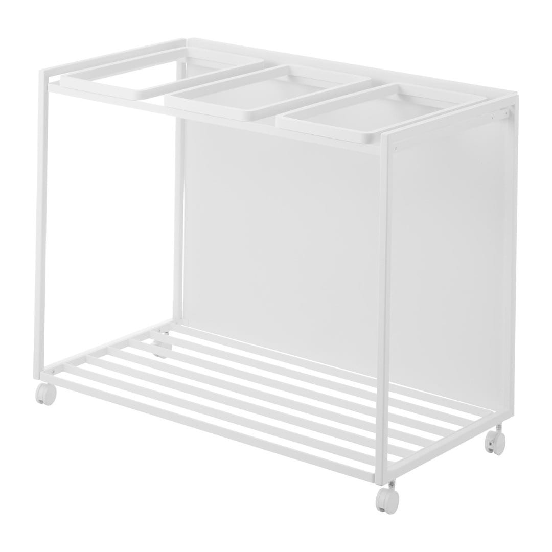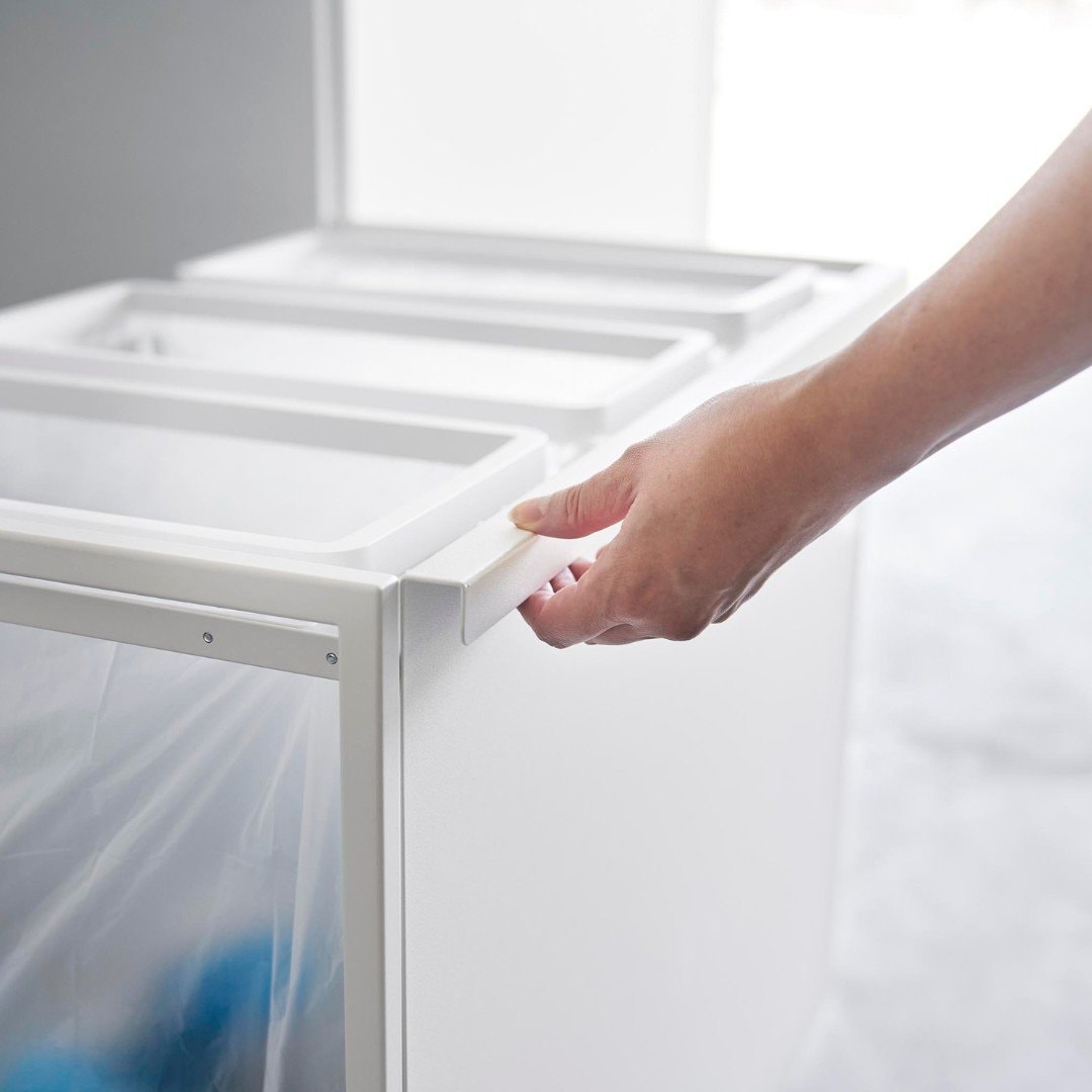 45Lのゴミを隠してスマートに分別 目隠ししながら3種のゴミを分別できるダストボックス。パッと見ただけではごみ箱だと気が付かれにくい洗練されたデザインです。目隠し面を表にしてキッチンカウンター横に置いておいても違和感を与えません。カウンター下などのスペースにも収まります。キッチンに合わせて選べる、2色のカラーバリエーション カラーは、清潔感のあるホワイト、スタイリッシュなブラックをご用意しました。どんなインテリアにも似合うモノトーンカラーです。キッチンのイメージに合わせてお好みのカラーをお選びください。蓋開けの動作は省力。 そのまま捨てるだけのシンプル設計 蓋なしのスッキリとしたデザインなので、ごみ捨ての度にわざわざ開ける必要がありません。ビン・缶・ペットボトル・プラスチックなどの分別にぴったりのアイテムです。飲み終わったペットボトルや缶の中身をすすいだら、そのままシンク横のダストボックスへポイッと捨てるだけ。移動が便利なハンドル&キャスター付き ハンドルを押したり引いたりすればキャスターがコロコロ転がり、ラクにダストボックスを移動させられます。ゴミ袋のストックはワゴン下部の棚網がおすすめです。ゴミ袋交換がスムーズに行えるうえ、「そろそろストックが無くなりそう」というのもすぐ気が付けます。袋のセットも、回収も、簡単すぎる。 上部のストッパーでゴミ袋の口を固定したらセットが完了。 ゴミ箱の底に手を伸ばして袋をセット、といった大変な手間がなくなります。ゴミ袋の回収時はストッパーを外して手前からサッと引き出すだけ。重いゴミを持ち上げる必要はありません。※別ページにて2分別タイプもご用意しております。