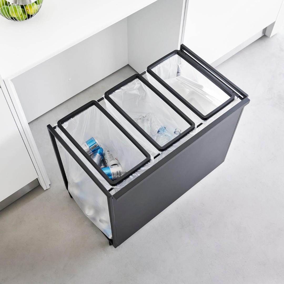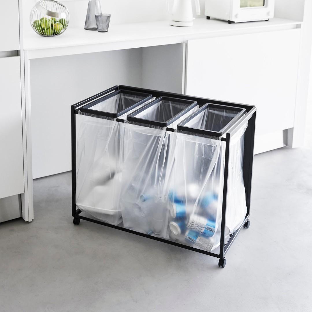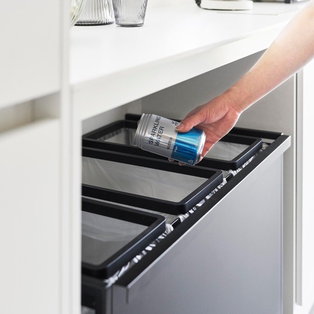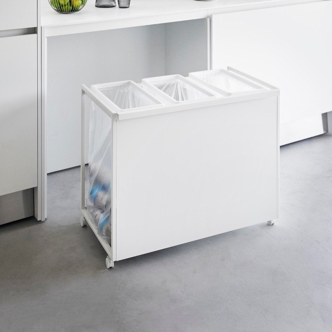 45Lのゴミを隠してスマートに分別 目隠ししながら3種のゴミを分別できるダストボックス。パッと見ただけではごみ箱だと気が付かれにくい洗練されたデザインです。目隠し面を表にしてキッチンカウンター横に置いておいても違和感を与えません。カウンター下などのスペースにも収まります。キッチンに合わせて選べる、2色のカラーバリエーション カラーは、清潔感のあるホワイト、スタイリッシュなブラックをご用意しました。どんなインテリアにも似合うモノトーンカラーです。キッチンのイメージに合わせてお好みのカラーをお選びください。蓋開けの動作は省力。 そのまま捨てるだけのシンプル設計 蓋なしのスッキリとしたデザインなので、ごみ捨ての度にわざわざ開ける必要がありません。ビン・缶・ペットボトル・プラスチックなどの分別にぴったりのアイテムです。飲み終わったペットボトルや缶の中身をすすいだら、そのままシンク横のダストボックスへポイッと捨てるだけ。移動が便利なハンドル&キャスター付き ハンドルを押したり引いたりすればキャスターがコロコロ転がり、ラクにダストボックスを移動させられます。ゴミ袋のストックはワゴン下部の棚網がおすすめです。ゴミ袋交換がスムーズに行えるうえ、「そろそろストックが無くなりそう」というのもすぐ気が付けます。袋のセットも、回収も、簡単すぎる。 上部のストッパーでゴミ袋の口を固定したらセットが完了。 ゴミ箱の底に手を伸ばして袋をセット、といった大変な手間がなくなります。ゴミ袋の回収時はストッパーを外して手前からサッと引き出すだけ。重いゴミを持ち上げる必要はありません。※別ページにて2分別タイプもご用意しております。