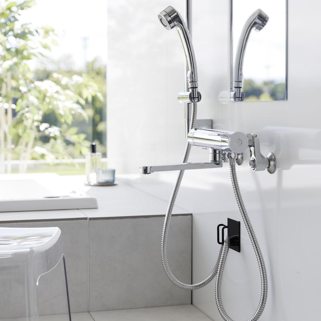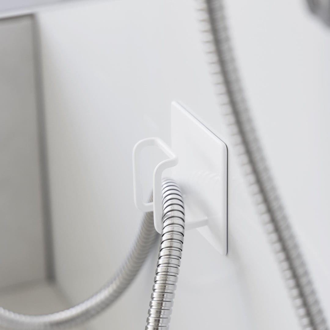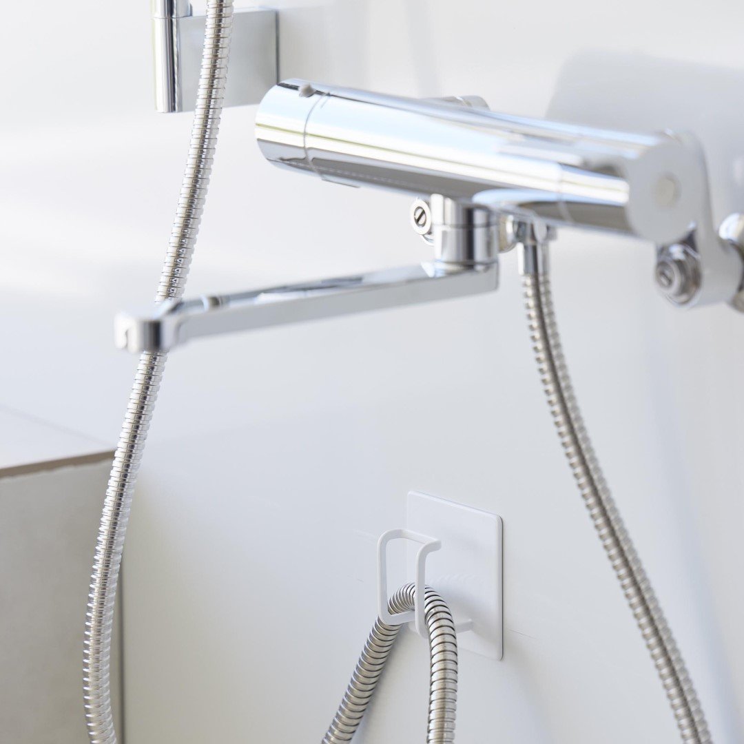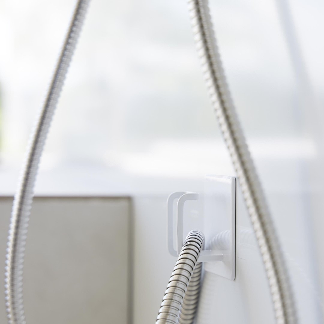 安全・衛生的。 ホースを床に垂らさないシャワーホースを浮かせて収納できるホースフックです。入浴中、ホースで足を引っ掛ける心配のあるお子様の転倒防止アイテムとしても便利。マグネットで簡単に取り付けができ、フックの向きを横にすればスプレーなどを引っ掛けて使うこともできます。バスルームの雰囲気に合わせて選べる、2色のカラーバリエーションカラーは、明るい印象のホワイト、スタイリッシュなブラックをご用意しました。どんなタイプの浴室にもなじむシンプルなモノトーンカラーです。壁や床、バスチェアなどのバス小物などに合わせてお好みのカラーをお選びください。掃除アイテムの引っ掛け収納にもフックを横向きに取り付ければ、バスモップやスプレー類の収納としてもご使用いただけます。モップ部がフックに引っ掛かり浮かせて収納が可能です。掃除が終われば浴室掃除アイテムも浮かせて、通気性や水切れよく収納。シャワーホースを浮かせてバスルーム内の乾燥を素早く床面にシャワーホースが触れている状態だと床面の乾燥がスムーズに行えず水分が残っている状態が長く続いてしまいます。バスルームの水分がいつまでも残り続けるとヌメリ汚れやカビの原因に繋がることも。お風呂に入ったあとはシャワーホースが床に触れないようにするのが◎。簡単。 マグネットでピタッと密着マグネット対応の壁面に本体をピタッと密着させれば設置が完了です。もちろん貼り直し可能なので、使い続けていくうちに最適な定位置が見つかればその度に移動はOK。壁面を傷つけずに固定できるので、新築や賃貸のお家でも使いやすい仕様です。
