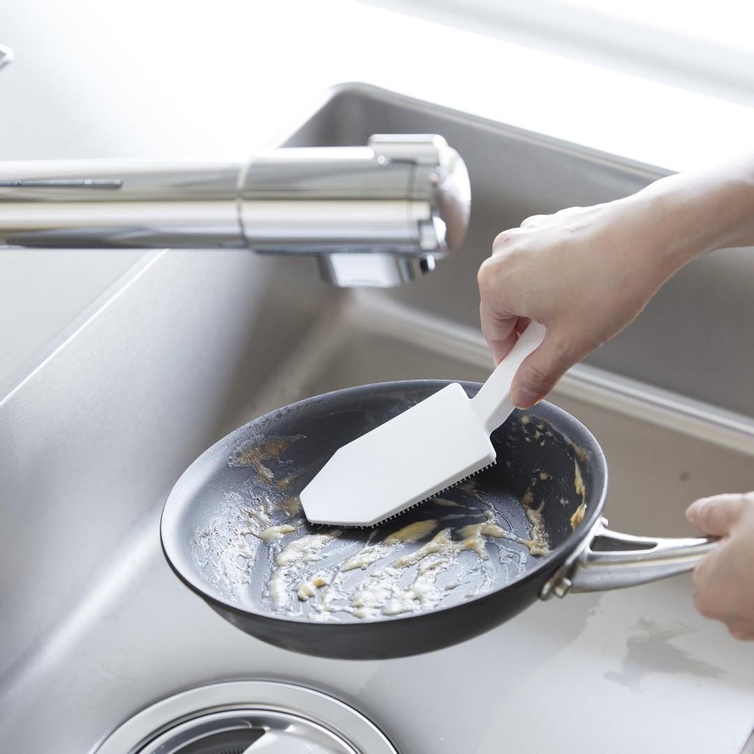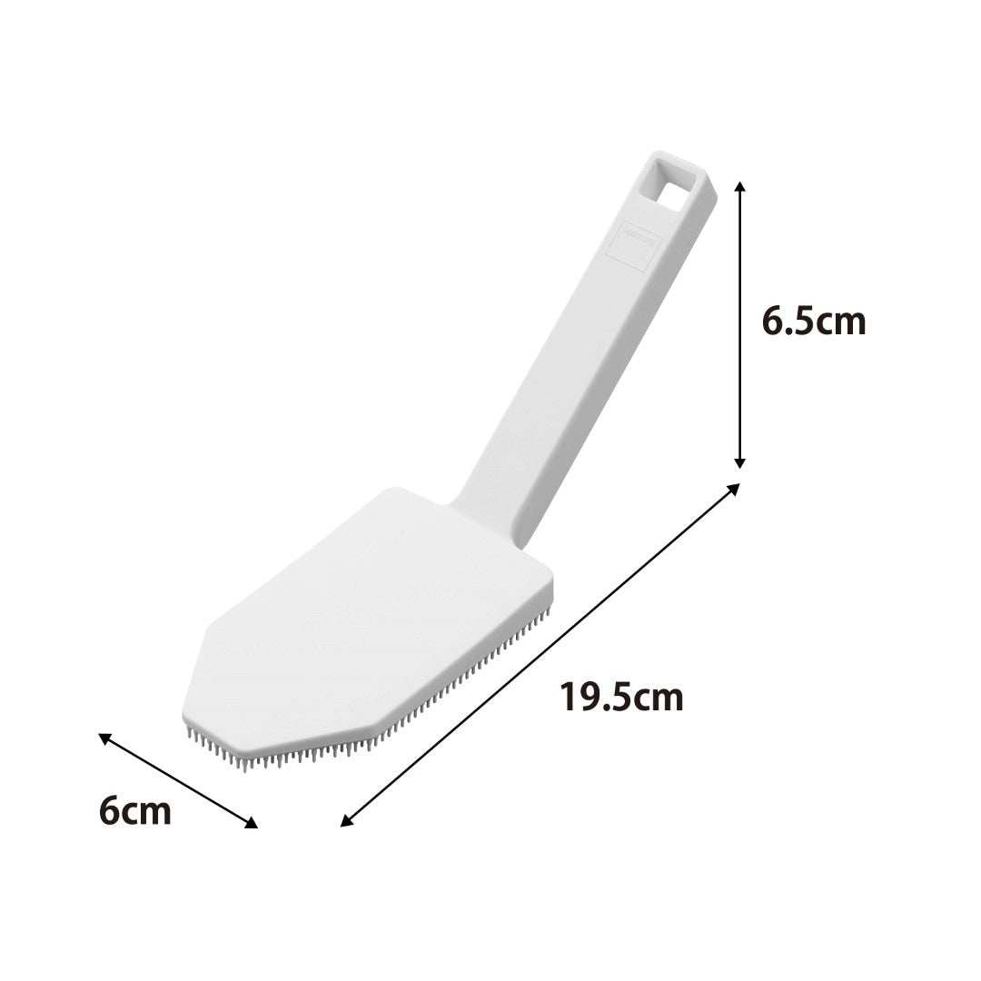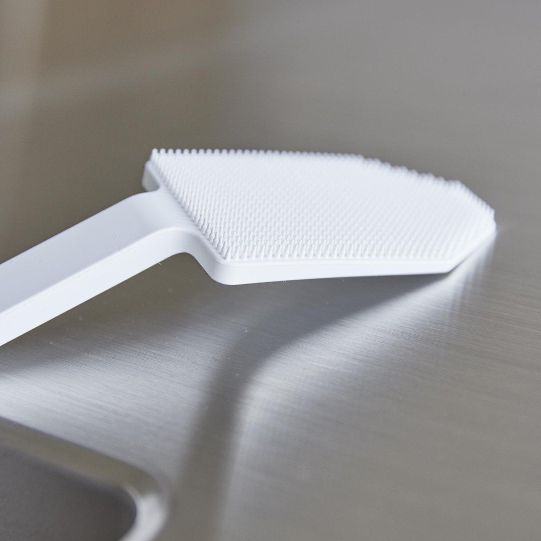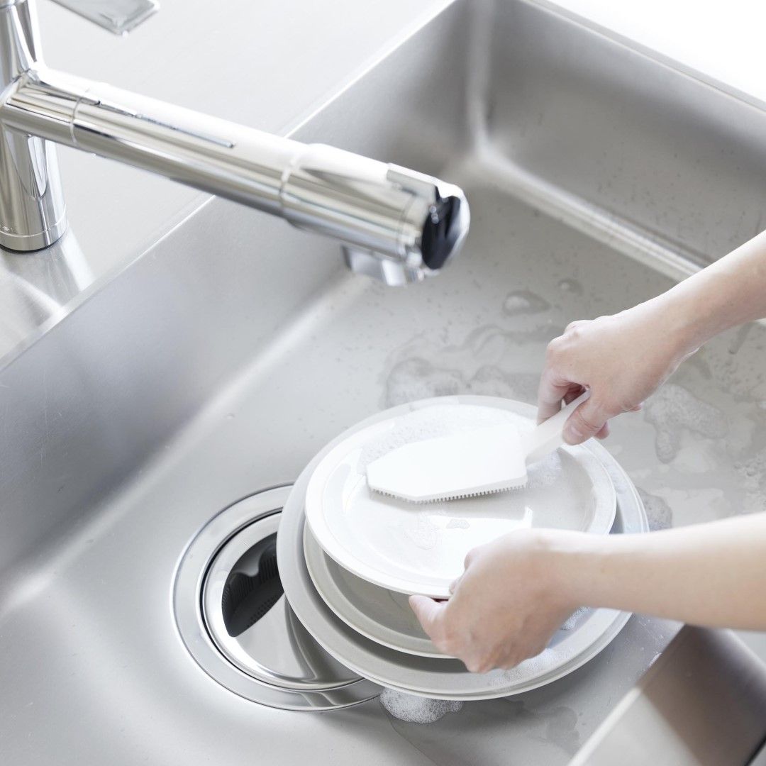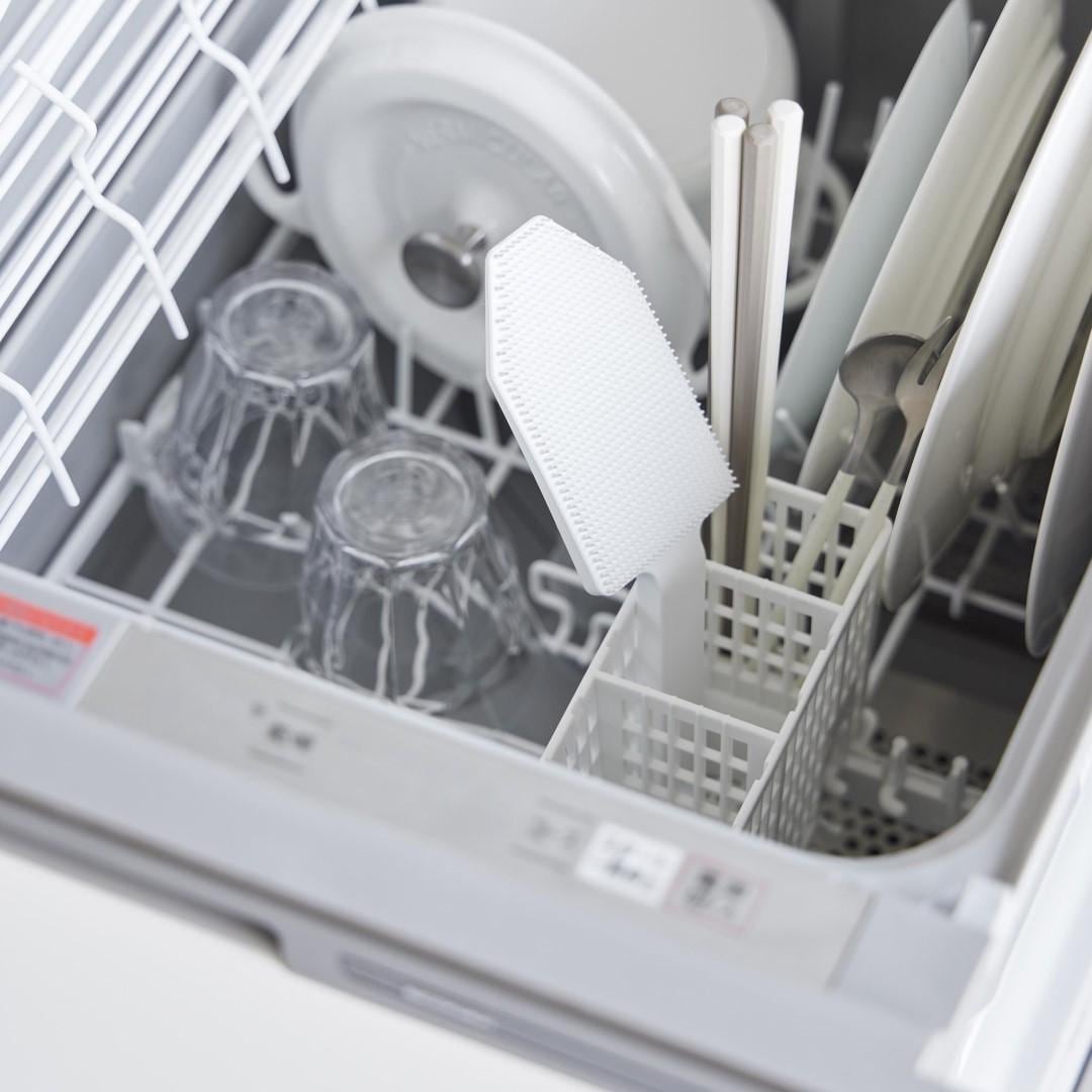 カレー鍋やシンク掃除に。 ハンドル付きで使い勝手◎なブラシ 予洗いに便利なハンドル付きシリコーンスポンジです。食洗機前の食器の汚れや、スポンジを汚したくないカレーやソースの付いた鍋やフライパンに。ハンドル付きなので手荒れが気になる方や、指先をあまり濡らしたくないネイルをしている方にもおすすめです。キッチンにぴったりな、2色のカラーバリエーション カラーは、清潔感のあるホワイト、スタイリッシュなブラックをご用意しました。キッチンに似合うシンプルなモノトーンカラーです。キッチンパネルやワークトップ、お手持ちの調理器具に合わせてお好みのカラーをお選びください。細かいブラシが汚れを徹底的にかき出す ザルの目に詰まった油汚れや食材のカスも、細かいブラシがザルの目に入り込んでスッキリとかき出します。スポンジだけでは取り切れなかった汚れが落ちきってとても気持ちがいいです。汚れが取り切れずにイライラ……なんてことがなくなります。食洗機の使用OKで清潔に使える 食器洗い後のシンク掃除にもご使用いただけます。掃除後は食洗機でお手入れ可能なので、食器洗い・シンク洗い兼用で使っていても気にならず衛生的。食洗機にかける前のお皿の予洗い、カレーやお肉を焼いた後の油分の多いフライパンを洗う際に便利なブラシです。シリコーン製なので油汚れがブラシに残らず使用後もキレイを保てます。マグネット収納で場所を取らない キッチンパネルなどのマグネット対応の壁面に貼り付けられます。すぐに手に取れて使用後もペタッとくっつけるだけ。浮かせて収納できるので水切れが良く、ヌメリ汚れが発生しづらいのがうれしいポイント。