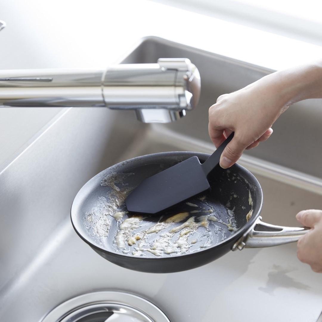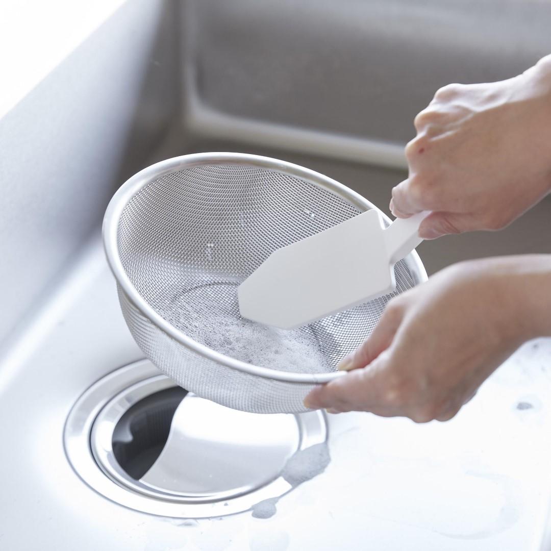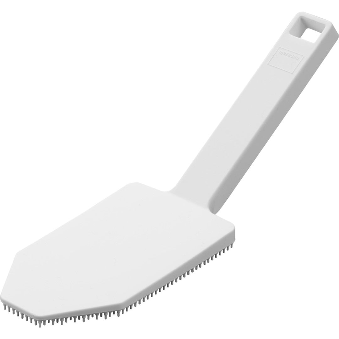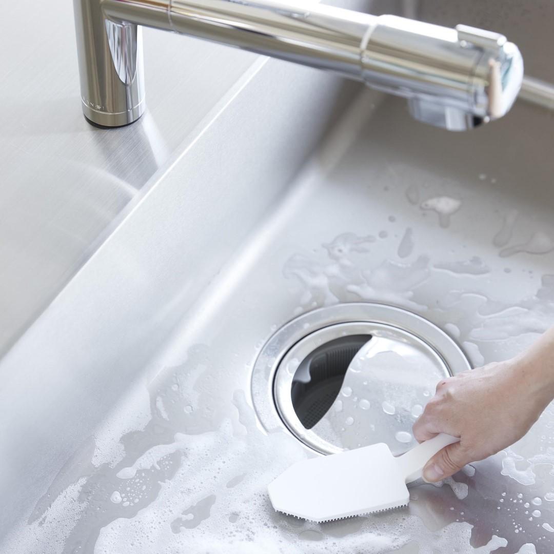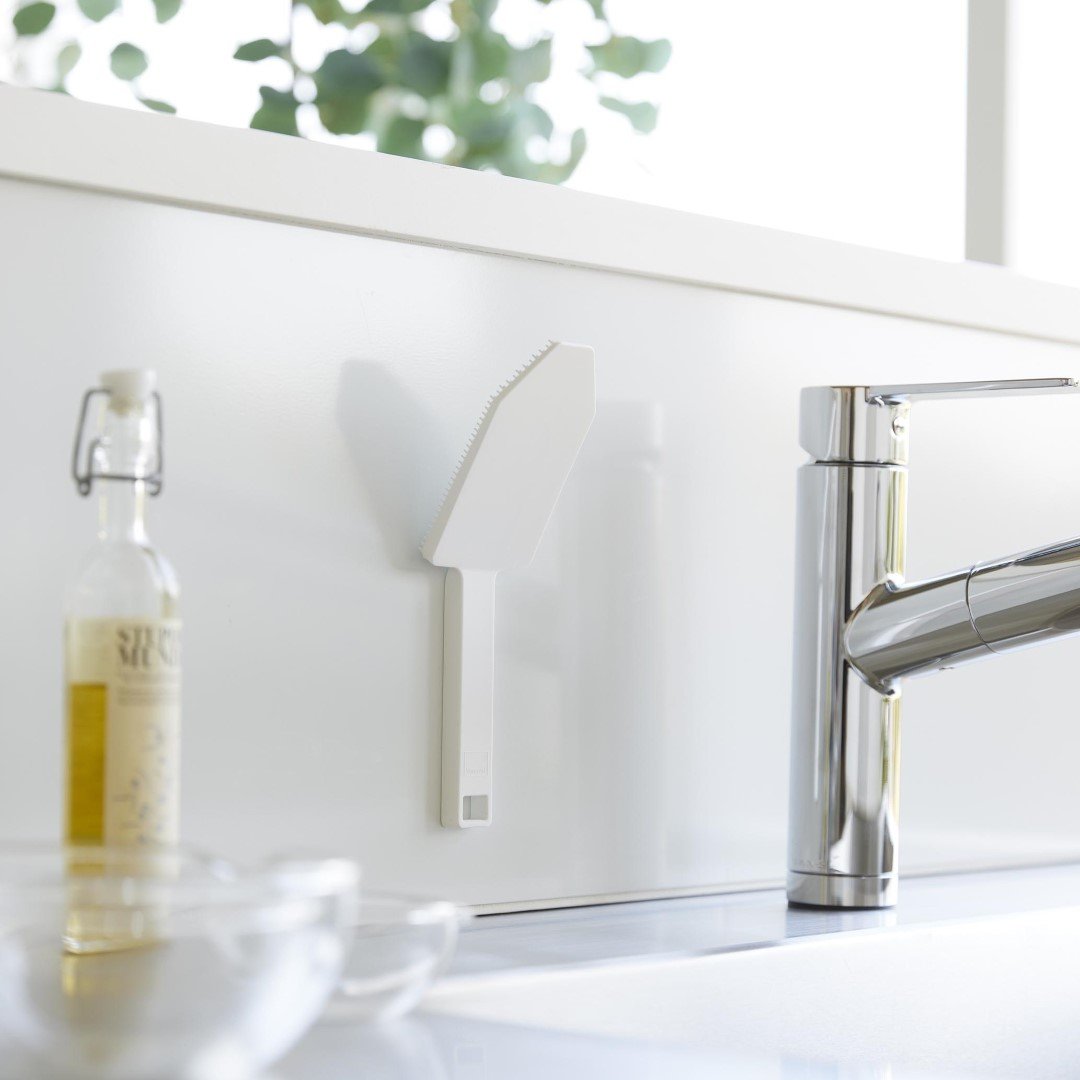 カレー鍋やシンク掃除に。 ハンドル付きで使い勝手◎なブラシ 予洗いに便利なハンドル付きシリコーンスポンジです。食洗機前の食器の汚れや、スポンジを汚したくないカレーやソースの付いた鍋やフライパンに。ハンドル付きなので手荒れが気になる方や、指先をあまり濡らしたくないネイルをしている方にもおすすめです。キッチンにぴったりな、2色のカラーバリエーション カラーは、清潔感のあるホワイト、スタイリッシュなブラックをご用意しました。キッチンに似合うシンプルなモノトーンカラーです。キッチンパネルやワークトップ、お手持ちの調理器具に合わせてお好みのカラーをお選びください。細かいブラシが汚れを徹底的にかき出す ザルの目に詰まった油汚れや食材のカスも、細かいブラシがザルの目に入り込んでスッキリとかき出します。スポンジだけでは取り切れなかった汚れが落ちきってとても気持ちがいいです。汚れが取り切れずにイライラ……なんてことがなくなります。食洗機の使用OKで清潔に使える 食器洗い後のシンク掃除にもご使用いただけます。掃除後は食洗機でお手入れ可能なので、食器洗い・シンク洗い兼用で使っていても気にならず衛生的。食洗機にかける前のお皿の予洗い、カレーやお肉を焼いた後の油分の多いフライパンを洗う際に便利なブラシです。シリコーン製なので油汚れがブラシに残らず使用後もキレイを保てます。マグネット収納で場所を取らない キッチンパネルなどのマグネット対応の壁面に貼り付けられます。すぐに手に取れて使用後もペタッとくっつけるだけ。浮かせて収納できるので水切れが良く、ヌメリ汚れが発生しづらいのがうれしいポイント。