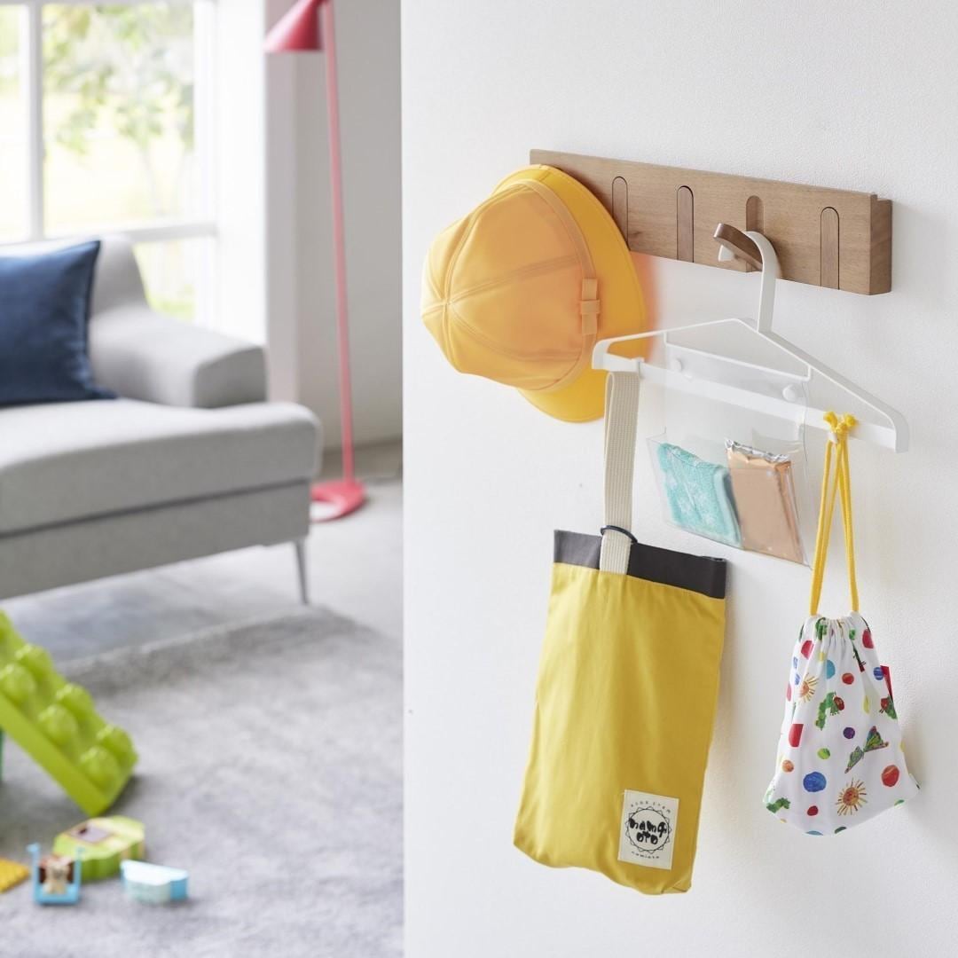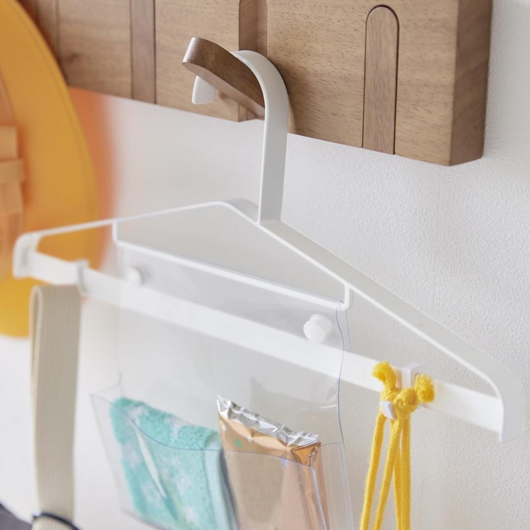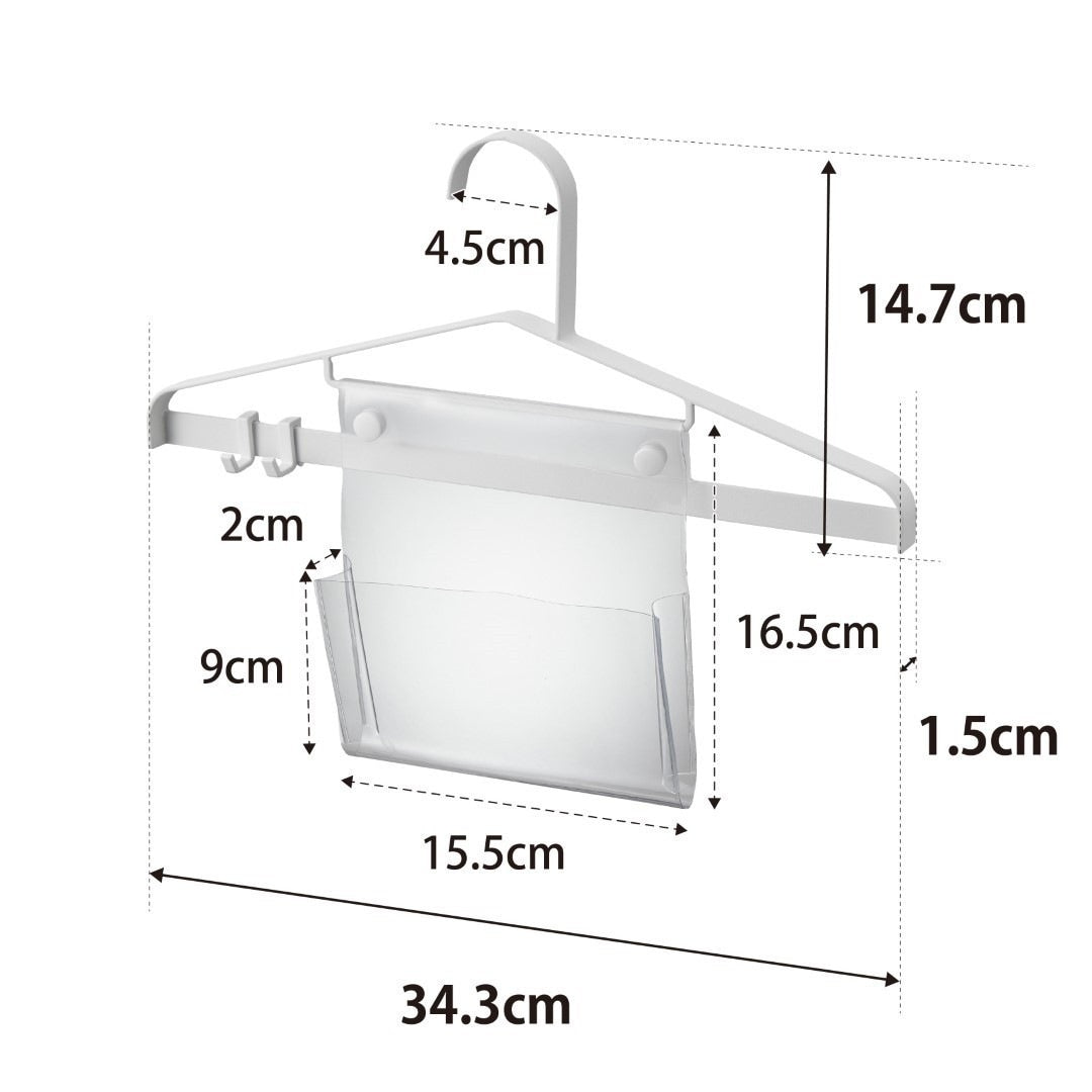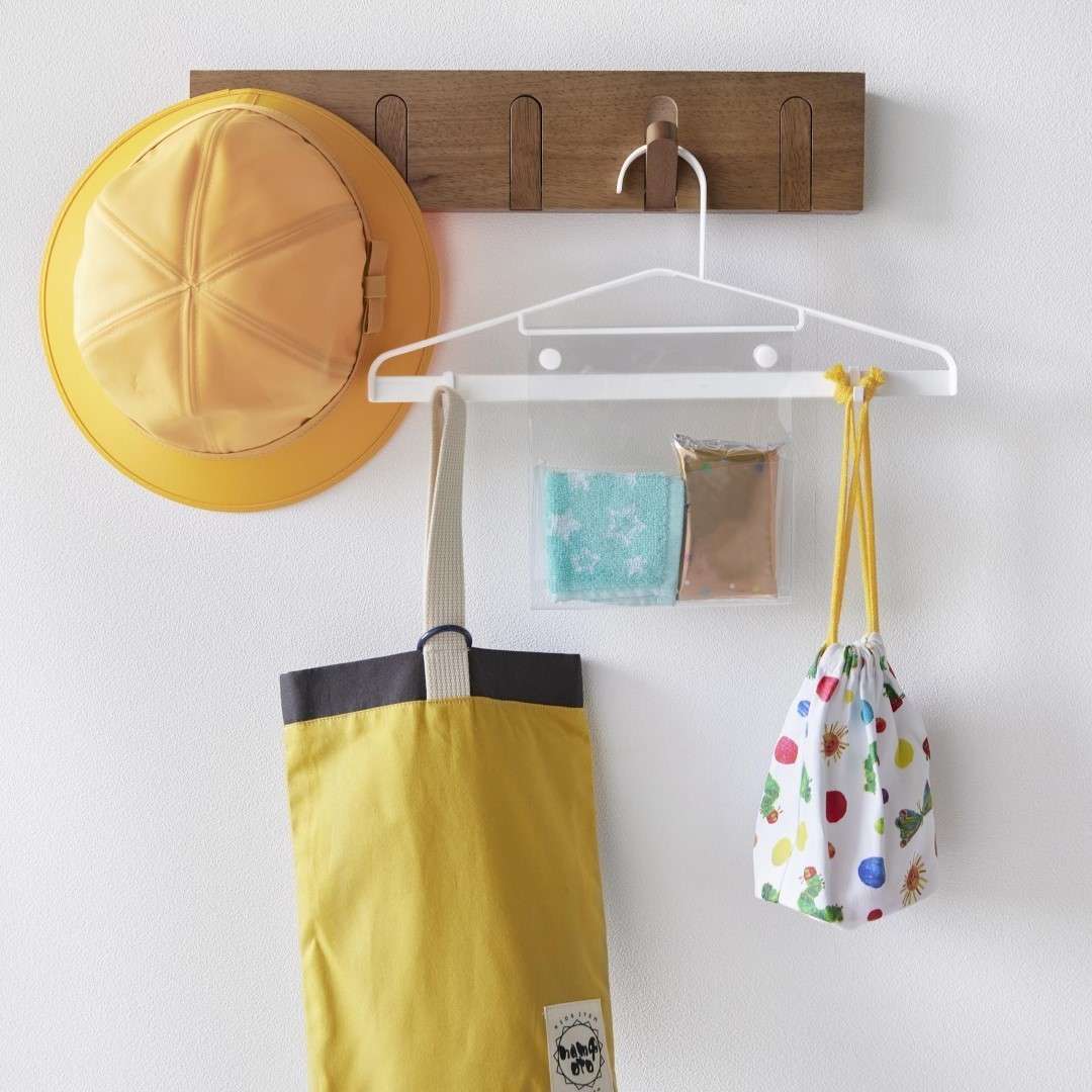 お片付けがそのまま次の日の準備に。 通学やおでかけに必要な持ち物がまとめて掛けられるハンガーです。上着や制服を掛けられるハンガーに、透明ポケットや可動フックがつきました。持ち物がまとめて掛けられるので『明日の準備』の練習にもぴったり。 お子様の成長に合わせてご使用いただけます。生活空間を邪魔しない、2色のカラーバリエーション カラーは、明るい印象のホワイト、スタイリッシュなブラックをご用意しました。シンプルなカラーリングなので、色彩情報が限定されて、お子さまが『翌日の準備品』だけに集中できます。透明ポケットで「○○忘れ」を防止 ハンカチやティッシュなどの小物は透明ポケットに入れておけば持ち忘れを防げます。ポケットが透明なのでハンカチが入ってないと一目でわかり、準備のし忘れにも気が付きやすいです。「ハンカチが入ってない。」とお子さんが自分で気が付けるきっかけにも。カギや巾着は引っ掛けて片付け・準備完了 キーホルダーなどを引っ掛けられる可動式フックは、ハンガーの左右お好きな位置に取り付けが可能です。フック一つにつき耐荷重は250gです。ポーチ代わりの巾着などを引っ掛けておくのにもおすすめです。お子さまの成長をアシストする。 お片付け=明日の準備に 制服でも私服でも、次の日の通園の準備をお片付けハンガーがお手伝い。お子さまが自分で準備・身支度できるようにサポートするアイテムです。最初はお母さんやお父さんと一緒に準備。慣れてきたら徐々に一人で準備できるように練習です。