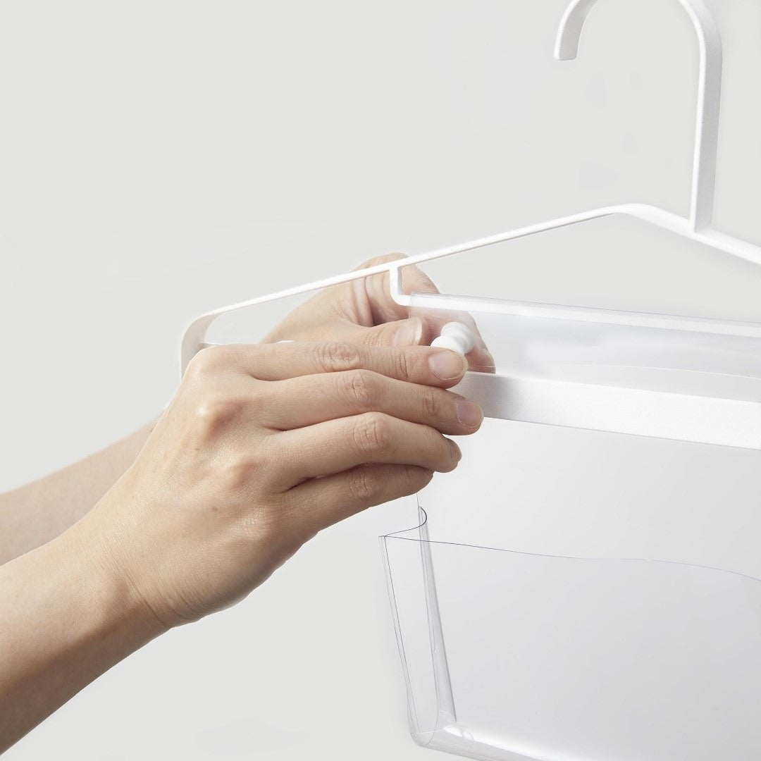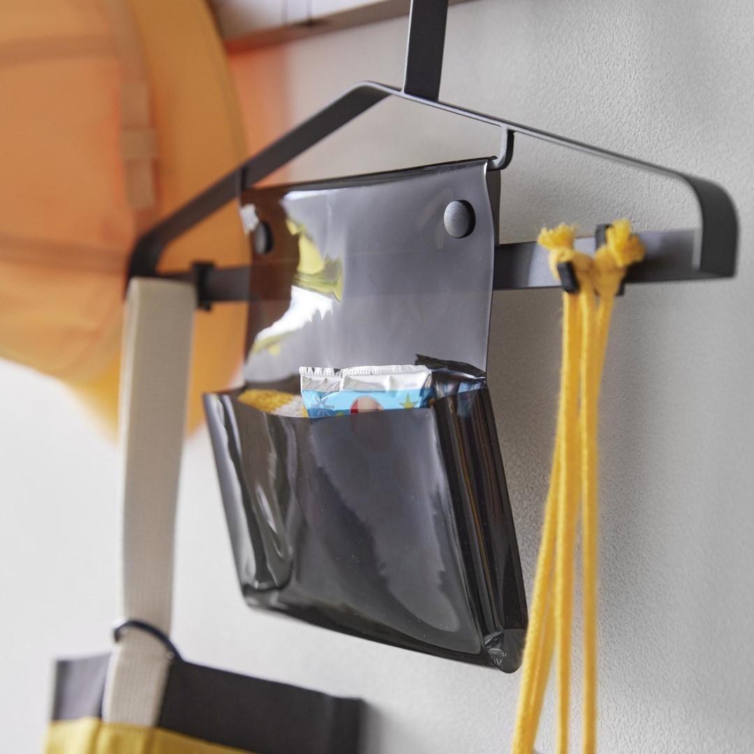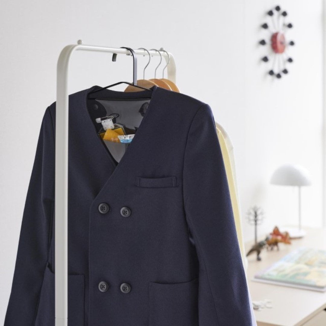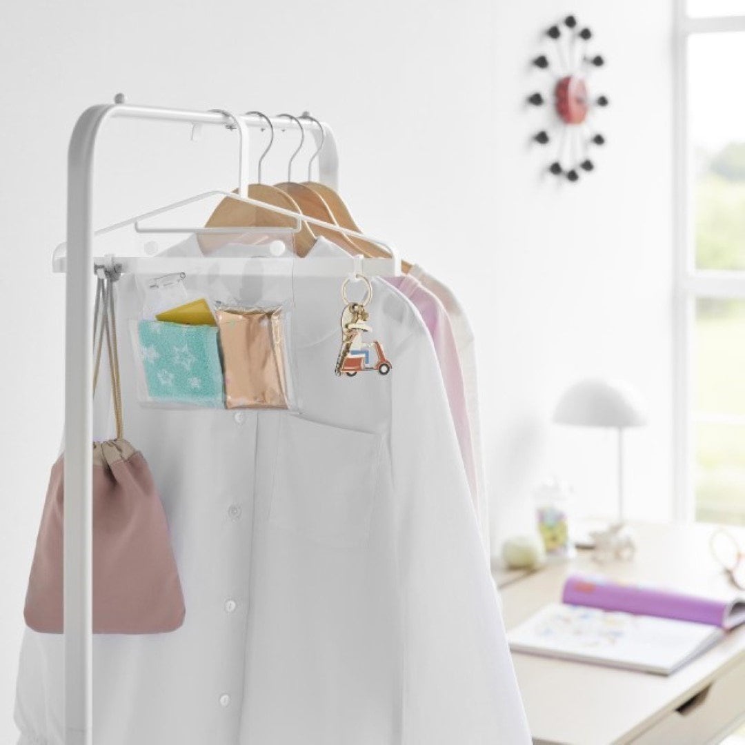 お片付けがそのまま次の日の準備に。 通学やおでかけに必要な持ち物がまとめて掛けられるハンガーです。上着や制服を掛けられるハンガーに、透明ポケットや可動フックがつきました。持ち物がまとめて掛けられるので『明日の準備』の練習にもぴったり。 お子様の成長に合わせてご使用いただけます。生活空間を邪魔しない、2色のカラーバリエーション カラーは、明るい印象のホワイト、スタイリッシュなブラックをご用意しました。シンプルなカラーリングなので、色彩情報が限定されて、お子さまが『翌日の準備品』だけに集中できます。透明ポケットで「○○忘れ」を防止 ハンカチやティッシュなどの小物は透明ポケットに入れておけば持ち忘れを防げます。ポケットが透明なのでハンカチが入ってないと一目でわかり、準備のし忘れにも気が付きやすいです。「ハンカチが入ってない。」とお子さんが自分で気が付けるきっかけにも。カギや巾着は引っ掛けて片付け・準備完了 キーホルダーなどを引っ掛けられる可動式フックは、ハンガーの左右お好きな位置に取り付けが可能です。フック一つにつき耐荷重は250gです。ポーチ代わりの巾着などを引っ掛けておくのにもおすすめです。お子さまの成長をアシストする。 お片付け=明日の準備に 制服でも私服でも、次の日の通園の準備をお片付けハンガーがお手伝い。お子さまが自分で準備・身支度できるようにサポートするアイテムです。最初はお母さんやお父さんと一緒に準備。慣れてきたら徐々に一人で準備できるように練習です。