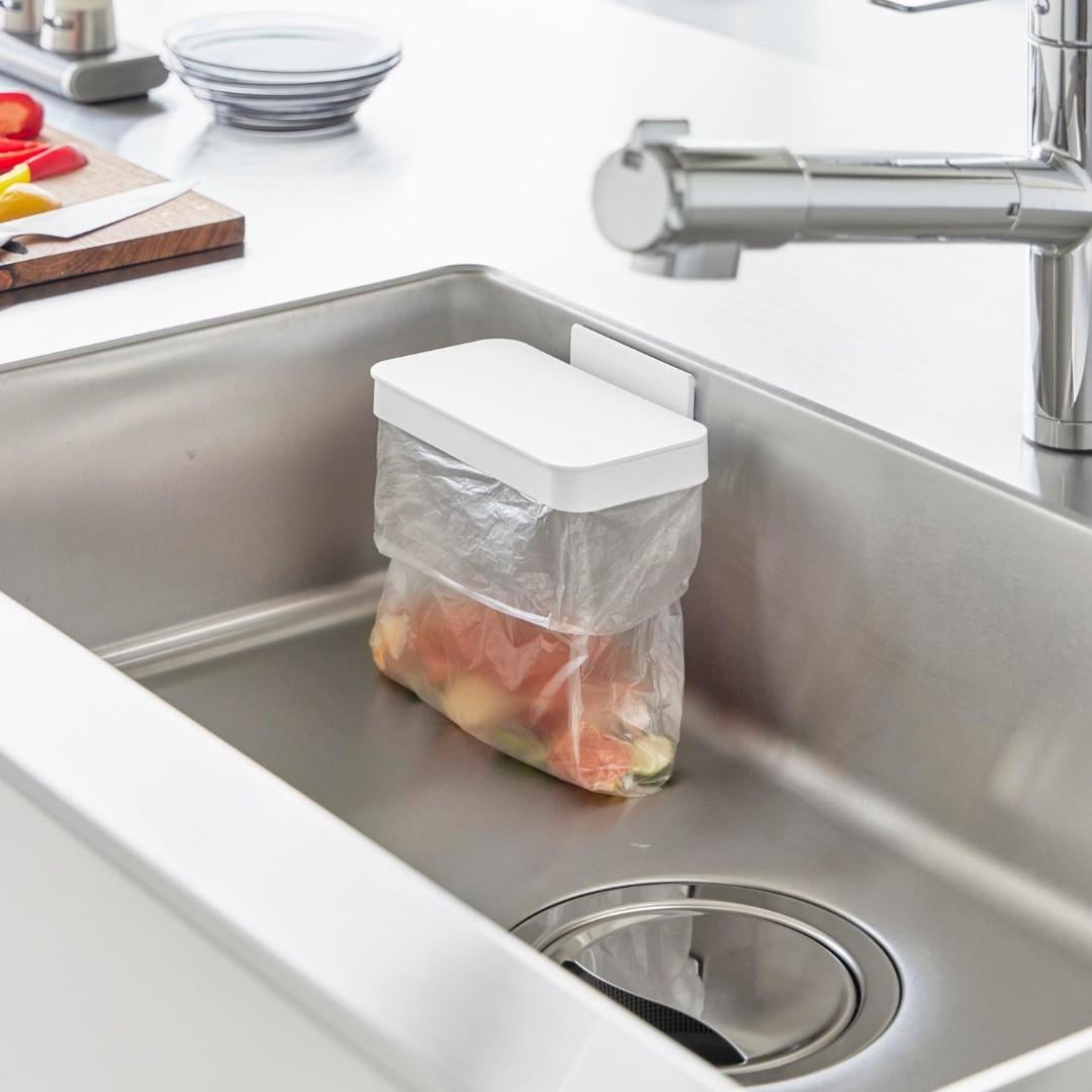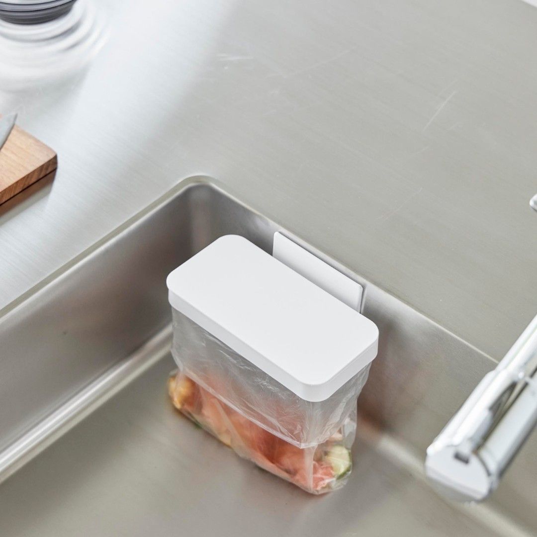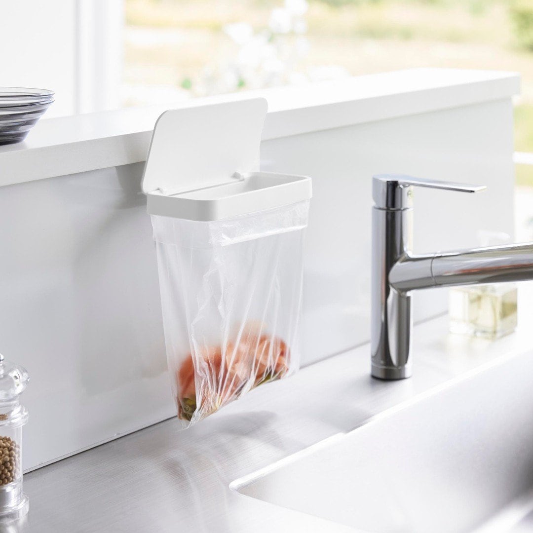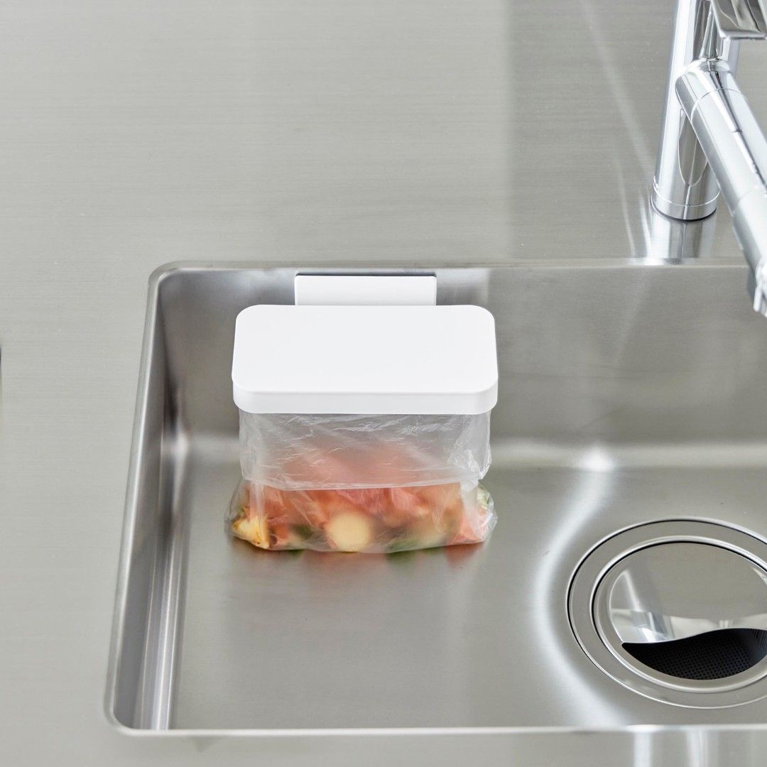 片手で簡単開閉。マグネットで取り付けできる蓋付きポリ袋ホルダー今までのポリ袋ホルダーはゴミが見えるものが多かったですが、これは蓋付きだから上からゴミが見えない。蓋は片手で簡単に開閉できるから使い勝手もグッド。シンク中で使用すれば、野菜くずなどを楽に捨てることができます。どの空間にもに馴染みやすい、2色のカラーバリエーションカラーは、ホワイト・ブラックの2色。どんな空間ともなじみがいい、シンプルなモノトーンカラー。お好みの色を選んでくださいね。蓋付きで、見た目&機能的にも清潔感UP。生ごみがむき出しだと見た目が悪いですよね…。でもこれは蓋ができるから見た目スッキリ。それに、嫌な臭いを軽減できたり、虫の侵入も防ぐことができます。パパッと取り換え完了ポリ袋を掛けたら上から、蓋をはめるだけの簡単取り付け。取り外す時は、蓋を外し手前から袋を引き出すだけ。取り換えに手間が掛からないので、「購入してみたものの面倒でそのうち使わなくなった」ということが起こりにくい。使い勝手がいい場所でゴミ捨てできるシンク内はもちろん、マグネットが付く平面なら設置可能なので、様々な場所が設置候補に◎何度も貼り付け直せるから、使い続けていくうちに、使いやすい場所を探していきましょう。