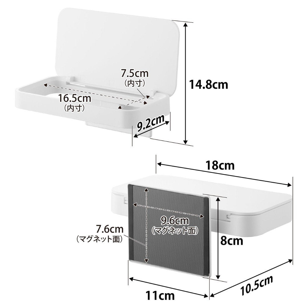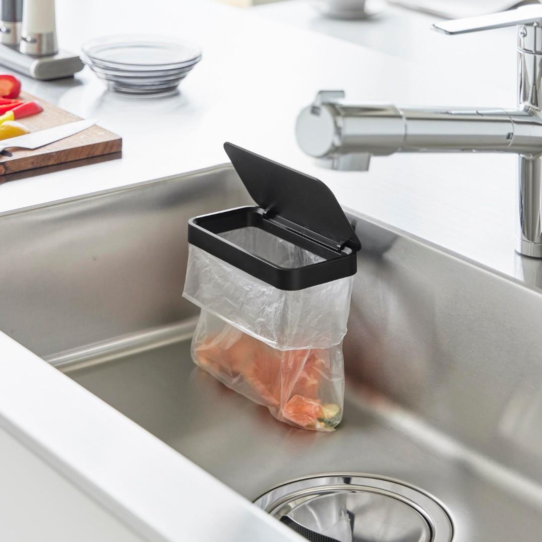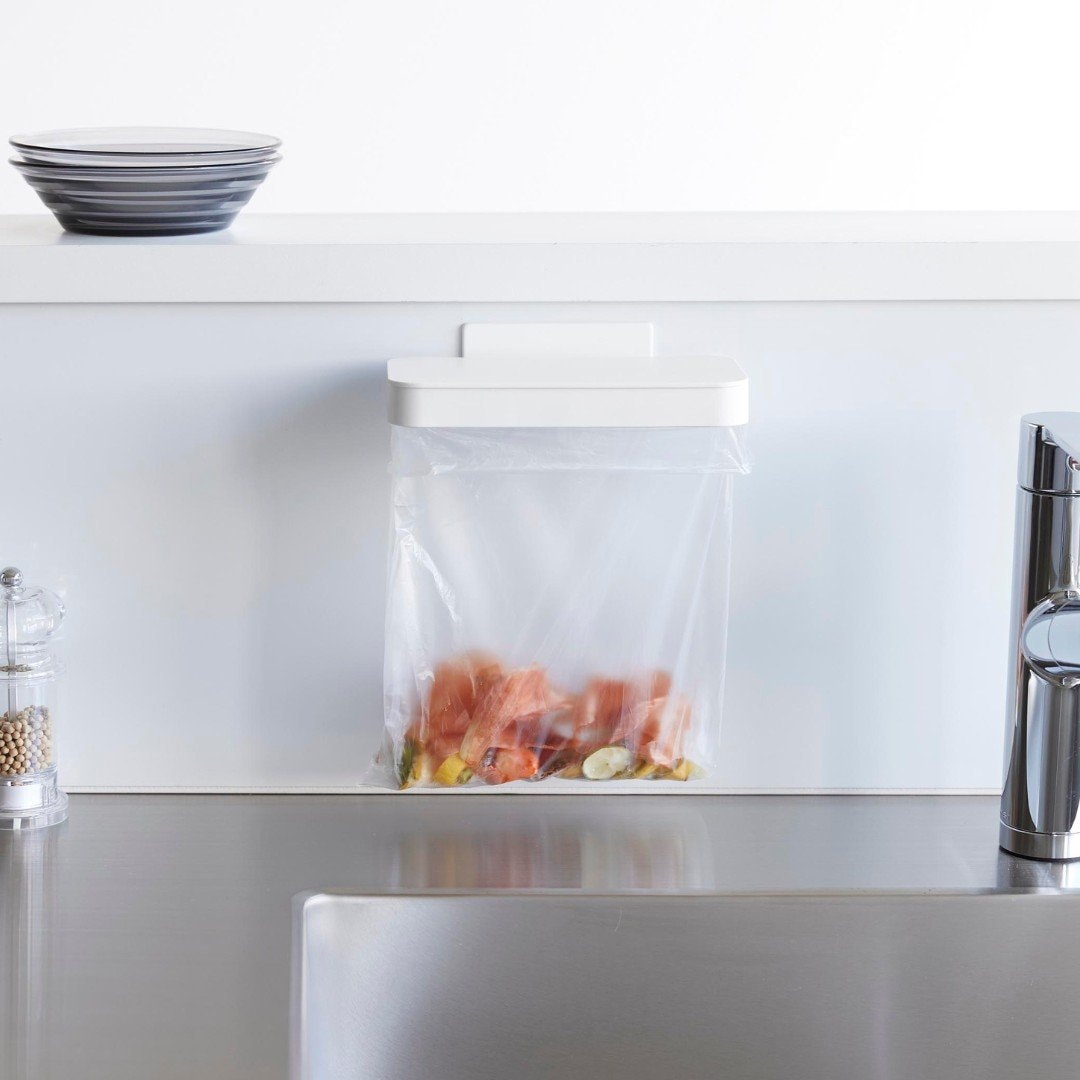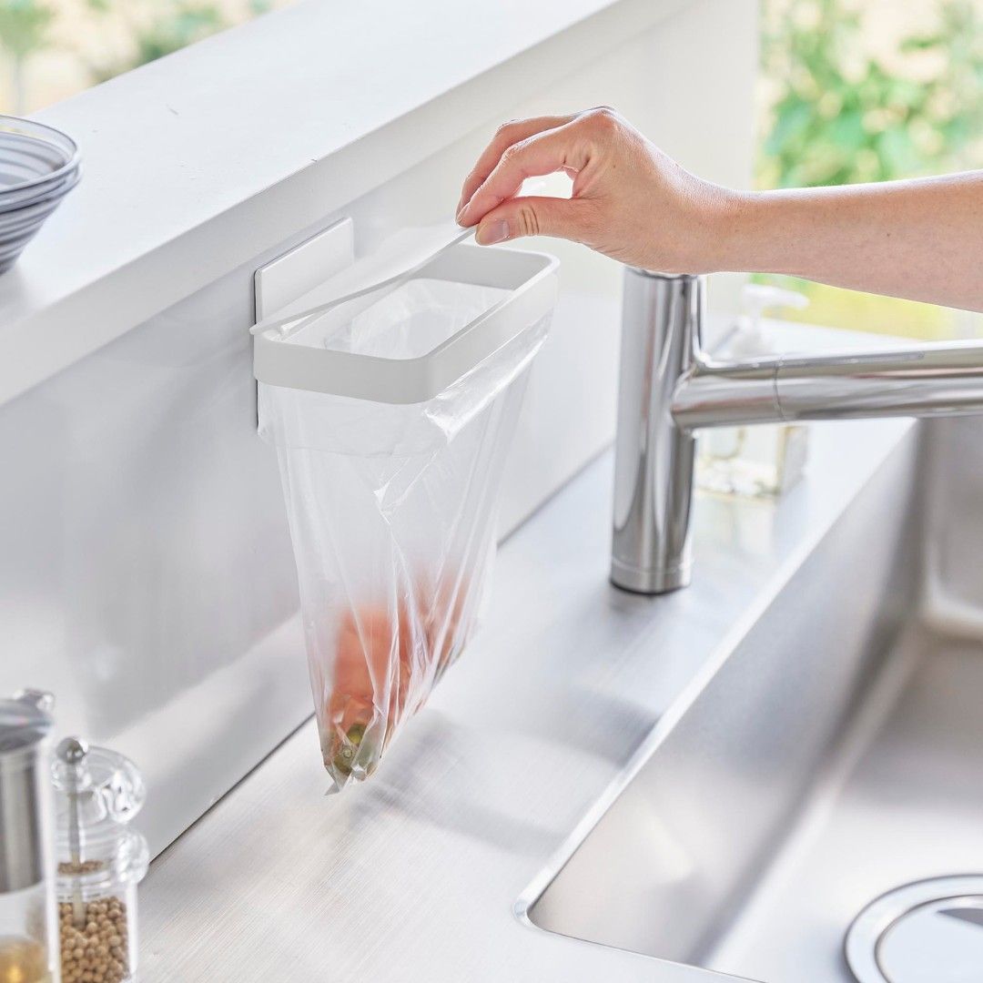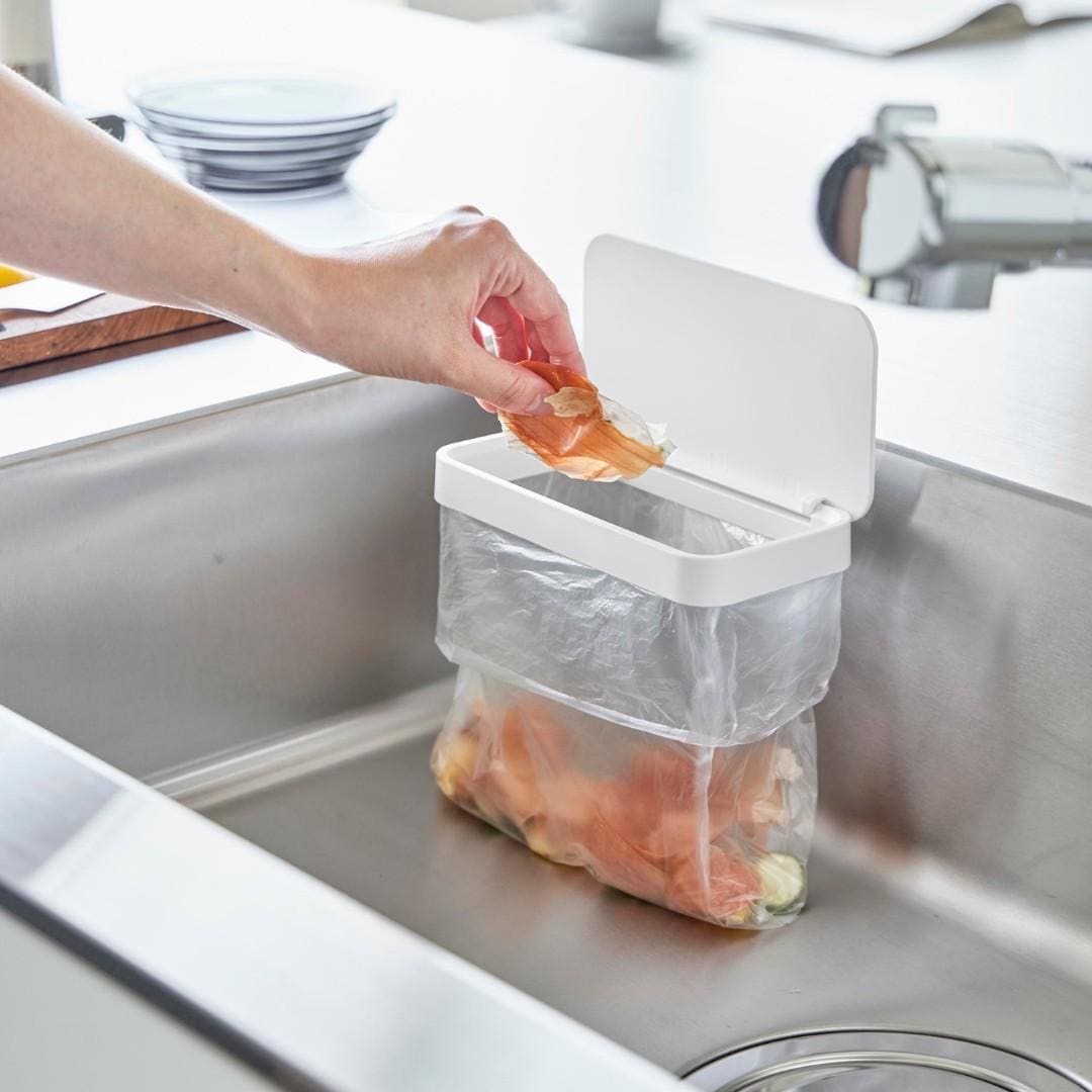 片手で簡単開閉。マグネットで取り付けできる蓋付きポリ袋ホルダー今までのポリ袋ホルダーはゴミが見えるものが多かったですが、これは蓋付きだから上からゴミが見えない。蓋は片手で簡単に開閉できるから使い勝手もグッド。シンク中で使用すれば、野菜くずなどを楽に捨てることができます。どの空間にもに馴染みやすい、2色のカラーバリエーションカラーは、ホワイト・ブラックの2色。どんな空間ともなじみがいい、シンプルなモノトーンカラー。お好みの色を選んでくださいね。蓋付きで、見た目&機能的にも清潔感UP。生ごみがむき出しだと見た目が悪いですよね…。でもこれは蓋ができるから見た目スッキリ。それに、嫌な臭いを軽減できたり、虫の侵入も防ぐことができます。パパッと取り換え完了ポリ袋を掛けたら上から、蓋をはめるだけの簡単取り付け。取り外す時は、蓋を外し手前から袋を引き出すだけ。取り換えに手間が掛からないので、「購入してみたものの面倒でそのうち使わなくなった」ということが起こりにくい。使い勝手がいい場所でゴミ捨てできるシンク内はもちろん、マグネットが付く平面なら設置可能なので、様々な場所が設置候補に◎何度も貼り付け直せるから、使い続けていくうちに、使いやすい場所を探していきましょう。