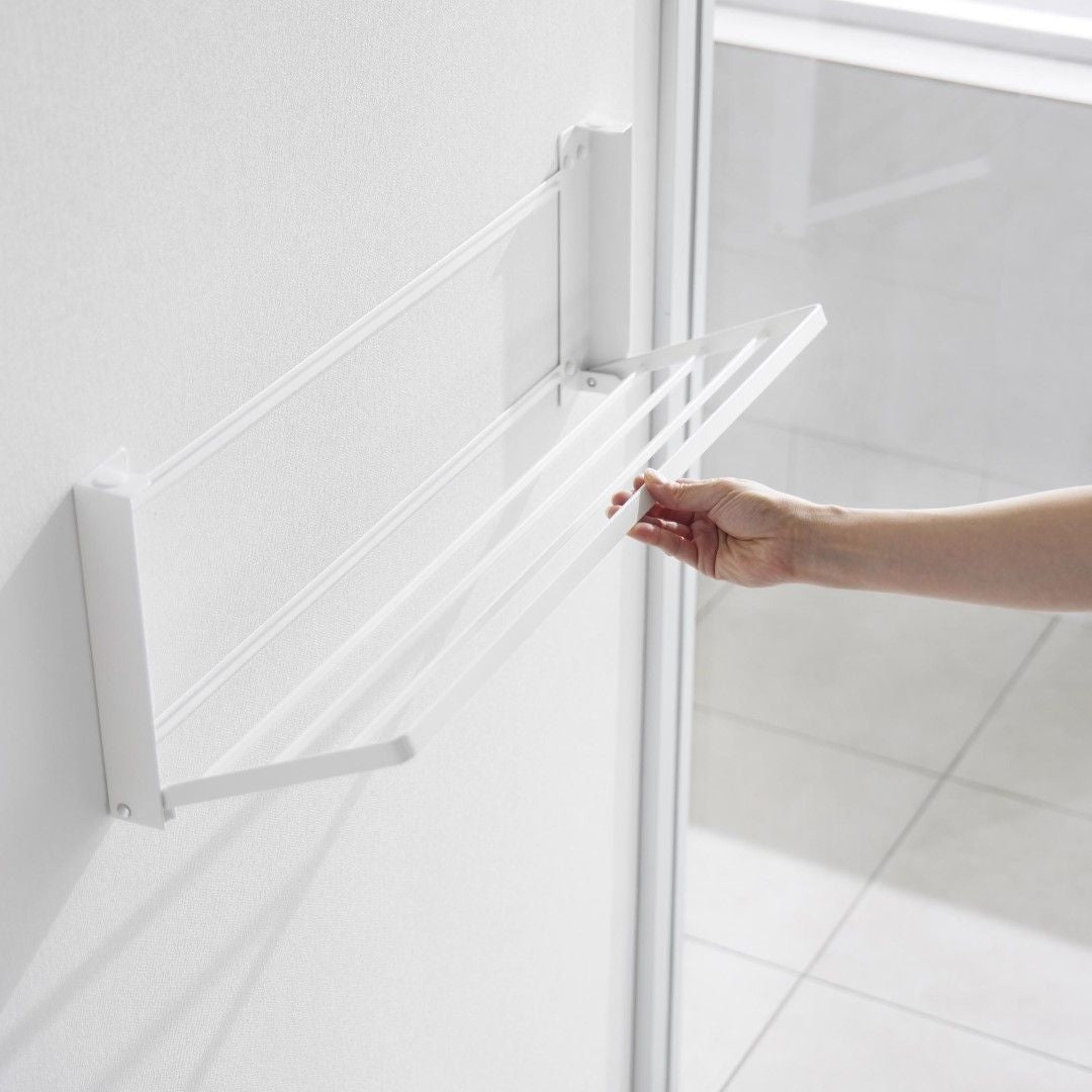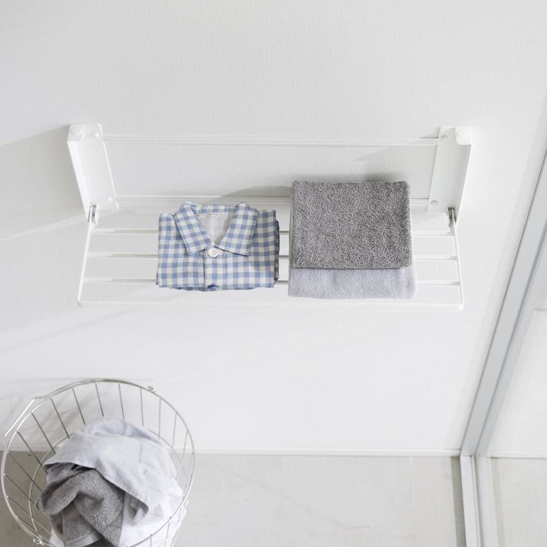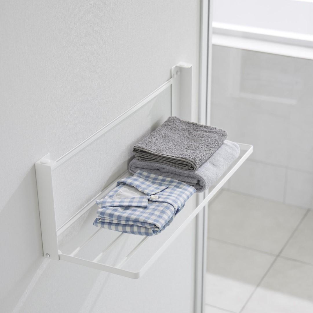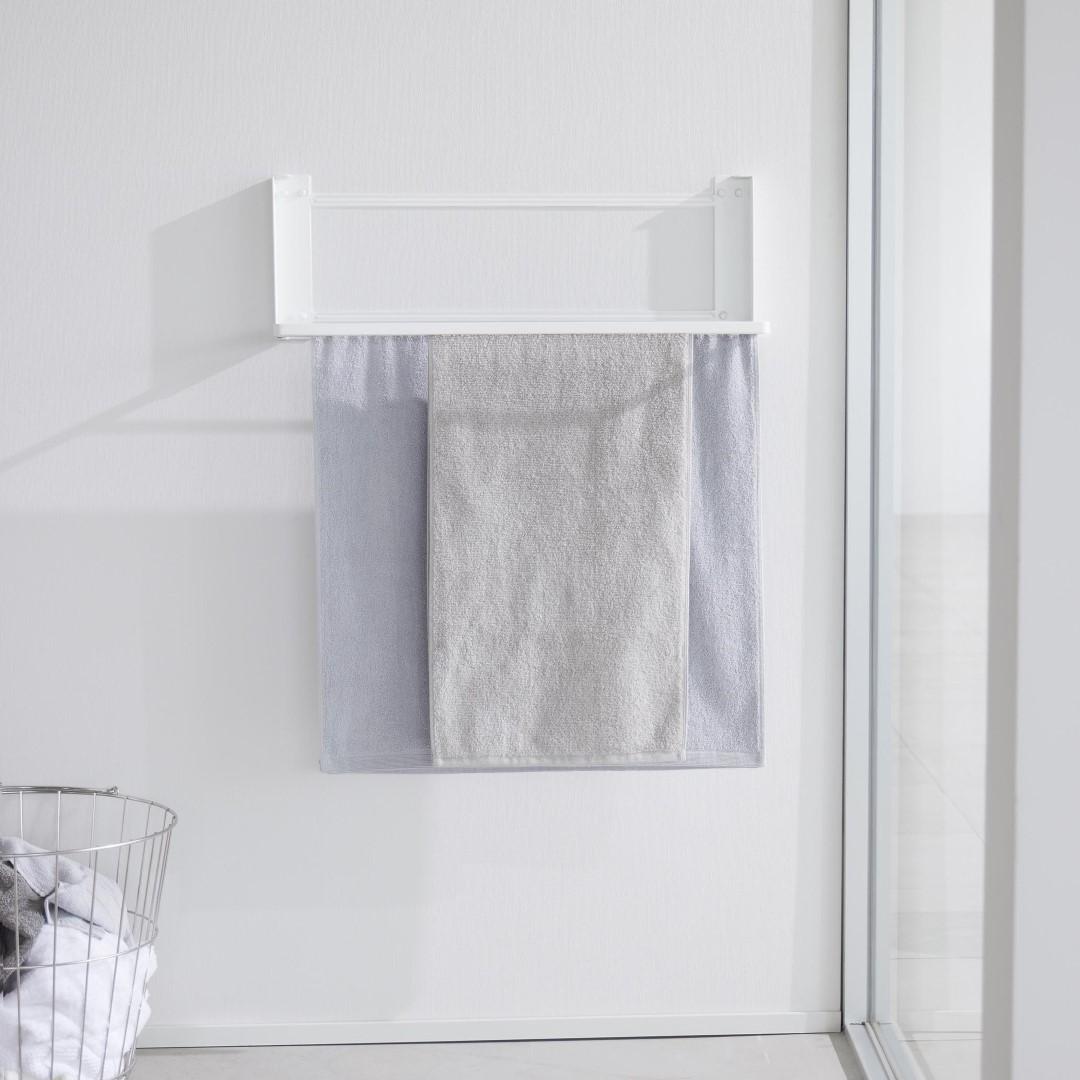 畳めばスリム化。 ワイドサイズバスタオルが干せる 65.5cmのワイドサイズでバスタオルも干せる、折り畳みラックです。使いたい時にサッと使え、使わない時は折り畳んで奥行き4cmになるスリム設計。バスタオルや着替えの一時置きにも◎。※ハンガーや服のサイズ等で壁面に触れる事があります。バスルームにマッチする、2色のカラーバリエーション カラーは、明るい印象のホワイト、スタイリッシュなブラックをご用意しました。どのお家の洗面所にもなじみやすいシンプルなモノトーンカラーです。壁紙の色、お持ちのタオル類の色などに合わせてお好みのカラーをお選びください。タオル掛け、着替えの一時置きに シャワーを浴びたあとは、バスタオルやフェイスタオル、足拭きマットを掛けてササッと干せちゃいます。シャワー中には部屋から持ってきた着替えの一時置きとしても活躍。スマートフォンを置いておけば、大事な電話もすぐに取れます。洋服や下着の室内干しにも使える スリット部にハンガーのフックを引っ掛けて、洗濯物の室内干しエリアとしてもお使いいただけます。上部にはピンチや洗濯物ネットを入れたバスケットを置いておいても◎。洗濯物が乾いたらまとめて片づけて、ラックは折り畳んでスリムに収納できます。壁の穴が目立ちにくい石こうボードピン取り付け 石こうボードピンで設置するので、取り外したときに壁の穴が目立ちにくいのがうれしいポイント。大きな力は必要なく、コインを使って取り付けベースを設置したら本体を差し込むだけ。女性でも簡単に取り付けが完了します。付属の木ネジを使えば柱や板壁に取り付けることも可能です。