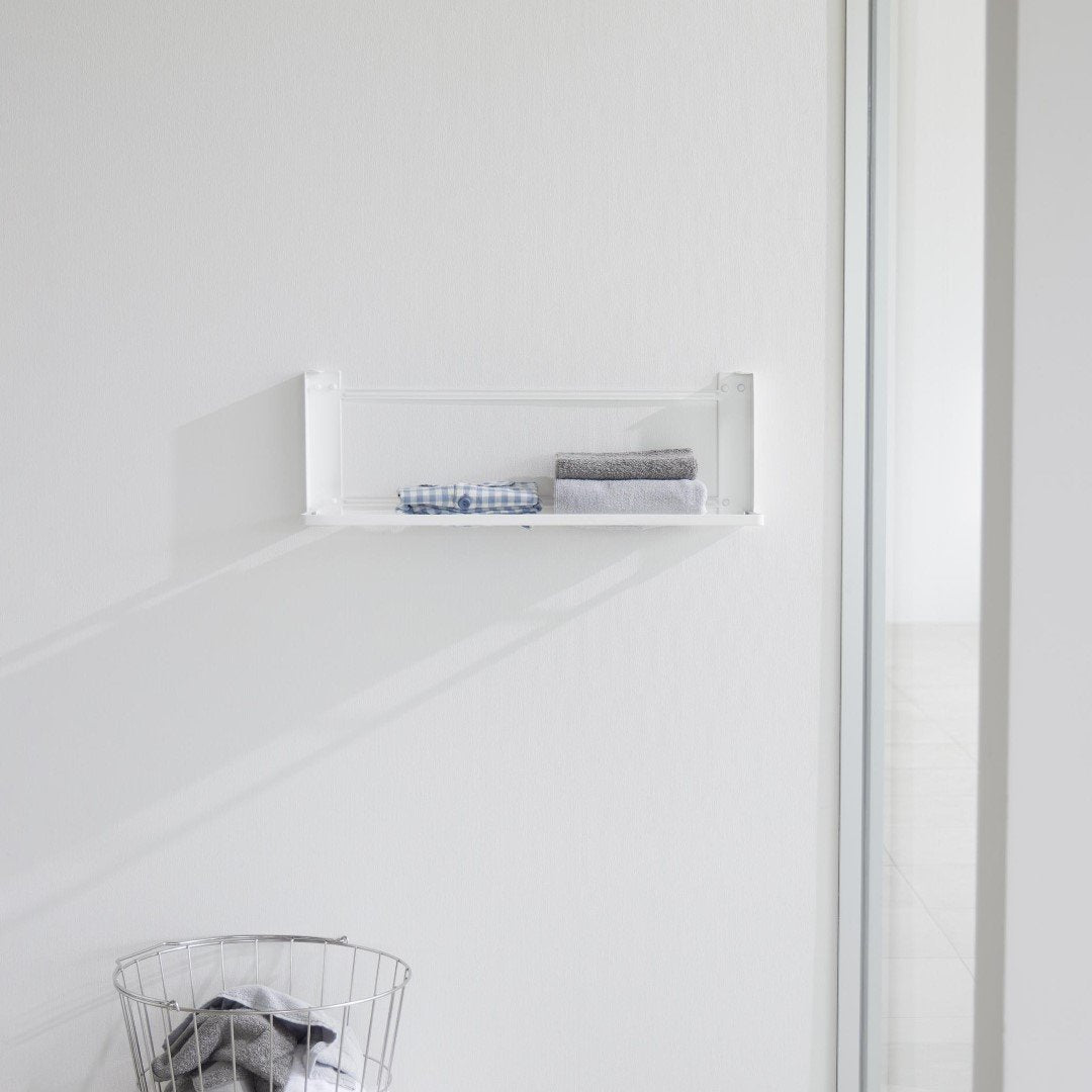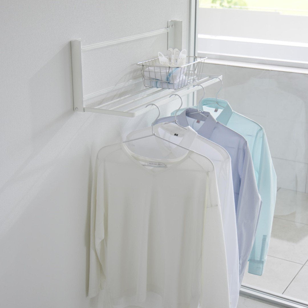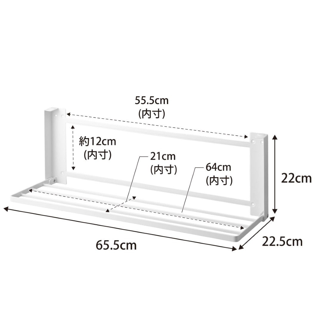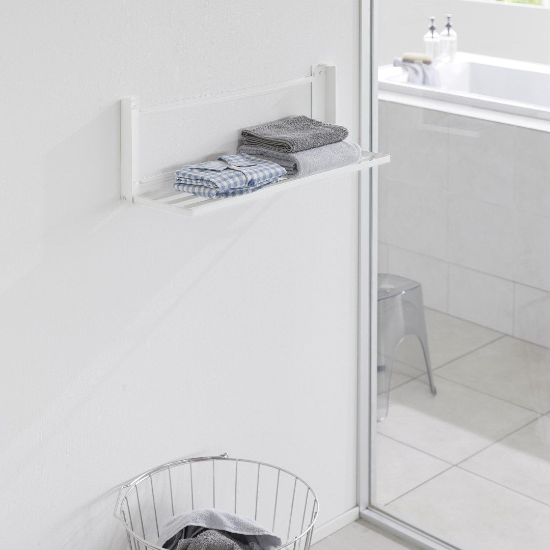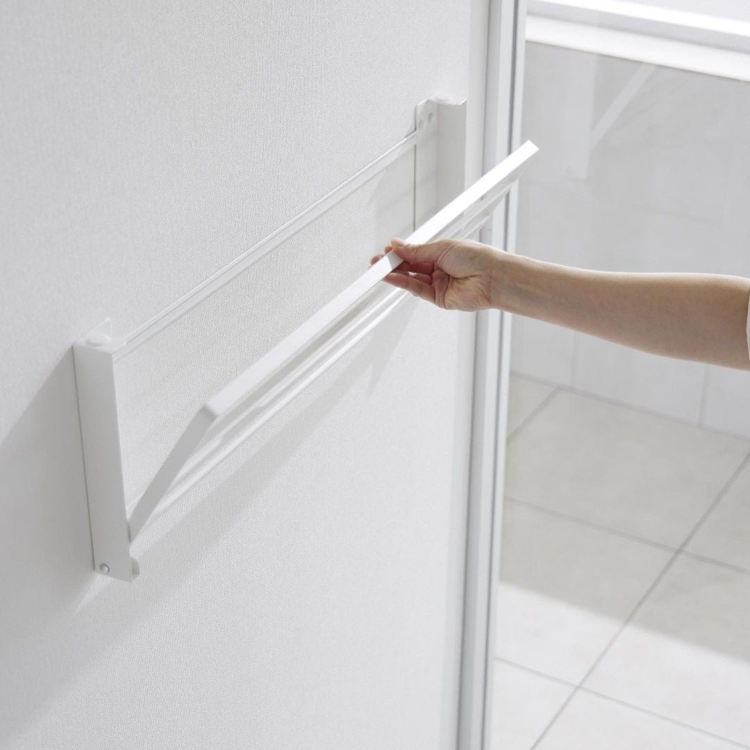 畳めばスリム化。 ワイドサイズバスタオルが干せる 65.5cmのワイドサイズでバスタオルも干せる、折り畳みラックです。使いたい時にサッと使え、使わない時は折り畳んで奥行き4cmになるスリム設計。バスタオルや着替えの一時置きにも◎。※ハンガーや服のサイズ等で壁面に触れる事があります。バスルームにマッチする、2色のカラーバリエーション カラーは、明るい印象のホワイト、スタイリッシュなブラックをご用意しました。どのお家の洗面所にもなじみやすいシンプルなモノトーンカラーです。壁紙の色、お持ちのタオル類の色などに合わせてお好みのカラーをお選びください。タオル掛け、着替えの一時置きに シャワーを浴びたあとは、バスタオルやフェイスタオル、足拭きマットを掛けてササッと干せちゃいます。シャワー中には部屋から持ってきた着替えの一時置きとしても活躍。スマートフォンを置いておけば、大事な電話もすぐに取れます。洋服や下着の室内干しにも使える スリット部にハンガーのフックを引っ掛けて、洗濯物の室内干しエリアとしてもお使いいただけます。上部にはピンチや洗濯物ネットを入れたバスケットを置いておいても◎。洗濯物が乾いたらまとめて片づけて、ラックは折り畳んでスリムに収納できます。壁の穴が目立ちにくい石こうボードピン取り付け 石こうボードピンで設置するので、取り外したときに壁の穴が目立ちにくいのがうれしいポイント。大きな力は必要なく、コインを使って取り付けベースを設置したら本体を差し込むだけ。女性でも簡単に取り付けが完了します。付属の木ネジを使えば柱や板壁に取り付けることも可能です。