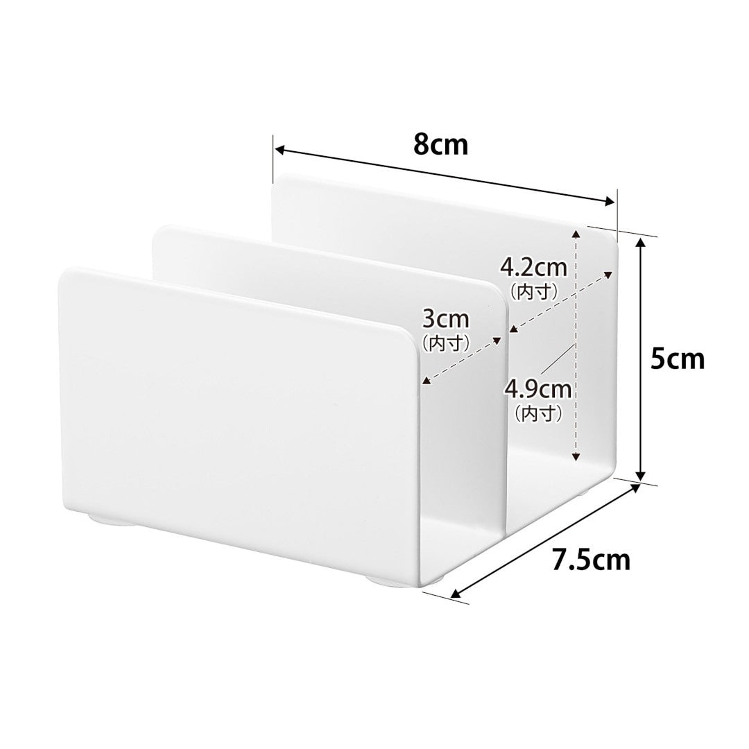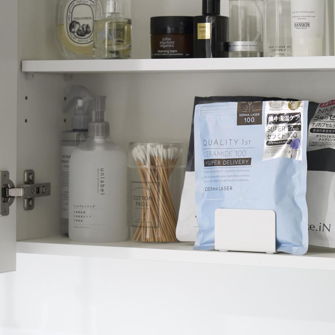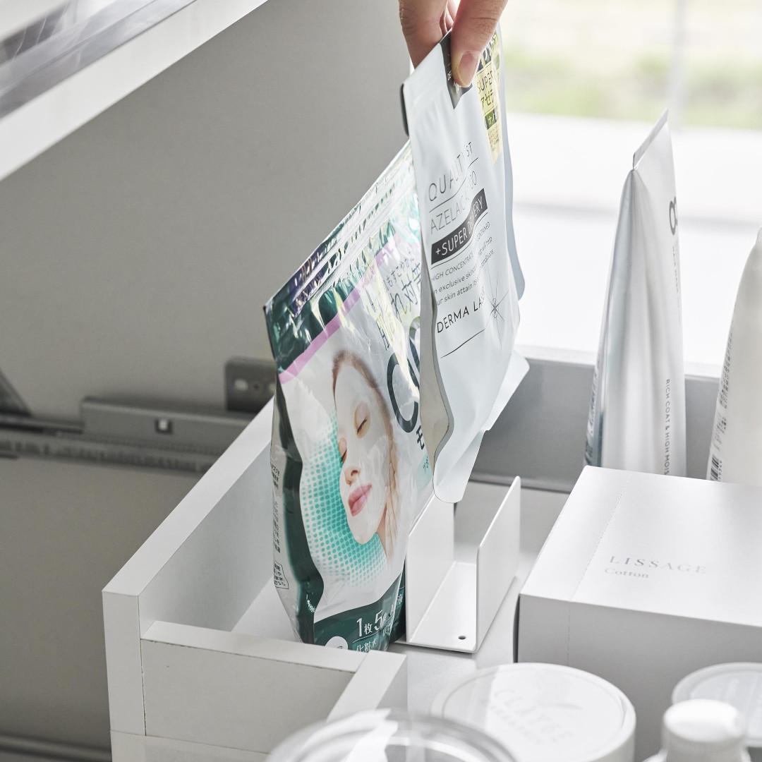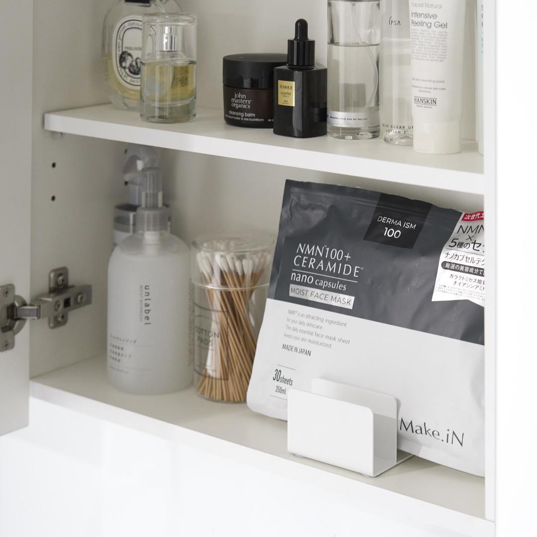 縦置きさせて洗面所を整理整頓自立しない袋入りのフェイスマスクを立てて収納できる仕切り付きスタンドです。二種類のマスクを仕切って収納できるから手に取りやすくて便利。一枚入りの使い切りマスクなどは一つの仕切りの中に複数個収納することが可能です。パッケージが映える、2色のカラーバリエーションカラーは、清潔感のあるホワイト、スタイリッシュなブラックをご用意しました。フェイスマスクのパッケージが映えるシンプルなモノトーンカラーです。洗面所の雰囲気やお手持ちの美容小物に合わせてお好みのカラーをお選びください。内容量に合わせて収納できる仕切り前後で奥行きが異なるように仕切りが配置されているため、内容量に合わせて二種類のマスクをまとめて収納することが可能です。朝用/夜用、保湿力の高いもの/ブライトニング効果が高いもの、などシーンや肌の状態に合わせてマスクを使い分けている方にもおすすめ。鏡裏収納に収まるコンパクトさ♪洗面鏡中の収納スペースに置けるよう、奥行き7.5cmのコンパクトなサイズ感で設計されました。寝かせて収納するしかなかったフェイスマスクも自立させれば他の基礎化粧品と一緒に収納ができて使い勝手がUP。引き出し収納派の整理にも引き出し収納や、ドレッサーの上に立てて収納するのにもお使いいただけます。上に積み重ねて収納していると、使用頻度の低いマスクの存在感が薄れてしまいますが、立てて収納ならすべてのマスクがパッと目に入るので忘れるのを防げます。