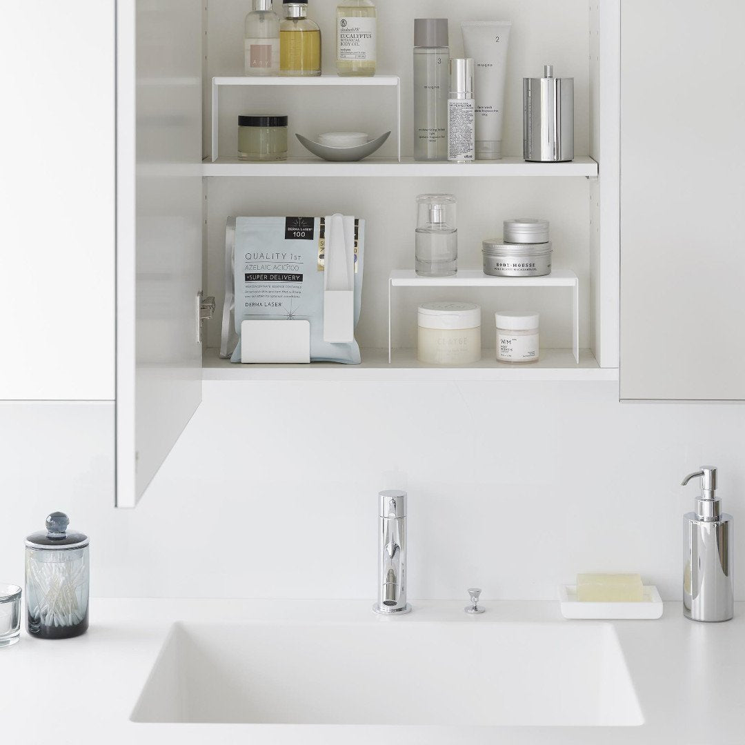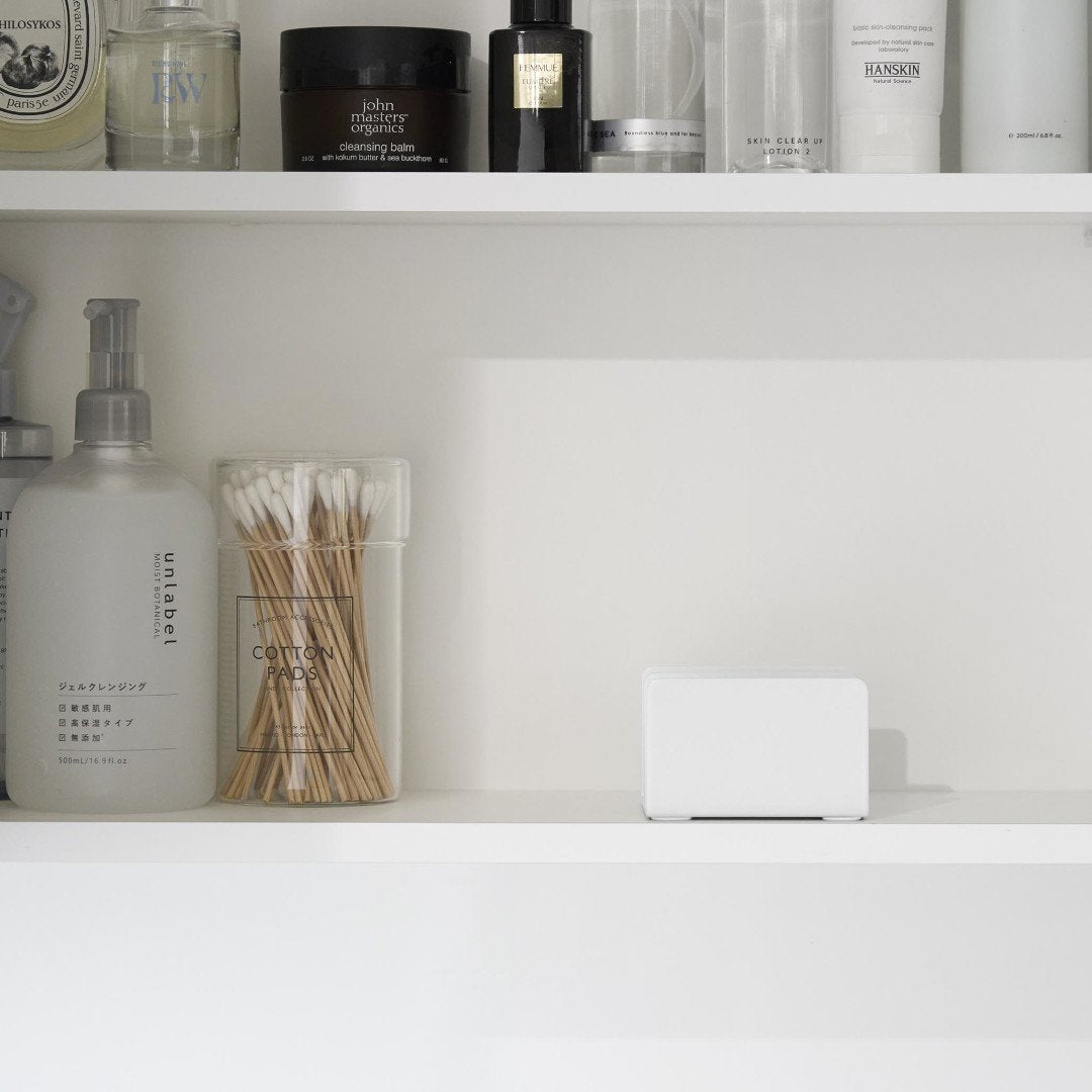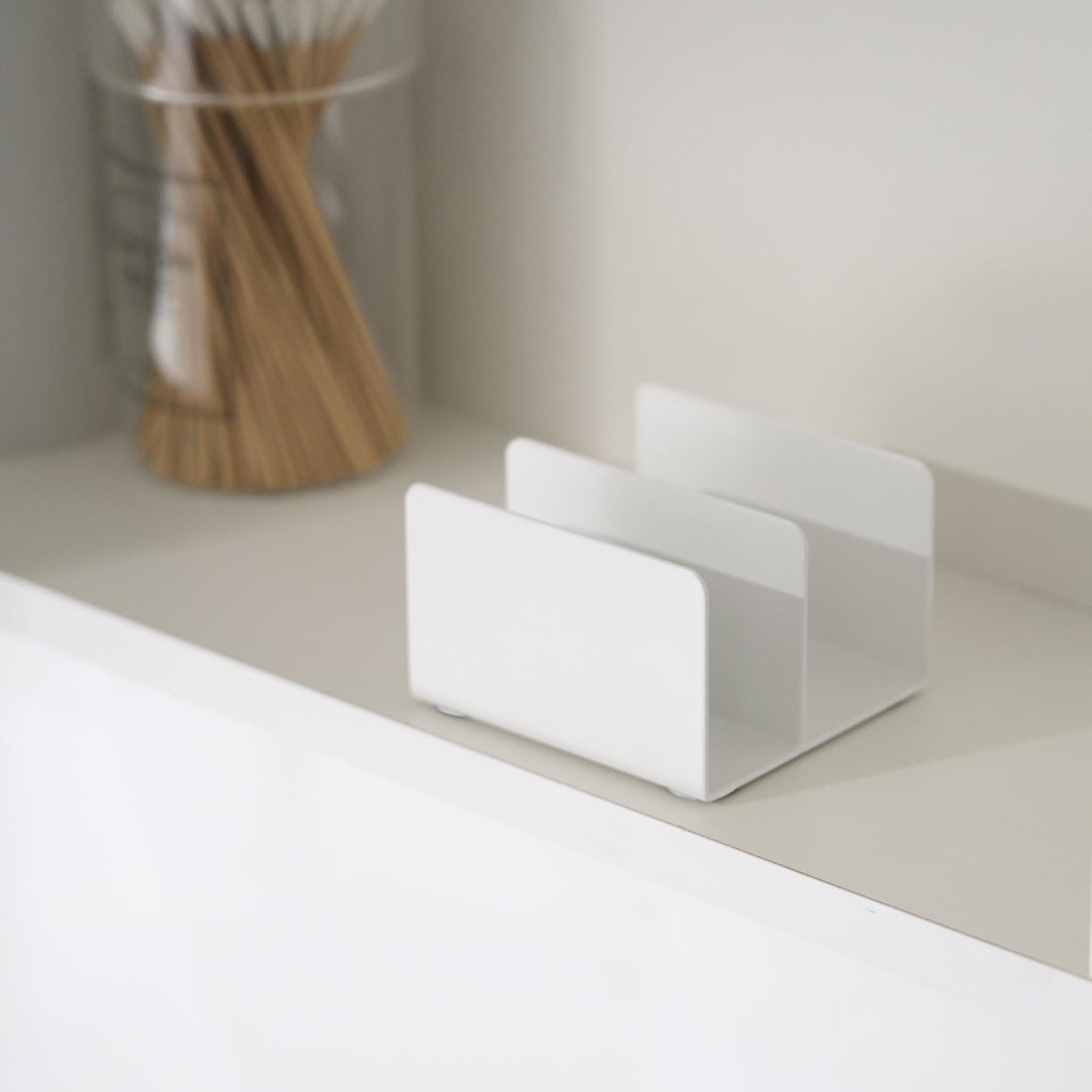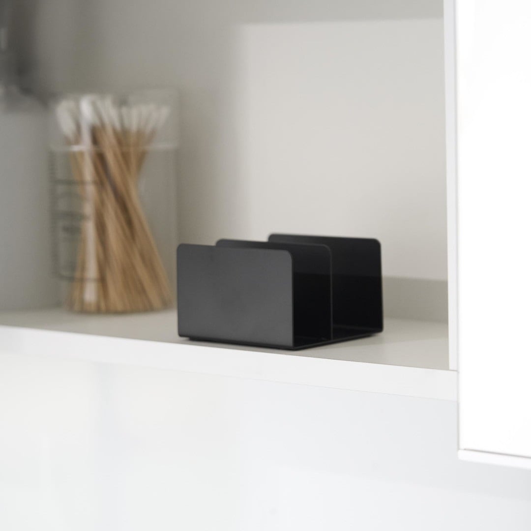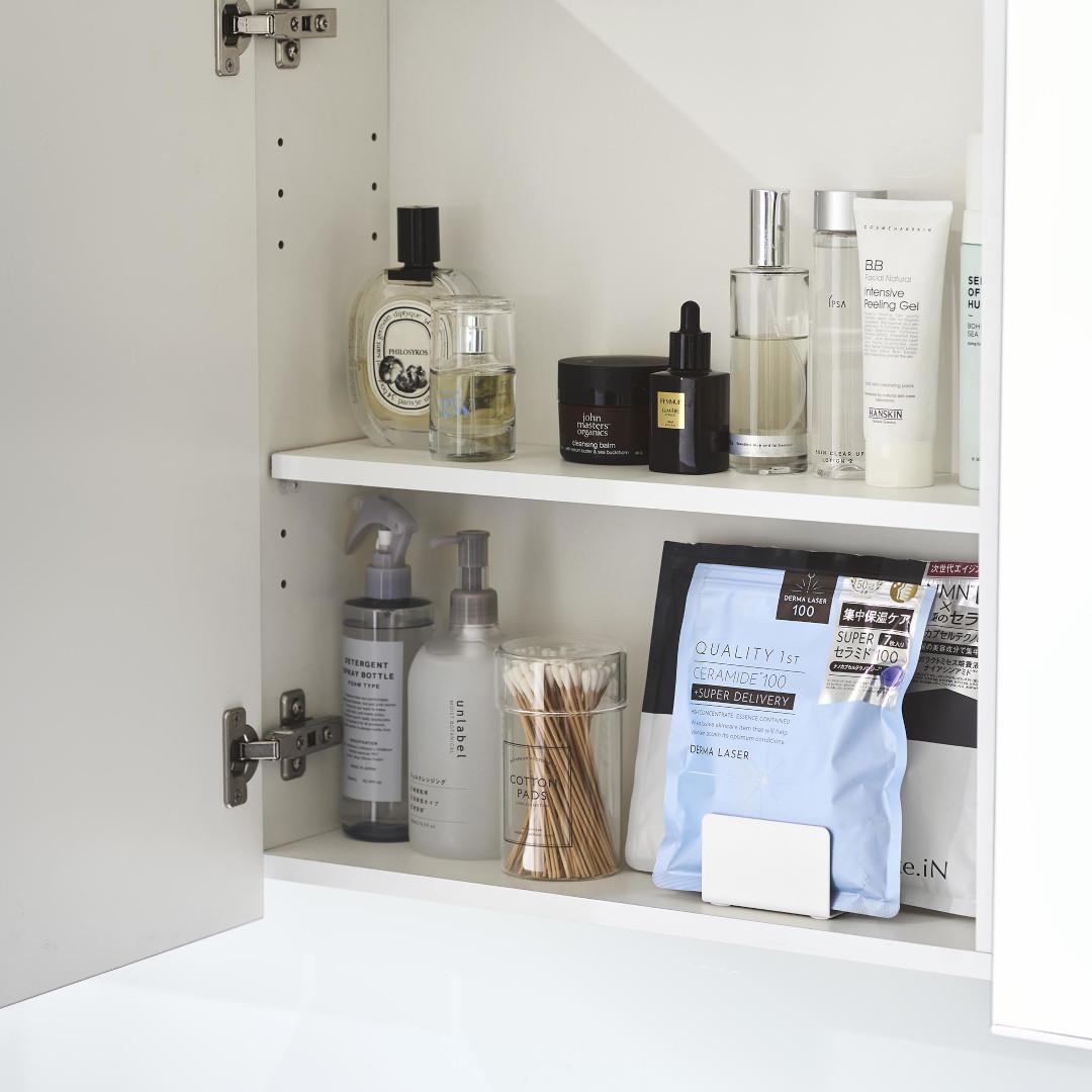 縦置きさせて洗面所を整理整頓自立しない袋入りのフェイスマスクを立てて収納できる仕切り付きスタンドです。二種類のマスクを仕切って収納できるから手に取りやすくて便利。一枚入りの使い切りマスクなどは一つの仕切りの中に複数個収納することが可能です。パッケージが映える、2色のカラーバリエーションカラーは、清潔感のあるホワイト、スタイリッシュなブラックをご用意しました。フェイスマスクのパッケージが映えるシンプルなモノトーンカラーです。洗面所の雰囲気やお手持ちの美容小物に合わせてお好みのカラーをお選びください。内容量に合わせて収納できる仕切り前後で奥行きが異なるように仕切りが配置されているため、内容量に合わせて二種類のマスクをまとめて収納することが可能です。朝用/夜用、保湿力の高いもの/ブライトニング効果が高いもの、などシーンや肌の状態に合わせてマスクを使い分けている方にもおすすめ。鏡裏収納に収まるコンパクトさ♪洗面鏡中の収納スペースに置けるよう、奥行き7.5cmのコンパクトなサイズ感で設計されました。寝かせて収納するしかなかったフェイスマスクも自立させれば他の基礎化粧品と一緒に収納ができて使い勝手がUP。引き出し収納派の整理にも引き出し収納や、ドレッサーの上に立てて収納するのにもお使いいただけます。上に積み重ねて収納していると、使用頻度の低いマスクの存在感が薄れてしまいますが、立てて収納ならすべてのマスクがパッと目に入るので忘れるのを防げます。