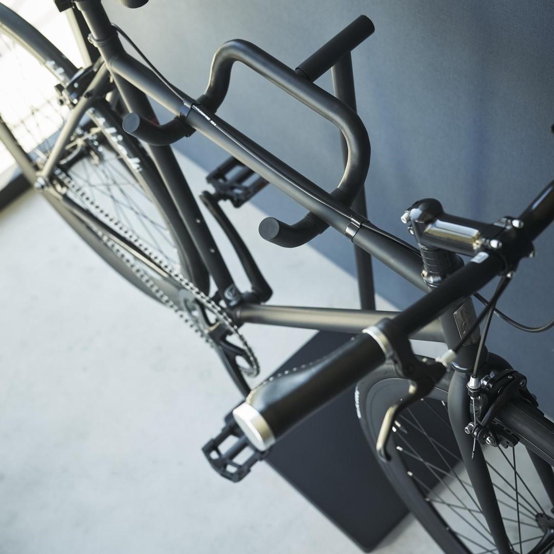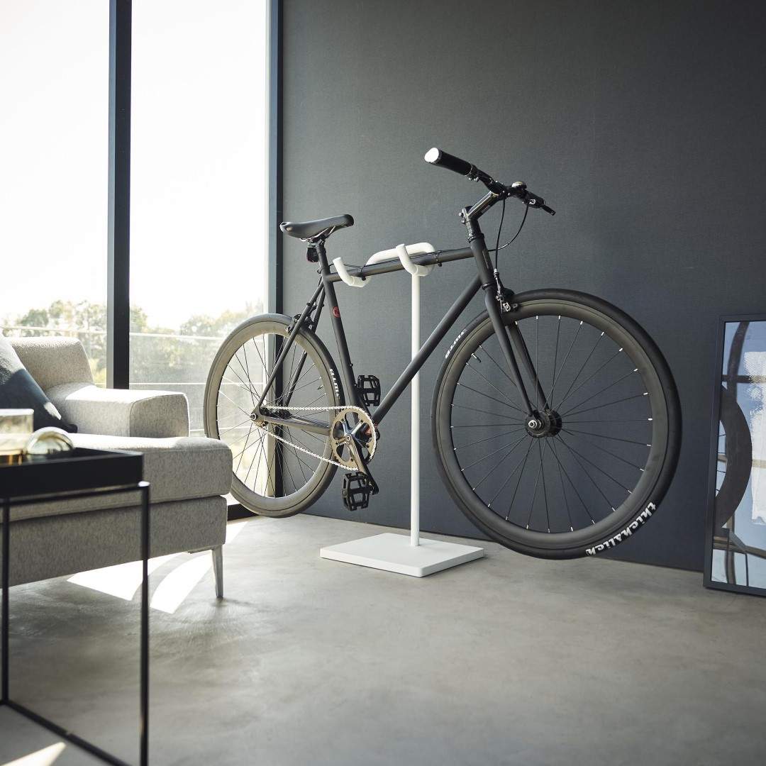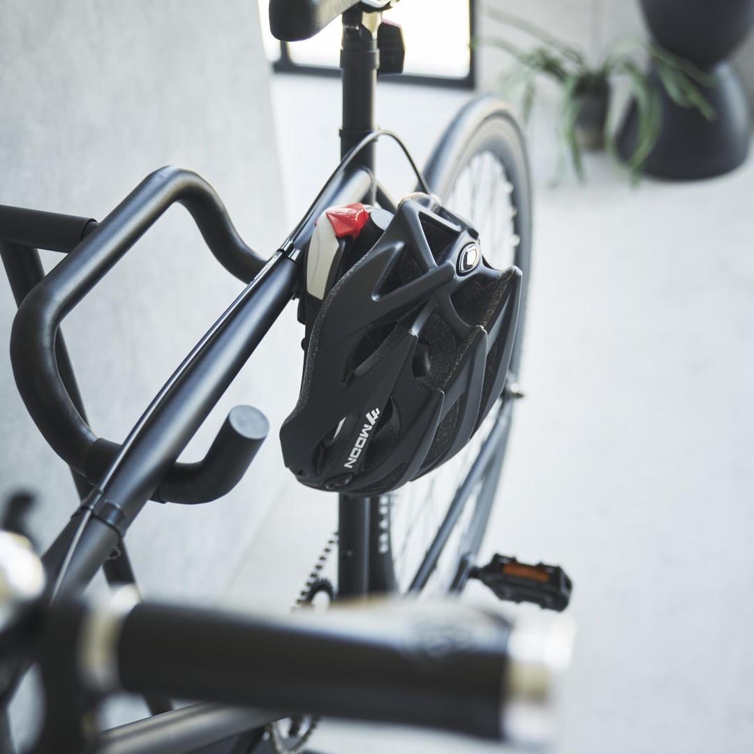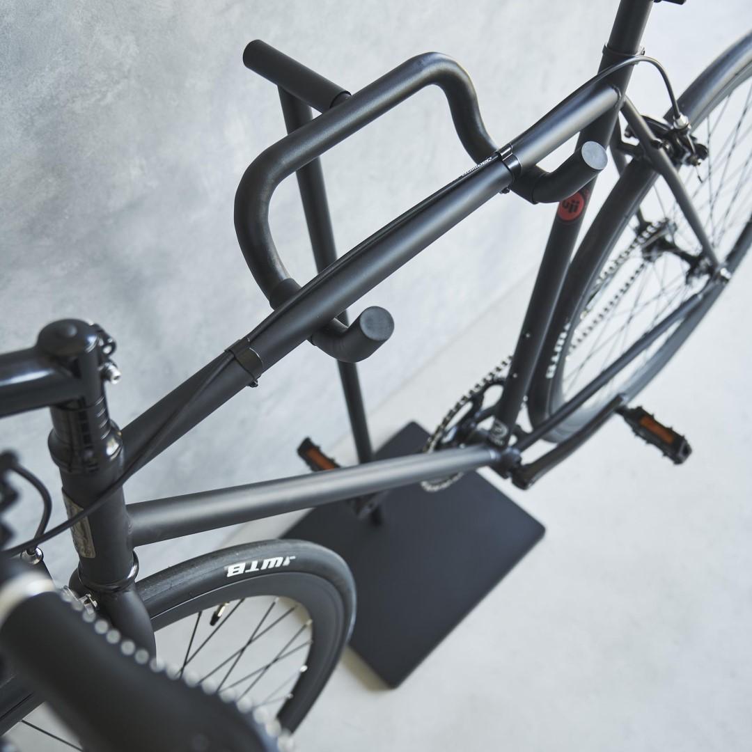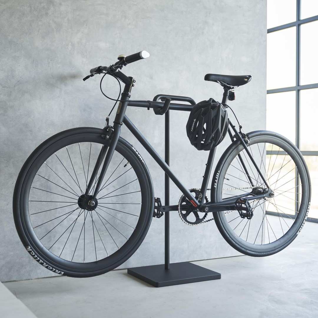 自転車を飾りながらスマートに収納スポーツサイクルを飾りながら収納できる室内保管用スタンドです。タイヤを浮かせて収納できるため、床を汚しにくく室内に持ち込めるのがポイント。使いたいときにすぐ自転車で出かけられるようにスタンドを玄関に設置するのはもちろん、インテリアとしてリビングに飾るのも◎。インテリアに合わせやすい、2色のカラーバリエーションカラーは、明るい印象のホワイト、スタイリッシュなブラックをご用意しました。どんなインテリアにも合わせやすいシンプルなモノトーンカラーです。設置場所の壁紙や家具の雰囲気、自転車に合わせてなど、お好みのカラーをお選びください。ロードバイクもクロスバイクにも対応できる可動式ハンガー部ハンガー部の角度調整することで、ロードバイクやクロスバイクなどトップチューブの角度に差異があるさまざまな自転車に対応できる仕様です。自転車を置く向きだって左右どちらか好きな方を選べる柔軟性の高さが魅力です。場所を取らずにスリムに収納台座の奥行きは33cmと非常にスリムです。自転車の幅以上のスペースを取らないように設計されているので、家の中に置いておいても想定していた以上に圧迫感を与えません。省スペースに収納できるからリビングにディスプレイしてもOK。シリコーンの滑り止めでフレームに配慮フレームを掛ける部分にはシリコーンの滑り止めが付いて、大切にしている自転車に傷をつけにくい気配りが施されています。収納場所に困るヘルメットは、ハンガー部に掛けて収納しておくことが可能です。