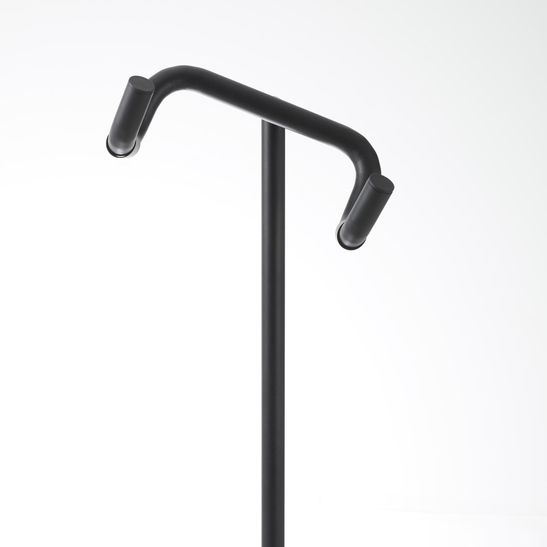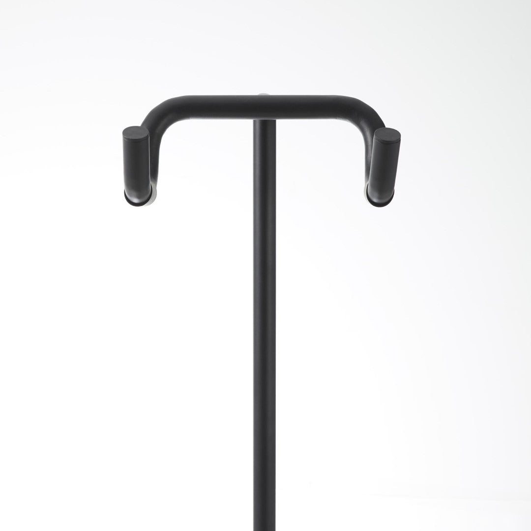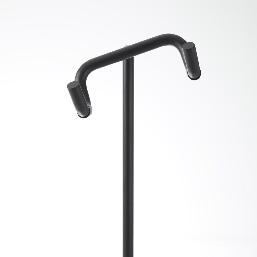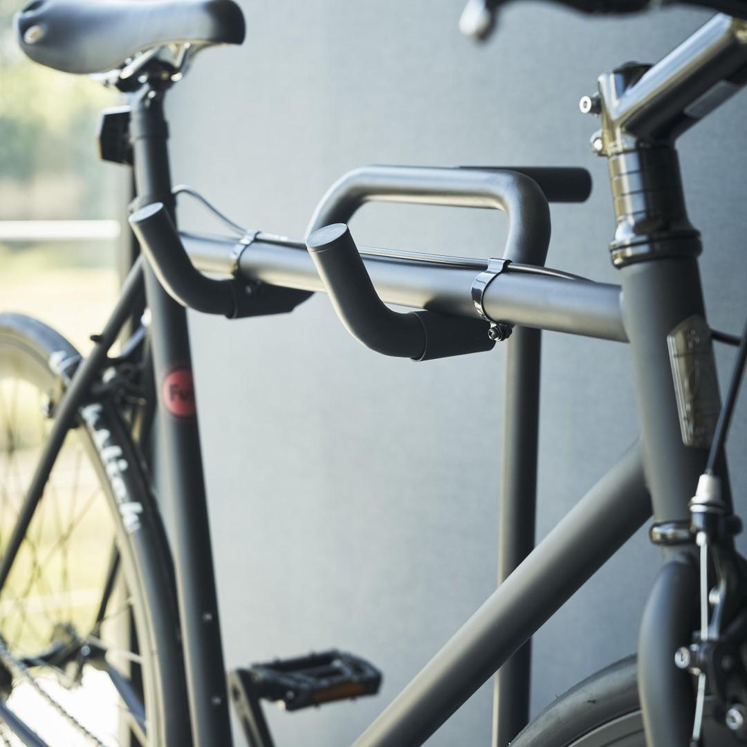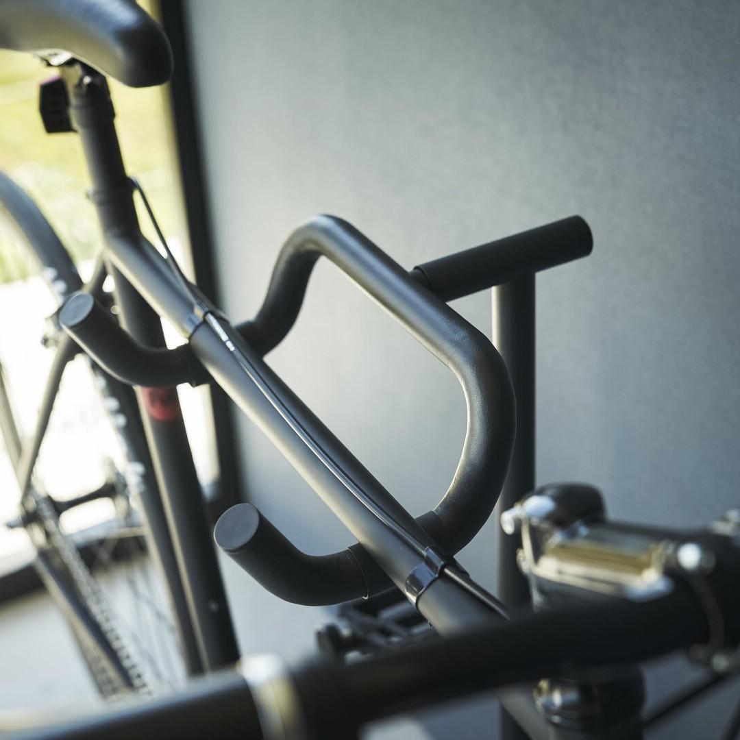 自転車を飾りながらスマートに収納スポーツサイクルを飾りながら収納できる室内保管用スタンドです。タイヤを浮かせて収納できるため、床を汚しにくく室内に持ち込めるのがポイント。使いたいときにすぐ自転車で出かけられるようにスタンドを玄関に設置するのはもちろん、インテリアとしてリビングに飾るのも◎。インテリアに合わせやすい、2色のカラーバリエーションカラーは、明るい印象のホワイト、スタイリッシュなブラックをご用意しました。どんなインテリアにも合わせやすいシンプルなモノトーンカラーです。設置場所の壁紙や家具の雰囲気、自転車に合わせてなど、お好みのカラーをお選びください。ロードバイクもクロスバイクにも対応できる可動式ハンガー部ハンガー部の角度調整することで、ロードバイクやクロスバイクなどトップチューブの角度に差異があるさまざまな自転車に対応できる仕様です。自転車を置く向きだって左右どちらか好きな方を選べる柔軟性の高さが魅力です。場所を取らずにスリムに収納台座の奥行きは33cmと非常にスリムです。自転車の幅以上のスペースを取らないように設計されているので、家の中に置いておいても想定していた以上に圧迫感を与えません。省スペースに収納できるからリビングにディスプレイしてもOK。シリコーンの滑り止めでフレームに配慮フレームを掛ける部分にはシリコーンの滑り止めが付いて、大切にしている自転車に傷をつけにくい気配りが施されています。収納場所に困るヘルメットは、ハンガー部に掛けて収納しておくことが可能です。