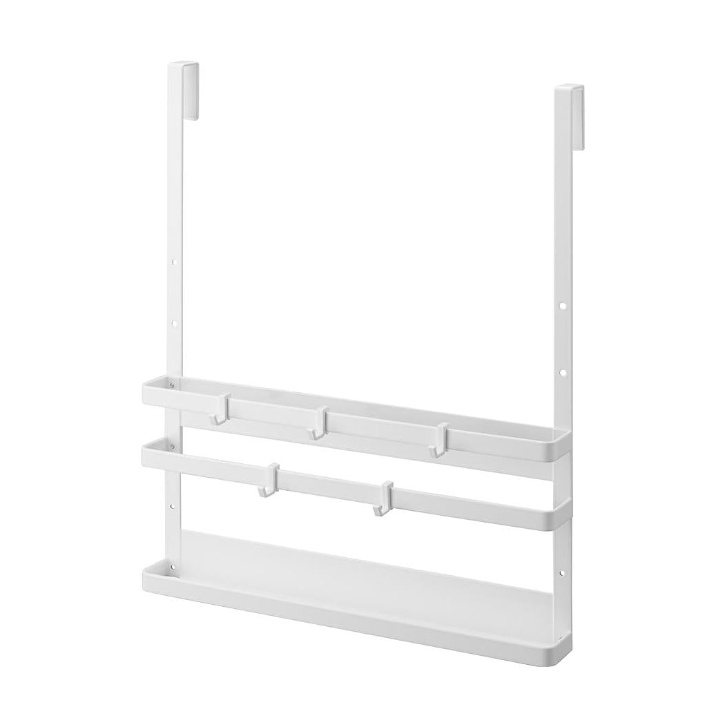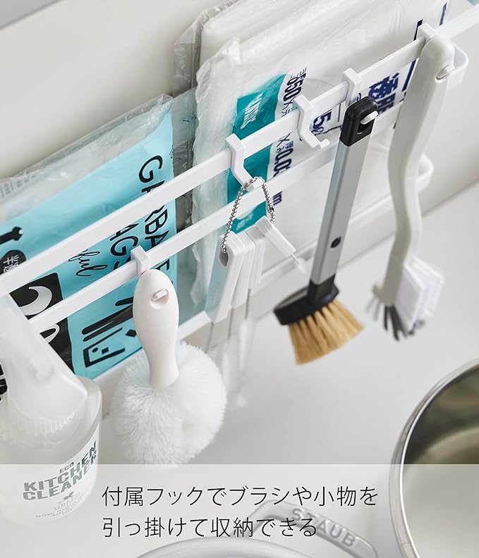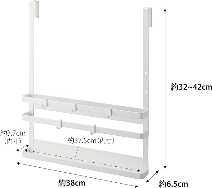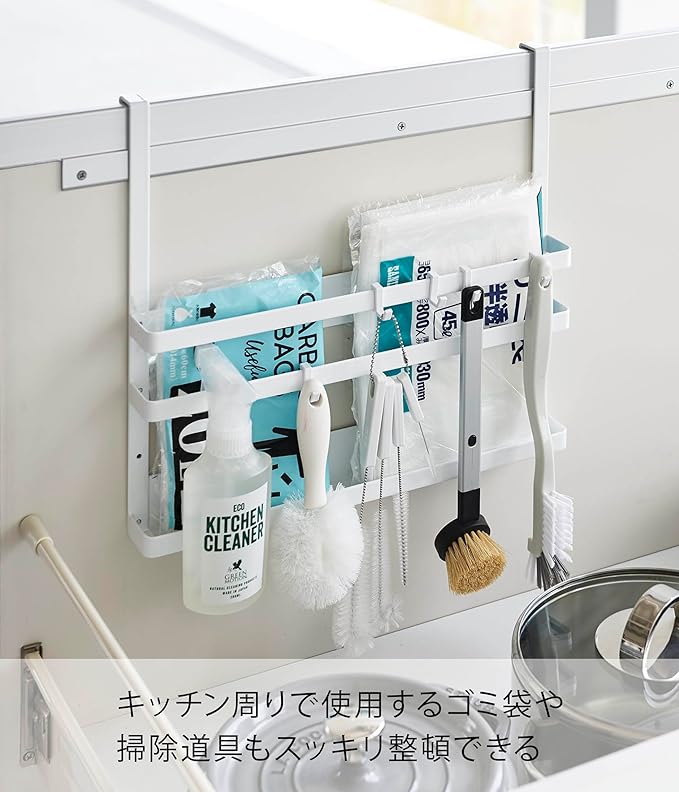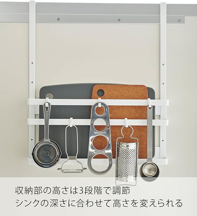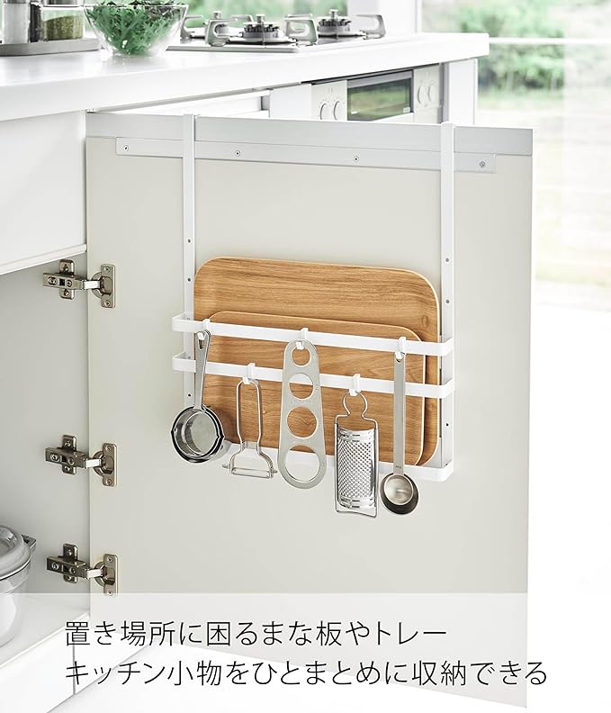 簡単。引っ掛けるだけで収納スペースが誕生 シンク下の開き扉や引き戸に引っ掛けるだけの、まな板&トレーホルダーです。置き場所に困るまな板・トレー・キッチン周りの小物・掃除用具などを簡単収納。収納部の高さを3段階で調節でき、シンクの深さに合わせて高さを変えられます。付属のフックでブラシや小物なども収納可能です。キッチンになじみやすい、2色のカラーバリエーション カラーは、明るい印象のホワイトと、スタイリッシュなブラックをご用意しました。どのおうちのキッチンにもマッチする、シンプルなモノトーンカラーです。扉の色やキッチンインテリアに合わせてなど、お好みのカラーをお選びください。扉を開けてすぐ手が届く。定番の調理器具置き場へ 普段使いのまな板、食卓でフルーツなどを切るために使う小さめのカッティングボード、ピーラー、おろし器、計量カップやスプーンなど、使用頻度の高い調理ツールをまとめて収納。シンク下扉を開けたらすぐに手に取れて便利です。キッチン周りで使用するツール収納に ゴミ袋はラック部に、ブラシは付属のフックに、キッチン用除菌スプレーはラックに直接引っ掛けてなど、さまざまな物を一括収納できます。掃除ツールがひとまとめになっていると調理後の掃除がしやすく、片付けもスムーズです。シンクに合わせて高さを変えられる可動式 設置場所に合わせて高さを三段階に調節できます。5cm間隔で調整でき、最小サイズは32cm、最大サイズは42cmです。取り付け可能な扉は、扉の幅が38cm以上、厚さが1.5~2.2cm以内のものです。扉と上部との隙間が3mm以上必要になりますので、設置予定の扉をよくご確認ください。設置箇所の傷つき防止のクッションが付いていて安心です。