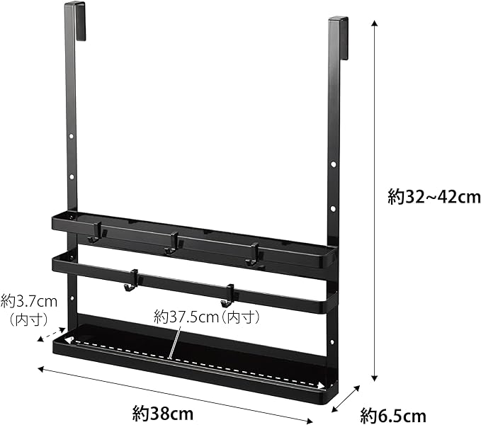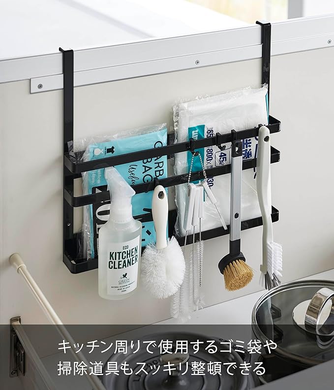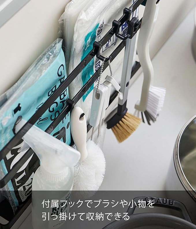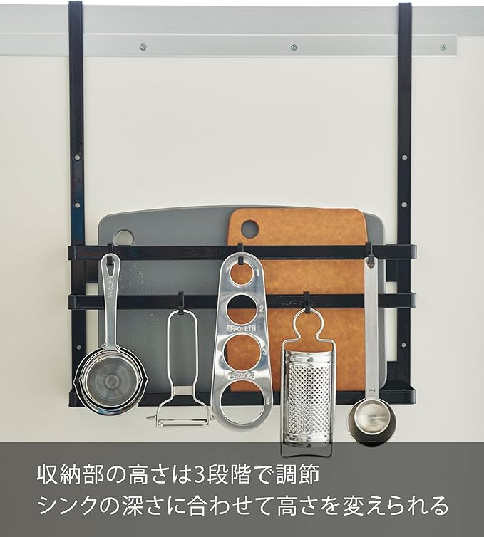 シンク下の開き扉や引き戸に引っ掛けるだけ。置き場所に困るまな板・トレー・キッチン周りの小物・掃除用具などを簡単収納。キッチン周りで使用するゴミ袋やブラシなどもスッキリ整頓できます。収納部の高さを3段階で調節できます。シンクの深さに合わせて高さを変えられます。付属のフックでブラシや小物なども収納可能。