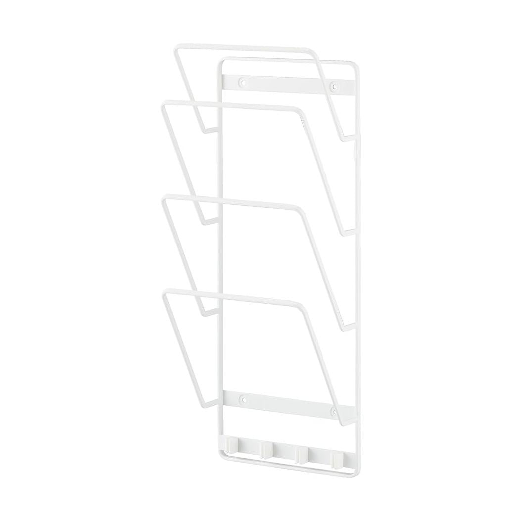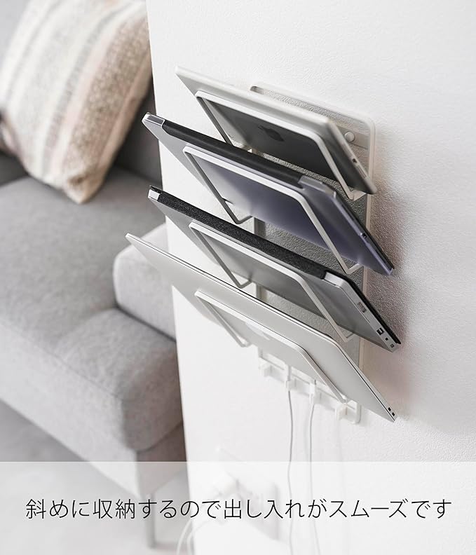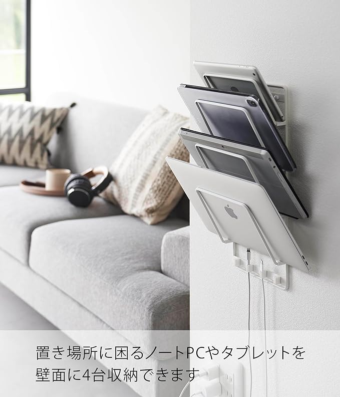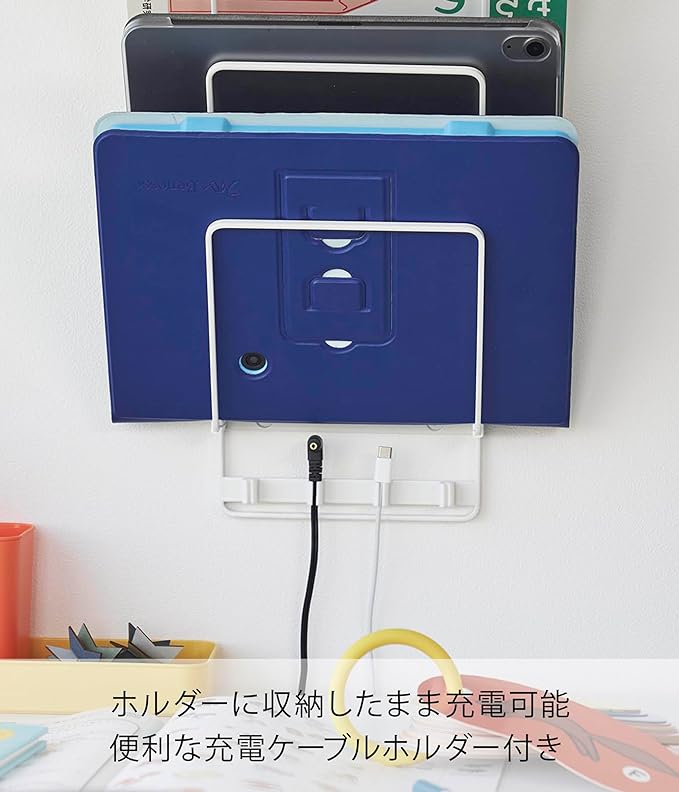 子どもの学習用、家族共用のタブレットを壁面収納 置き場所に困るノートPCや学習用タブレットを、壁面にスッキリ収納できるウォールタブレットホルダーです。シリコーンの充電ケーブルホルダーがあり、差込み口を留めておけるのでサッと充電できて便利。ホルダーに収納したまま充電ができます。お子様の本や学習用タブレットの定位置として。タブレット収納時に傷つきを防ぐシリコーン製緩衝材を付属しています。お好みの位置に取り付けてご使用ください。リビングになじみやすい、2色のカラーバリエーション カラーは、明るい印象のホワイト、スタイリッシュなブラックをご用意しました。インテリアを損なわないシンプルなモノトーンカラーです。壁面や床の色、ソファなどのファブリックに合わせてお好みのカラーをお選びください。出し入れしやすい最適な角度 適度な角度が付いたホルダーはタブレットを斜めに収納します。上からも横からもサッと取り出しやすく、戻しやすい設計です。タブレットやPCの代わりにブックスタンドとしてもご使用いただけます。読みかけの小説やレシピ本、雑誌の収納に。ケーブルを床に落とさずキープ。 収納したまま充電も◎ ホルダーの下部にはケーブルホルダーが付属しています。ホルダーに端子が引っ掛かるので、ケーブルが床に落ちずホコリの付着も防止します。充電しようとするたびに落ちているケーブルを拾う手間がなくなり、見た目もスマートに。壁の穴が目立ちにくい石こうボードピン取り付け 石こうボードピンで設置するので、取り外したときに壁の穴が目立ちにくいのがうれしいポイント。大きな力は必要なく、コインを使って指でピンをぐっと押し込むだけ。女性でも簡単に取り付けが完了します。付属の木ネジを使えば柱や板壁に取り付けることも可能です。