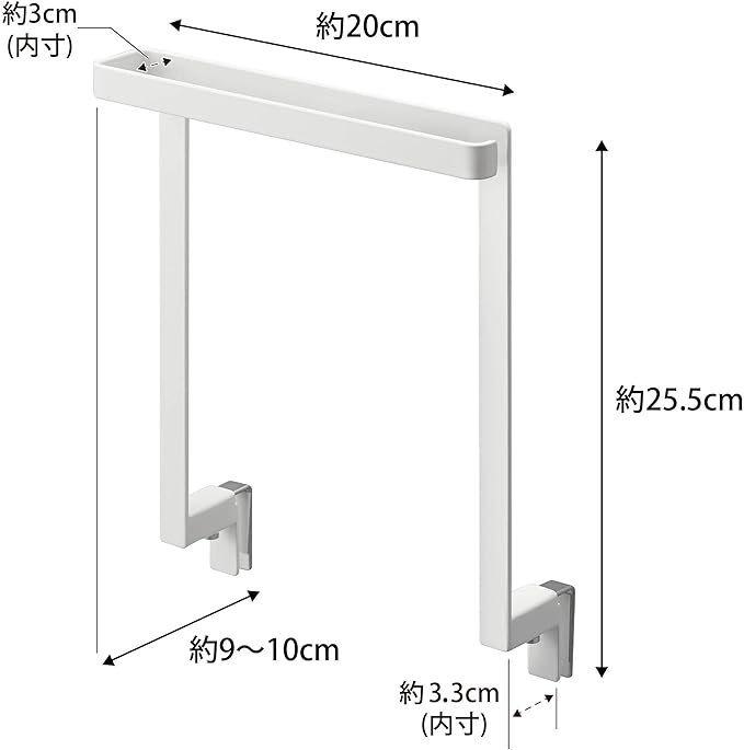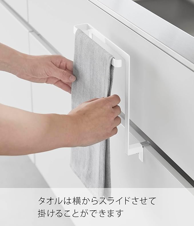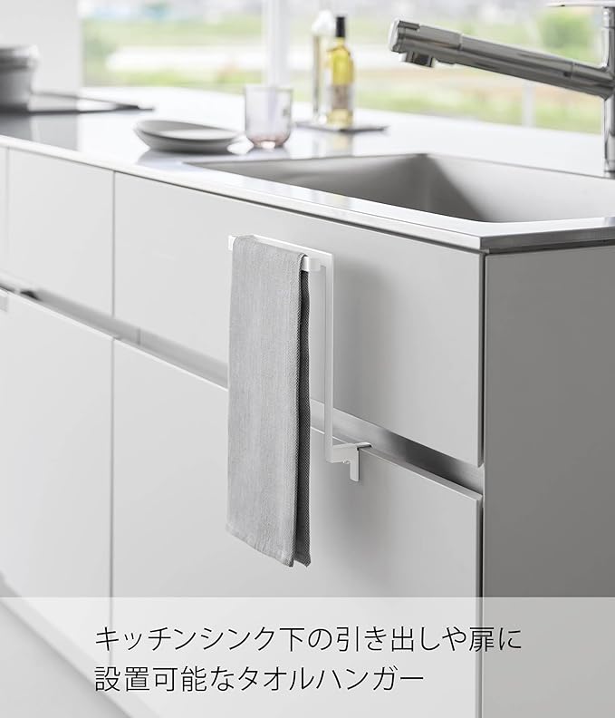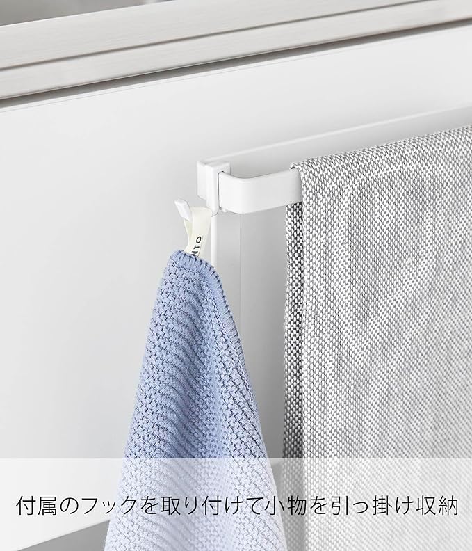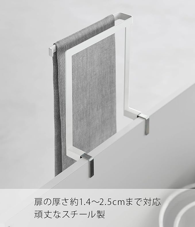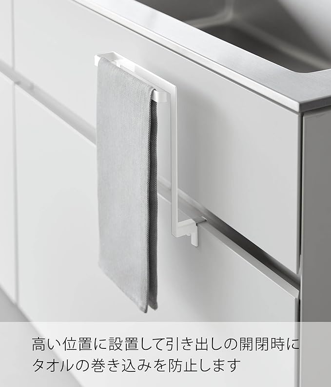 ありそうでなかった。 タオルと扉はノンタッチ 引き出しの開閉時にタオルを巻き込まない秘訣はハンガーの構造にあり。 タオルを扉に密接させず、高い位置で浮いているような状態をキープするので巻き込みにくくなります。設置面は緩衝材で傷を防止します。キッチンにマッチする2色のカラーバリエーション カラーは、明るい印象のホワイトと、シックなブラックをご用意しました。どんなキッチンインテリアにも似合うシンプルなモノトーンカラーです。壁面の色やワークトップ、キッチン家電に合わせてなどお好みのカラーをお選びください。フック付きで小物を掛けられる便利さ 付属のフックを取り付ければ、+αでほかのアイテムも引っ掛けられちゃう。ループ付きの布巾を乾かすのに使ってもOK。 キッチン周りの小物の定位置に、お掃除中のちょい掛けにぴったりなフックは汎用性バツグンです。あらゆる厚みの引き出しに対応 厚さ1.4cm?2.5cmの扉に対応しています。使用時にガタガタ揺れないよう、しっかりと固定します。穴を空けるわけではないので、気軽に取り付けられるうえ別の場所に移動したりも◎。見た目もGOOD。 安心して使えるスチール製 頑丈なスチール製なので安定感があり、プラスチック製と違って使い続けているうちに曲がったり折れたりといったことが起こりづらいのが魅力です。スチールに粉体塗装が施されたマットな質感は、高級感がありキッチンによくなじみます。