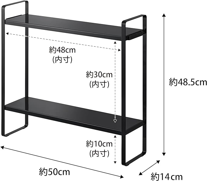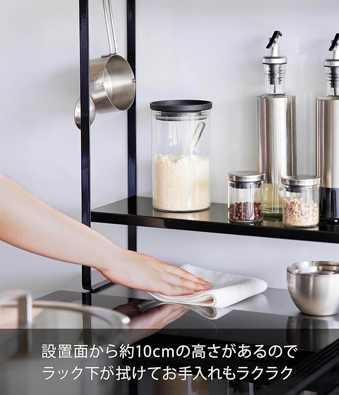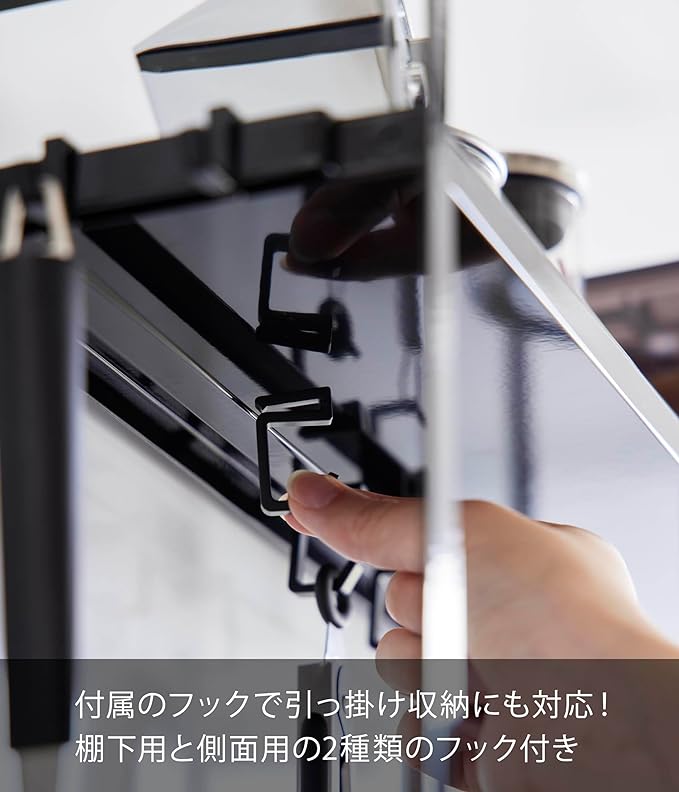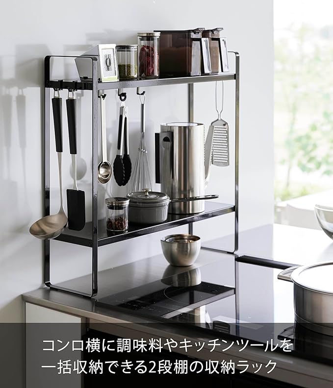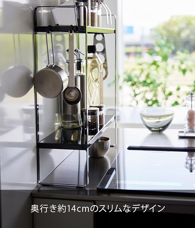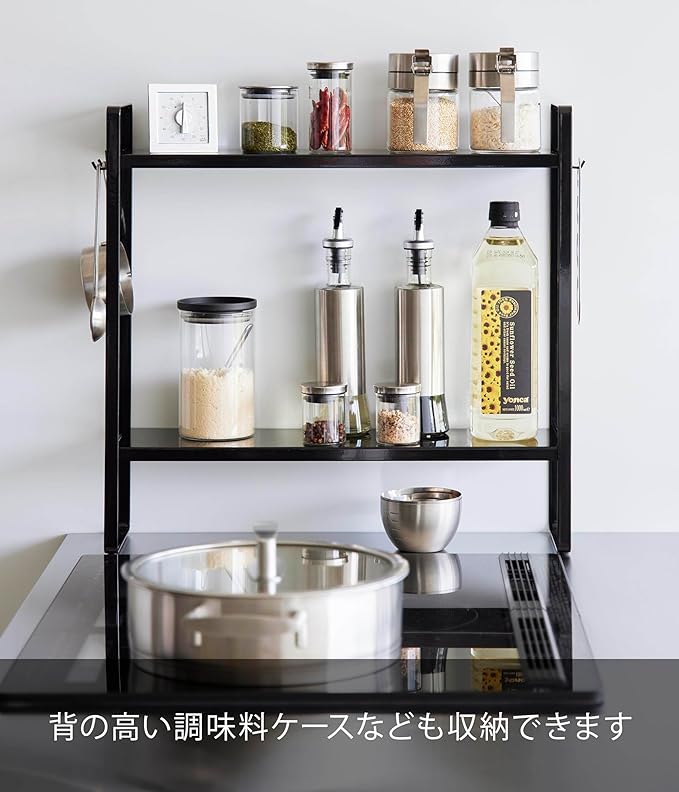 コンロ周りに必要な小物を一括収納。ラック下が拭けるのでお手入れが簡単なコンロ横ラック。計量スプーンや背の高い調味料ケースなども収納できる2段棚の収納ラック。奥行き約14cmなのでコンロ横にスッキリ収まるサイズです。設置面から約10cm高さがあるので、下が拭けてお手入れ簡単。キッチン周りの小物もスッキリ整頓できます。棚下のバーのお好みの場所にフックが取り付けられます。側面にもフックを掛けることができます。コンロ横にスッキリ収まる2段棚の収納ラック。