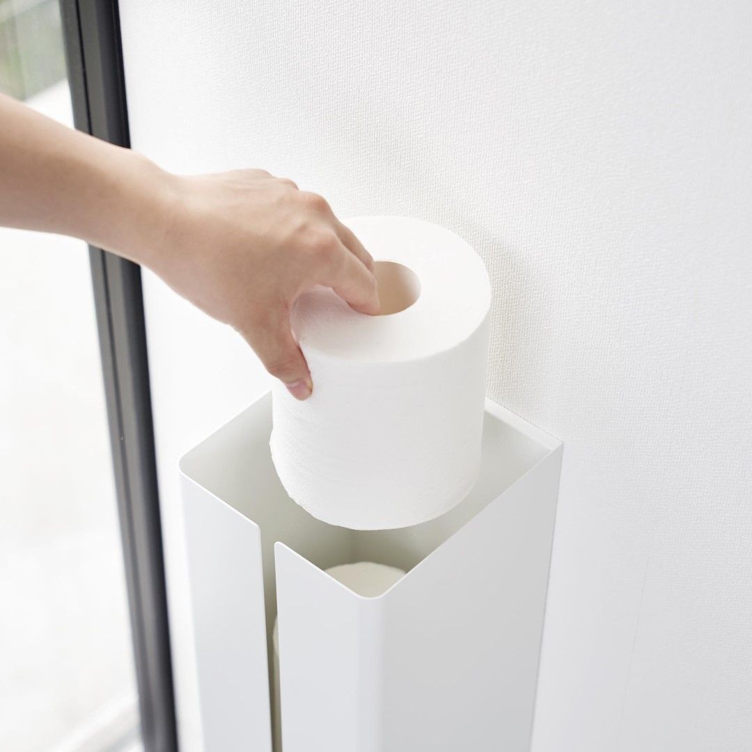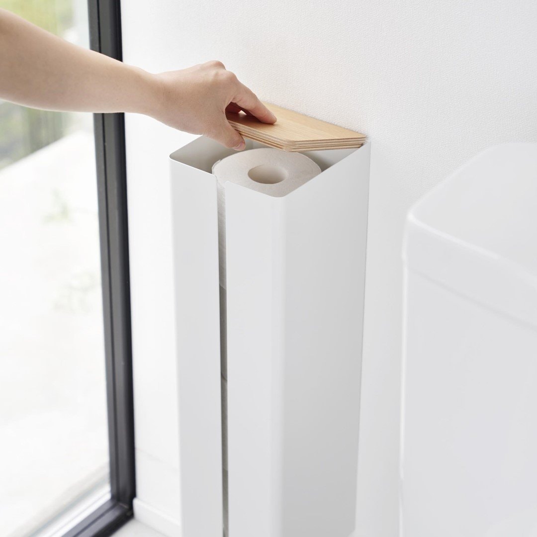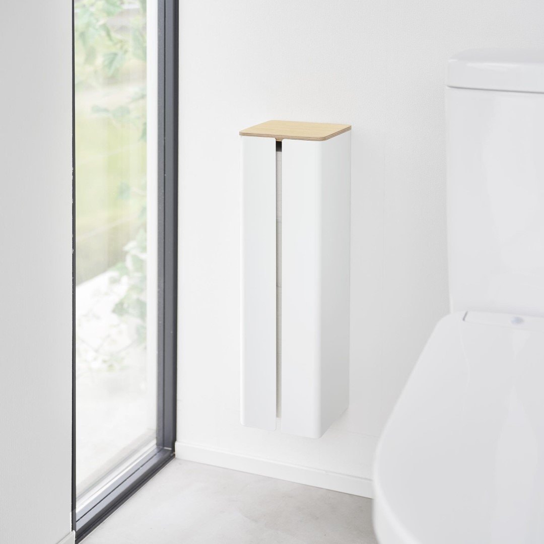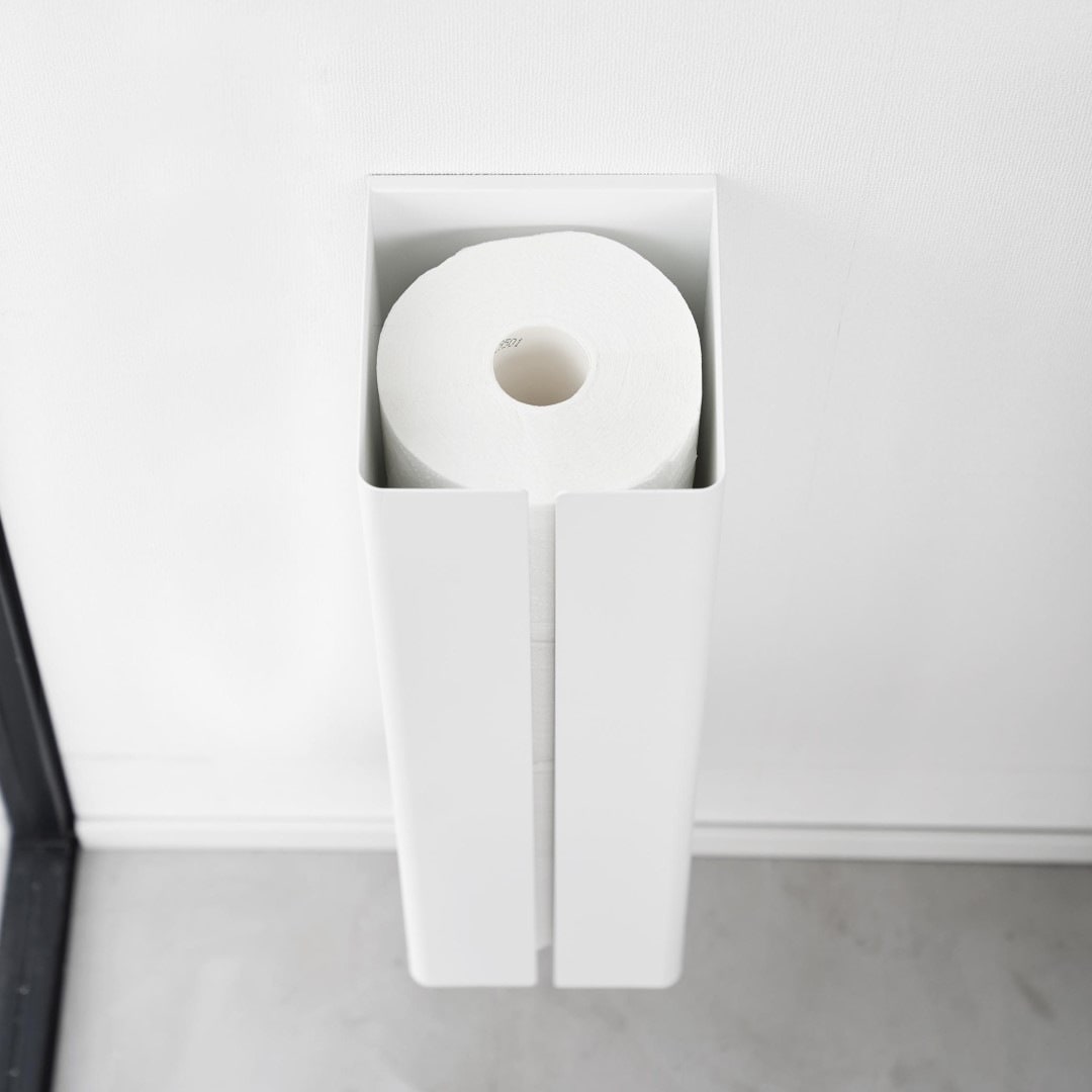 トイレットペーパーを浮かせてスマートに収納 生活感の出やすいトイレットペーパーを隠して収納できる専用ホルダーです。取り付けベースを壁に取り付けたら本体を差し込むだけで簡単に設置が完了します。浮かせているのでお掃除もスムーズ。 もちろん直接床に置いてもご使用いただけます。海外製のトイレットペーパーも収納可能なワイドサイズです。トイレにフィットする2色のカラーバリエーション カラーは、清潔感あるホワイトと、スタイリッシュなブラックをご用意しました。どのタイプのトイレにもなじみやすいシンプルなモノトーンカラーです。床の材質、壁紙の色などに合わせてお好きなカラーをお選びください。デザイン性のあるスリットは実用性も。 一目で残数確認◎ 正面のスリットからトイレットペーパーの残数が一目でチェックできます。蓋を開けて確認しなくてもトイレの度に何気なく目にしているので、買い物中に残数のチェック忘れで悩むこともなくなります。小物置きにぴったりな天然木の蓋 蓋部分は手荷物をちょこっと乗せるのに便利です。スマホやポーチの一時置きに、トイレ用芳香剤置き場としても活躍。粉体塗装されたマット質感のスチール×天然木の異なる素材が互いの魅力を引き立てます。壁の穴が目立ちにくい石こうボードピン取り付け 石こうボードピンで設置するので、取り外したときに壁の穴が目立ちにくいのがうれしいポイント。大きな力は必要なく、コインを使って指でピンをぐっと押し込むだけ。女性でも簡単に取り付けが完了します。付属の木ネジを使えば柱や板壁に取り付けることも可能です。