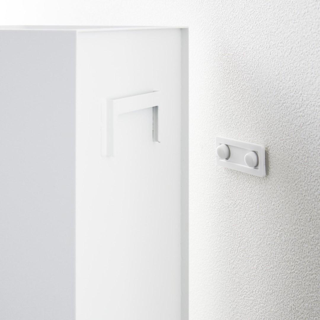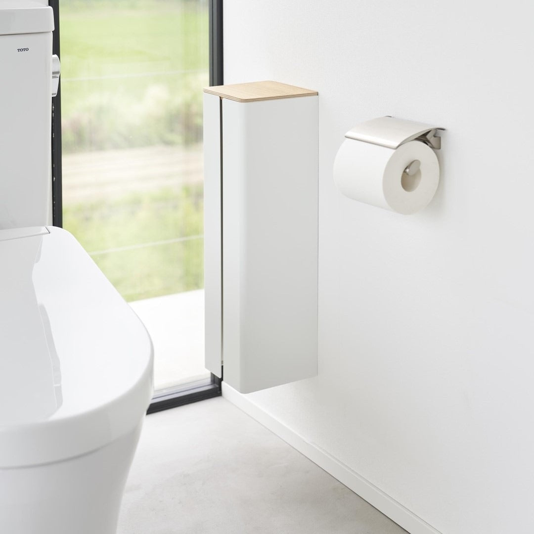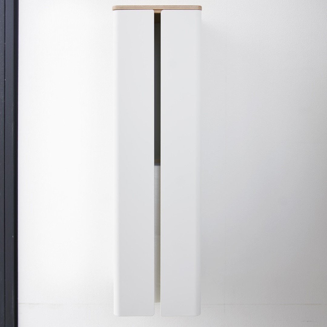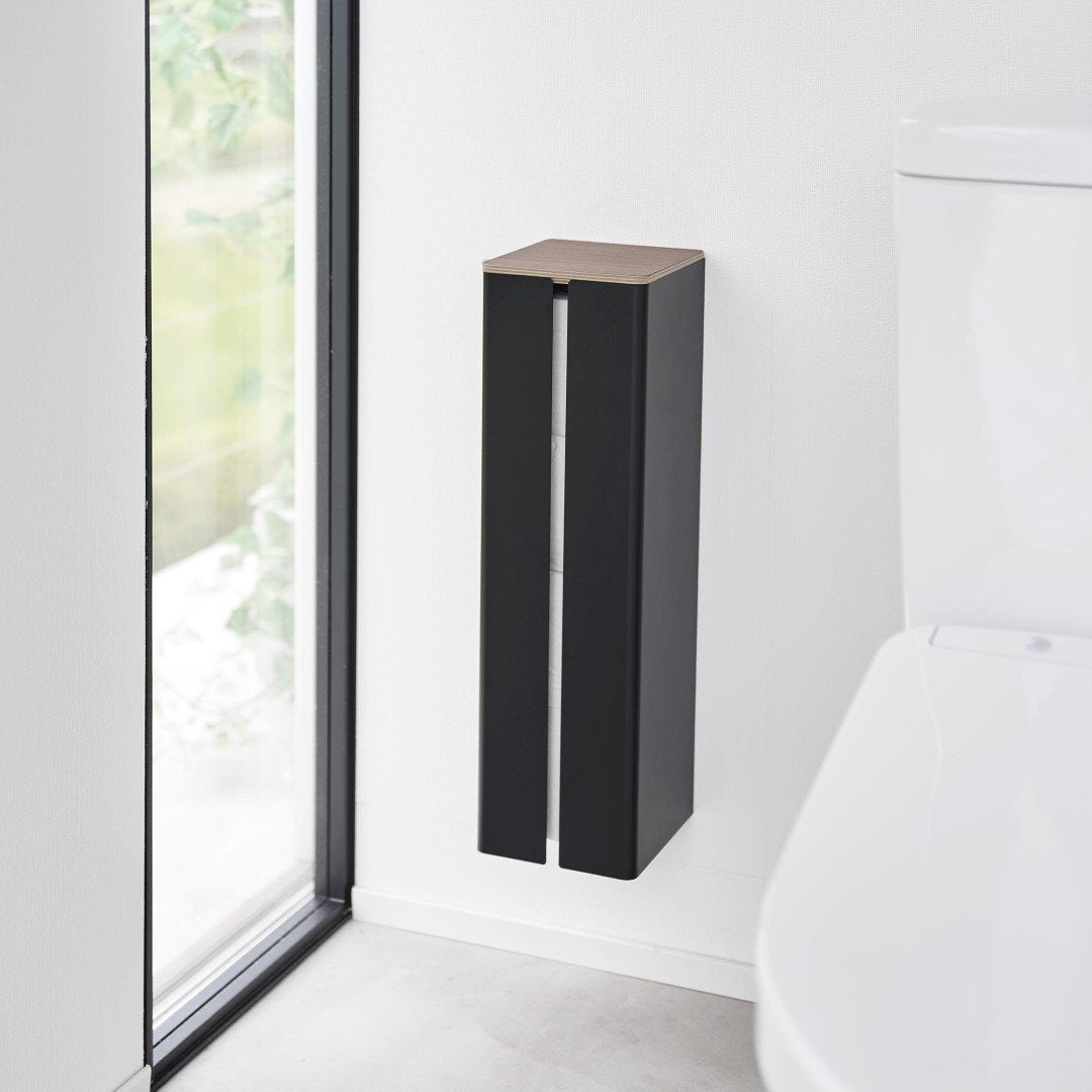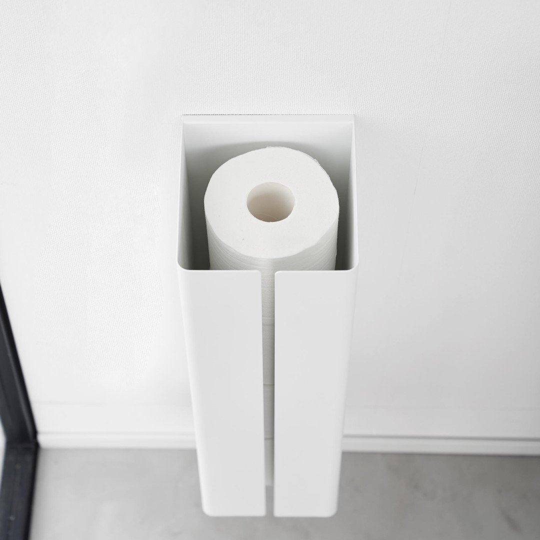 トイレットペーパーを浮かせてスマートに収納 生活感の出やすいトイレットペーパーを隠して収納できる専用ホルダーです。取り付けベースを壁に取り付けたら本体を差し込むだけで簡単に設置が完了します。浮かせているのでお掃除もスムーズ。 もちろん直接床に置いてもご使用いただけます。海外製のトイレットペーパーも収納可能なワイドサイズです。トイレにフィットする2色のカラーバリエーション カラーは、清潔感あるホワイトと、スタイリッシュなブラックをご用意しました。どのタイプのトイレにもなじみやすいシンプルなモノトーンカラーです。床の材質、壁紙の色などに合わせてお好きなカラーをお選びください。デザイン性のあるスリットは実用性も。 一目で残数確認◎ 正面のスリットからトイレットペーパーの残数が一目でチェックできます。蓋を開けて確認しなくてもトイレの度に何気なく目にしているので、買い物中に残数のチェック忘れで悩むこともなくなります。小物置きにぴったりな天然木の蓋 蓋部分は手荷物をちょこっと乗せるのに便利です。スマホやポーチの一時置きに、トイレ用芳香剤置き場としても活躍。粉体塗装されたマット質感のスチール×天然木の異なる素材が互いの魅力を引き立てます。壁の穴が目立ちにくい石こうボードピン取り付け 石こうボードピンで設置するので、取り外したときに壁の穴が目立ちにくいのがうれしいポイント。大きな力は必要なく、コインを使って指でピンをぐっと押し込むだけ。女性でも簡単に取り付けが完了します。付属の木ネジを使えば柱や板壁に取り付けることも可能です。
