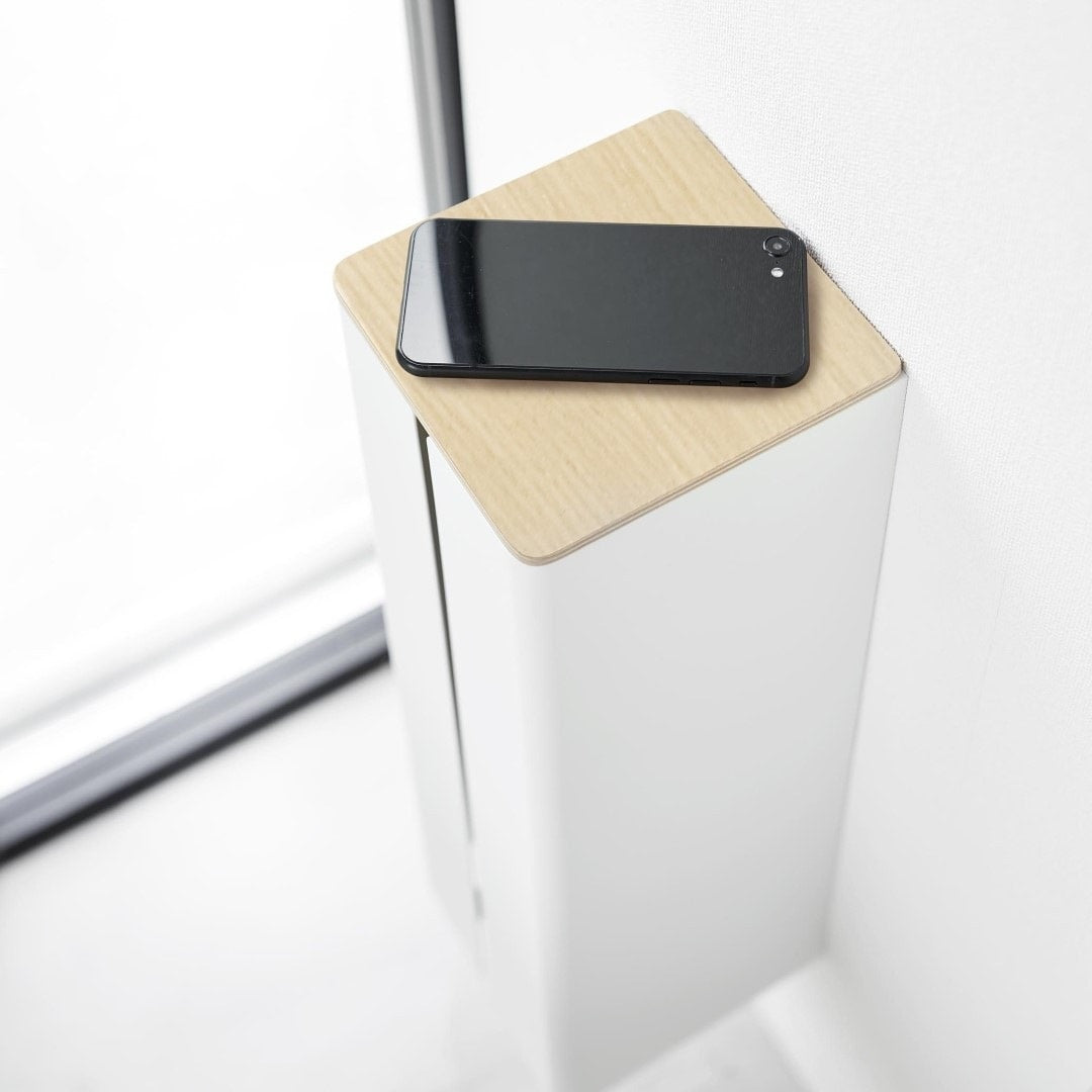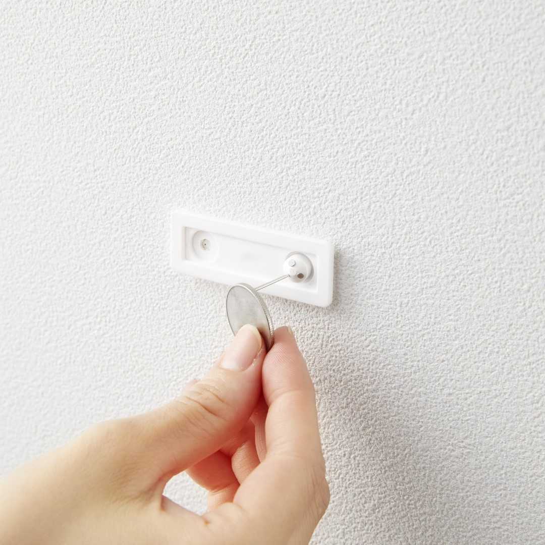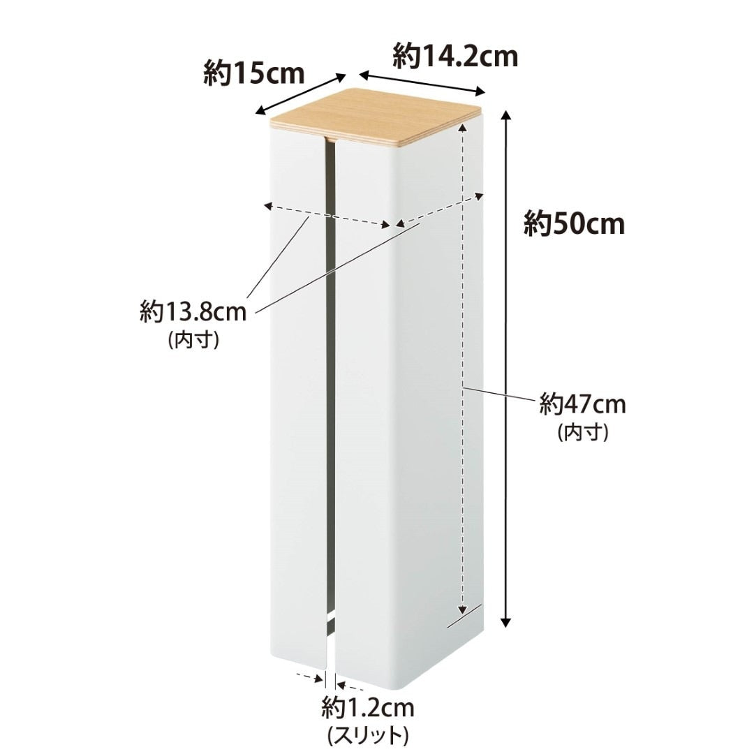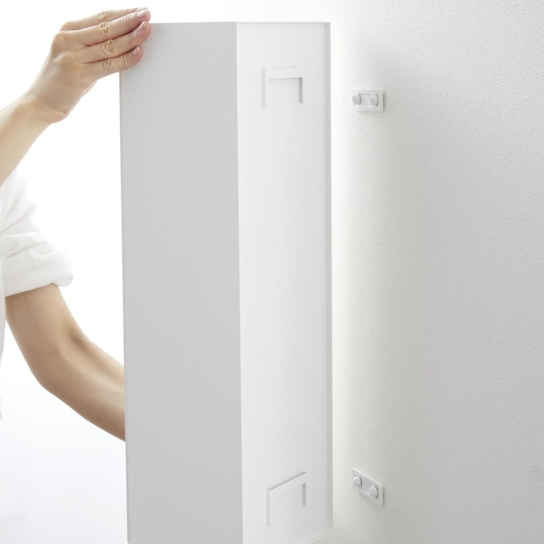 トイレットペーパーを浮かせてスマートに収納 生活感の出やすいトイレットペーパーを隠して収納できる専用ホルダーです。取り付けベースを壁に取り付けたら本体を差し込むだけで簡単に設置が完了します。浮かせているのでお掃除もスムーズ。 もちろん直接床に置いてもご使用いただけます。海外製のトイレットペーパーも収納可能なワイドサイズです。トイレにフィットする2色のカラーバリエーション カラーは、清潔感あるホワイトと、スタイリッシュなブラックをご用意しました。どのタイプのトイレにもなじみやすいシンプルなモノトーンカラーです。床の材質、壁紙の色などに合わせてお好きなカラーをお選びください。デザイン性のあるスリットは実用性も。 一目で残数確認◎ 正面のスリットからトイレットペーパーの残数が一目でチェックできます。蓋を開けて確認しなくてもトイレの度に何気なく目にしているので、買い物中に残数のチェック忘れで悩むこともなくなります。小物置きにぴったりな天然木の蓋 蓋部分は手荷物をちょこっと乗せるのに便利です。スマホやポーチの一時置きに、トイレ用芳香剤置き場としても活躍。粉体塗装されたマット質感のスチール×天然木の異なる素材が互いの魅力を引き立てます。壁の穴が目立ちにくい石こうボードピン取り付け 石こうボードピンで設置するので、取り外したときに壁の穴が目立ちにくいのがうれしいポイント。大きな力は必要なく、コインを使って指でピンをぐっと押し込むだけ。女性でも簡単に取り付けが完了します。付属の木ネジを使えば柱や板壁に取り付けることも可能です。