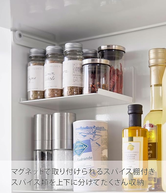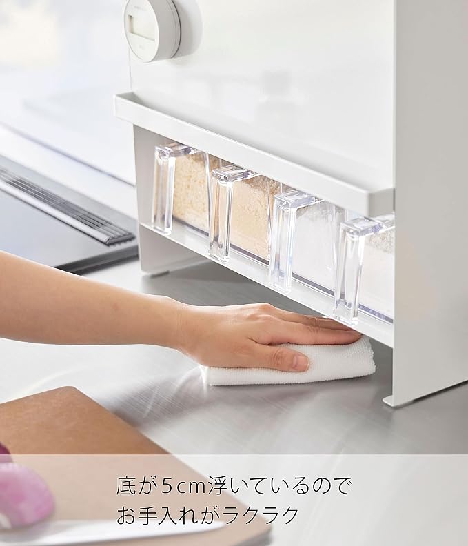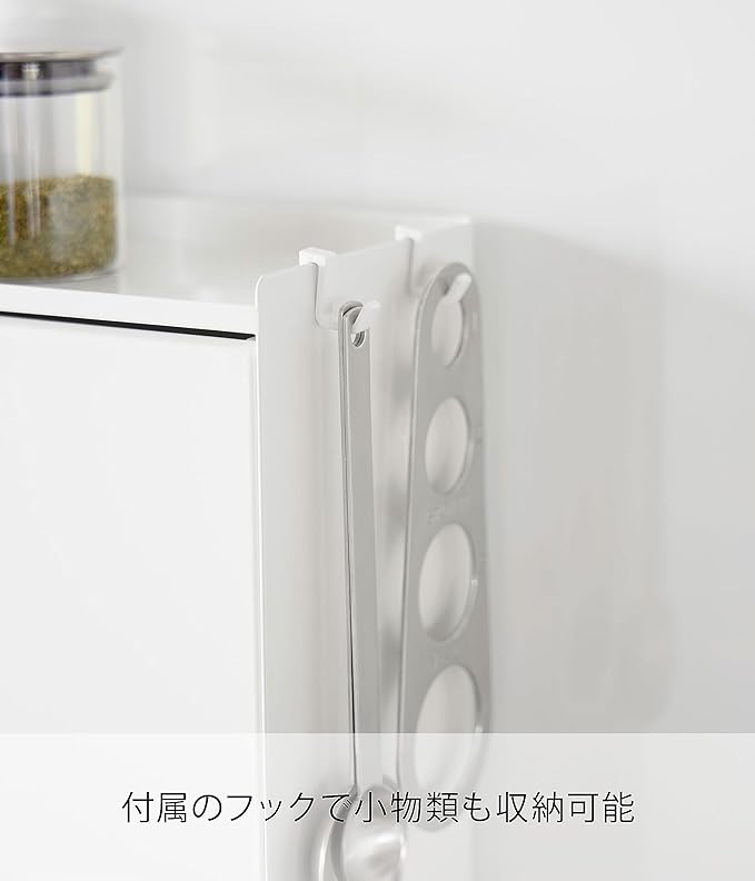 ごちゃつく調味料を隠して収納 さまざまな調味料をそのまま出しておくと、統一感もなくごちゃごちゃしがち。そんな悩みを解決してくれるのがtowerの『前が開く 隠せる調味料ラック』です。扉が前に開くタイプなので、調理中は開けたままにできるのが◎。いちいち引き出しを開け閉めしなくていいのが便利です。また、お手入れしやすいスチール素材なので油跳ねが気になる場合は閉めて油をガードをすることも可能。キッチンに合わせやすいカラー カラーはどんなキッチンにも合わせやすいホワイトとブラックの2種類からお選びいただけます。調味料ポットを入れるスペースはオープンなので、ご使用の調味料ポットに合わせて選択するのもおすすめです。※調味料ポットは付属しておりません。調味料の高さに合わせて設置、マグネットのスパイス棚 扉の中の収納には、マグネットで取付位置が変えられるスパイス棚が付属しています。収納する調味料やスパイスボトルの高さに合わせて取付ができるので、無駄なスペースができません。背の高い調味料ボトルなども一緒に収納ができ、一か所にまとめられるのが魅力です。ツールもかけられるフック付き 軽量スプーンなど、調味料と一緒に使用したいキッチンツールも合わせて収納できるよう、付属のフックが2個ついています。取り外しも簡単にできます。ラック上部はよく使うスパイスを置いたり、スマホを置いてレシピの確認にも便利です。底が浮いてお掃除しやすい ラックの底は5cm浮いていて、お掃除の度に移動する手間がないのでお手入れらくらく。本体もスチール素材なので、汚れがついたら簡単にふき取ることが可能です。