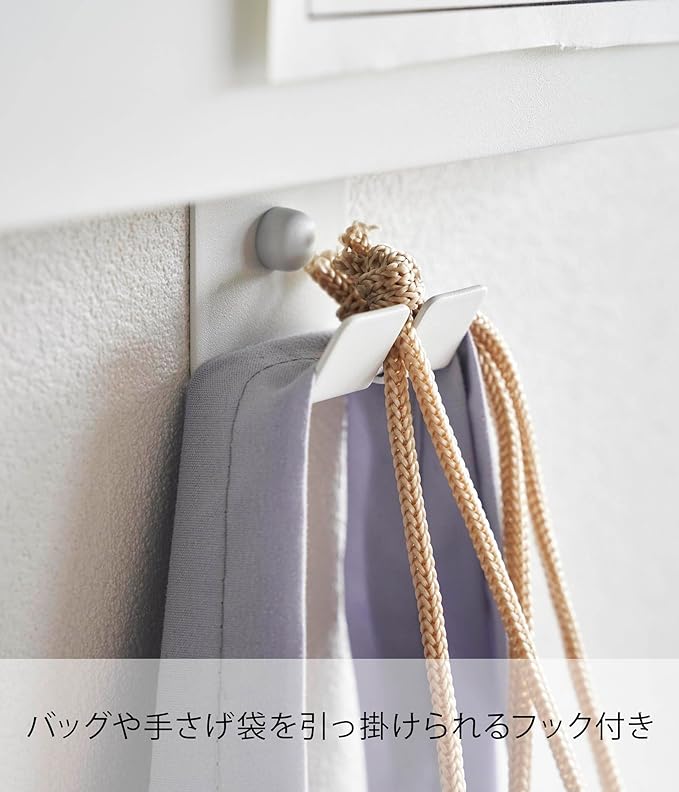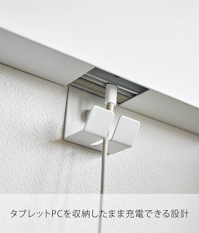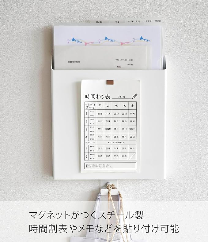 お子さまのプリント類やバッグ類をまとめて収納 石こうボードピンで壁に取り付け可能な収納ホルダーです。お子様のお部屋やリビングでの使用に最適。日々溜まっていくプリント類や手さげ袋などを壁に浮かせて一括収納できちゃいます。クリアファイル等の仕分けに便利なインデックスシール付きです。フックは通園・通学用のバッグや手さげ袋の収納にも便利。子ども部屋にもリビングにも合う2色のカラーバリエーション カラーは、明るい印象のホワイトと、スタイリッシュなブラックをご用意しました。食卓にもリビングにもなじみやすいシンプルなモノトーンカラーです。壁紙の色やインテリアに合わせてお好きなカラーをお選びください。きょうだいで色分けするのもおすすめです。マグネット対応で表面に貼りつけもできちゃう マグネットがつくスチール製なので時間割などをペタっと貼っておけます。出欠の返事が必要なプリントやTODOリストなど、確認が必要なものもマグネットで貼っておいて、チェックが済んだら外せば親子で相互確認が取れます。リビングにぴったり。 雑誌やタブレットPCのマガジンラックに 雑誌やタブレットPCなどの定位置としてもご使用いただけます。タブレットPCを収納したまま充電ができるよう設計されているので、充電中にわざわざ別のところに置いておかなきゃ……なんて面倒なことはしなくてOK。収納しながら充電が完了するので、次に使うときにはバッテリー残量がMA×に。壁の穴が目立ちにくい石こうボードピン取り付け 石こうボードピンで設置するので、取り外したときに壁の穴が目立ちにくいのがうれしいポイント。大きな力は必要なく、コインを使って指でピンをぐっと押し込むだけ。女性でも簡単に取り付けが完了します。付属の木ネジを使えば柱や板壁に取り付けることも可能です。