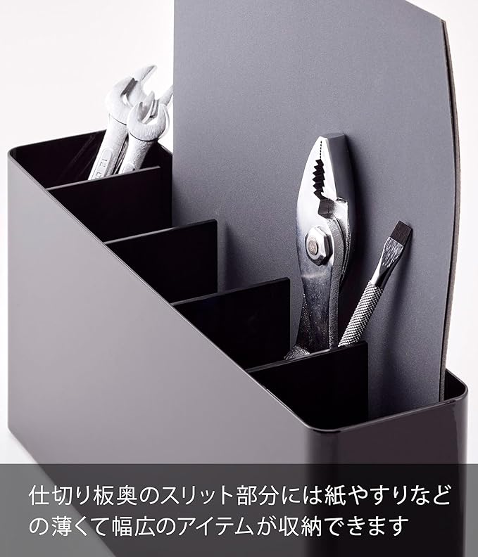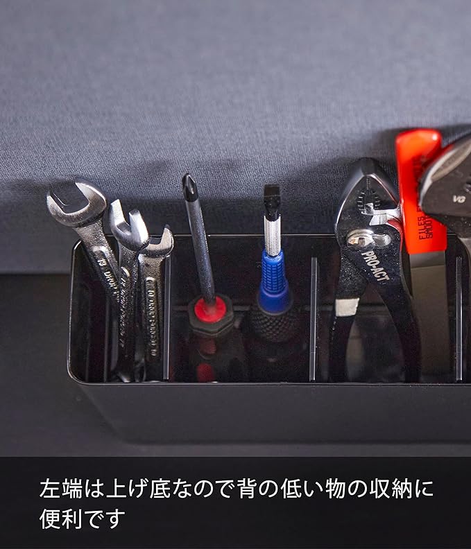 工具をスッキリまとめて手元に置ける奥行スリムな工具スタンド。左端が上げ底なので、背の低い物の収納に便利です。仕切り板奥のスリットに紙やすりが収納できます。仕切り板は取り外し可能なのでお手入れも簡単です。