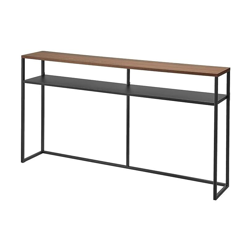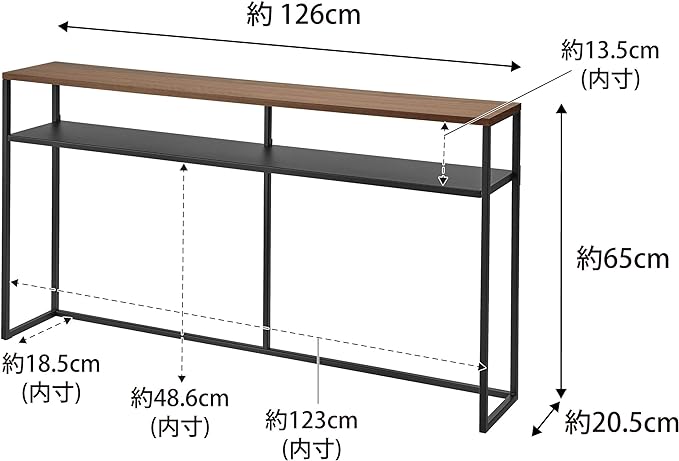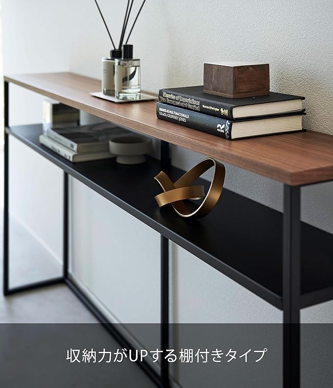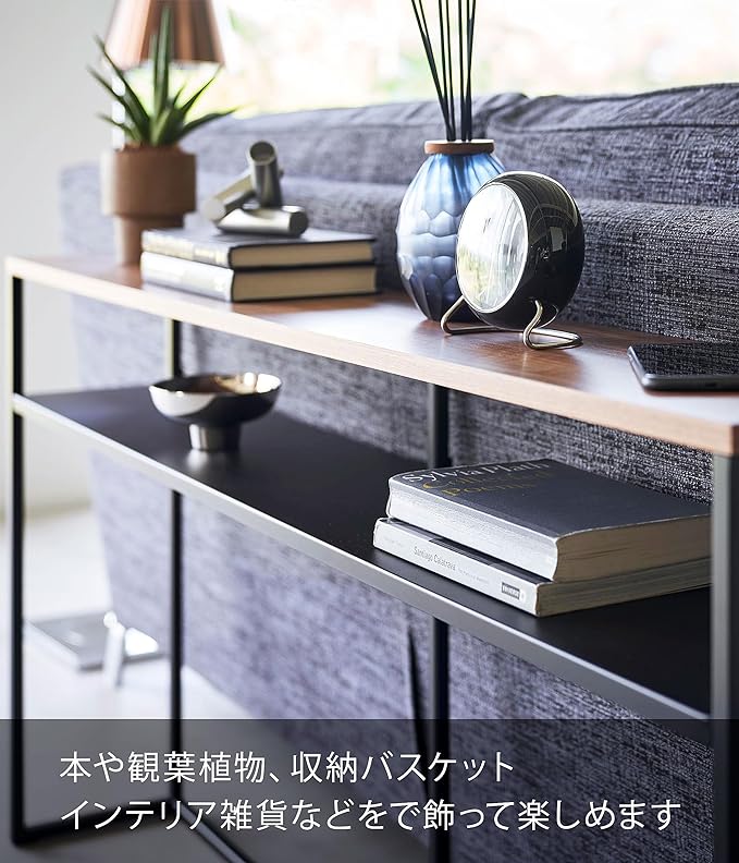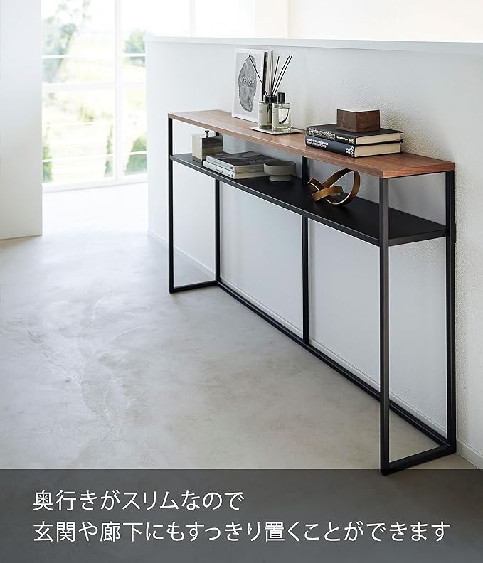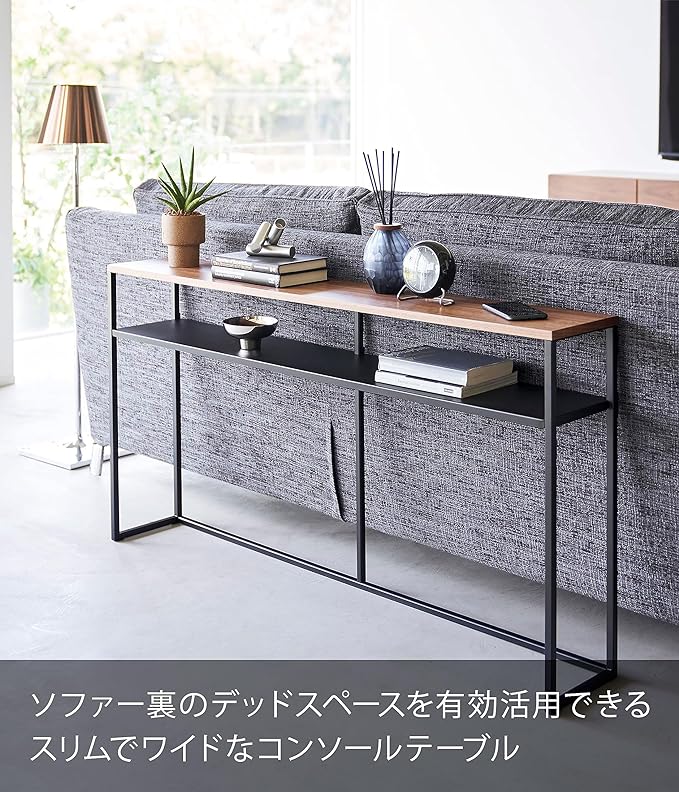 ソファー裏のデッドスペースを有効活用できるスリムでワイドなコンソールテーブル。ソファー裏に飾り棚やちょい置きスペースとして追加できるテーブル。棚が付いていて物が置けます。奥行きがスリムなので玄関や廊下などでもすっきりと置くことができます。