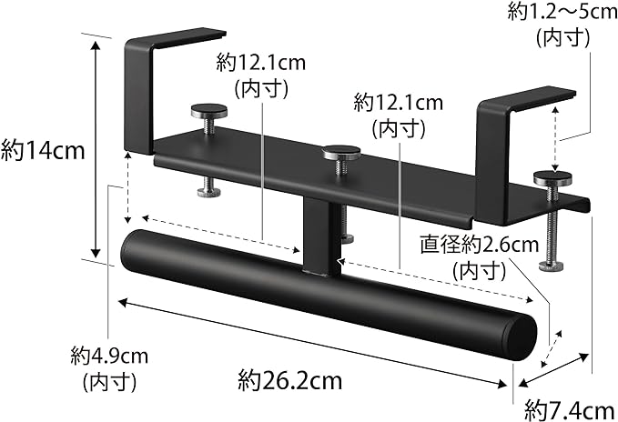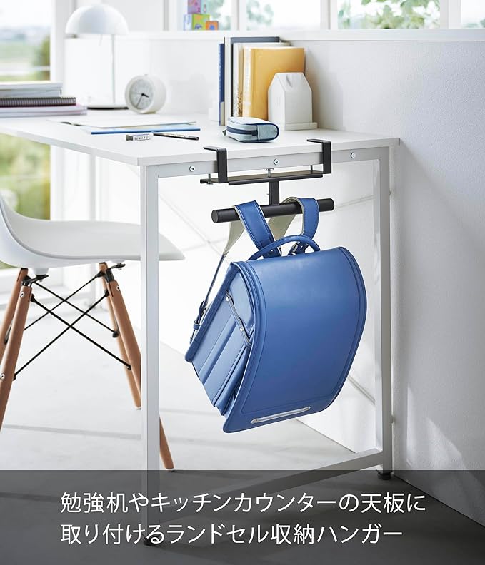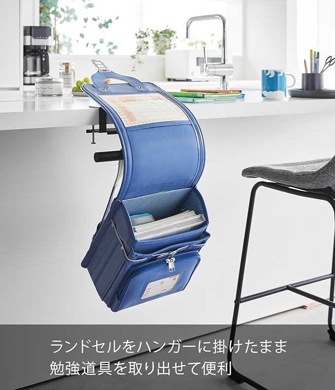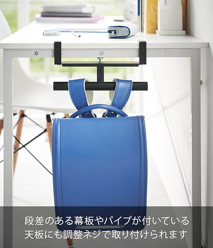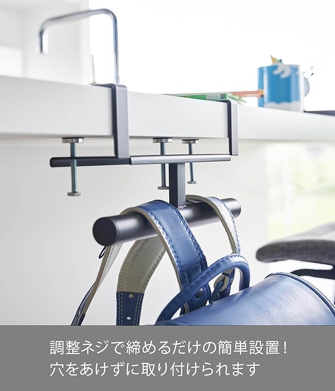 デスクやキッチンカウンターの天板に調節ネジでしっかりと取り付けできる便利なランドセル・リュック収納ハンガー。デスク横に取り付けてランドセルを収納することができます。段差のある幕板やパイプが付いている天板にも調節ネジで取り付けられます。調節ネジで固定するので穴をあけずに設置できます。勉強する場所に合わせて、デスクやキッチンカウンターなどにランドセル収納を追加することができます。リュックの収納にも便利です。キッチンカウンター天板の下に取り付ければ子供の宿題を見ながら家事ができて便利。3本の調節ネジでしっかりと固定できます。ランドセルを掛けたまま勉強道具を取り出せて便利。