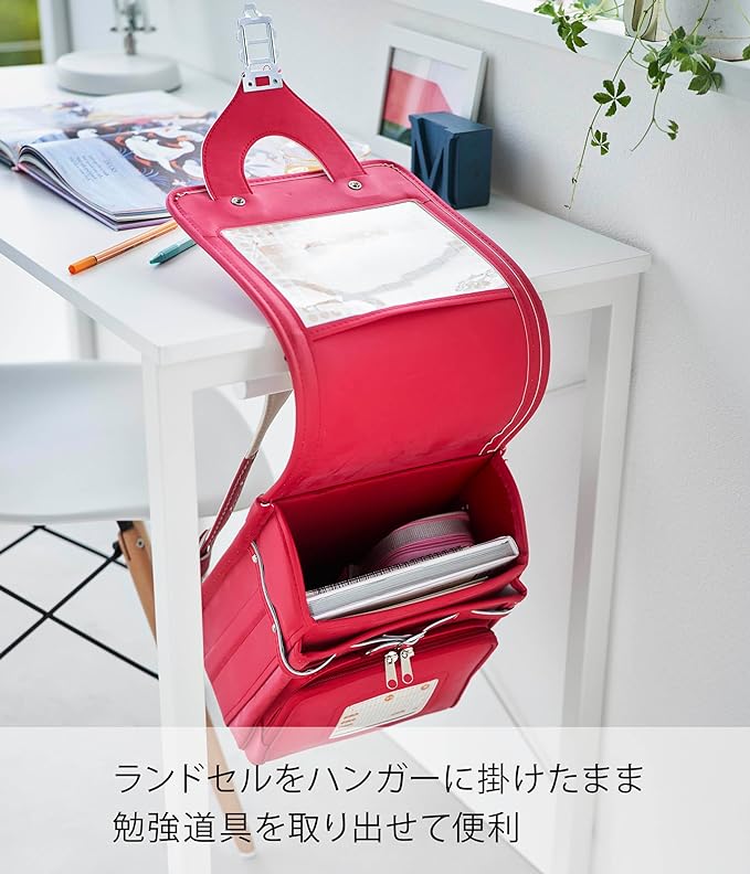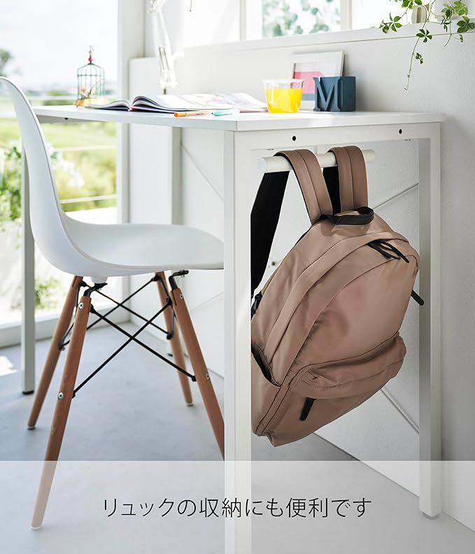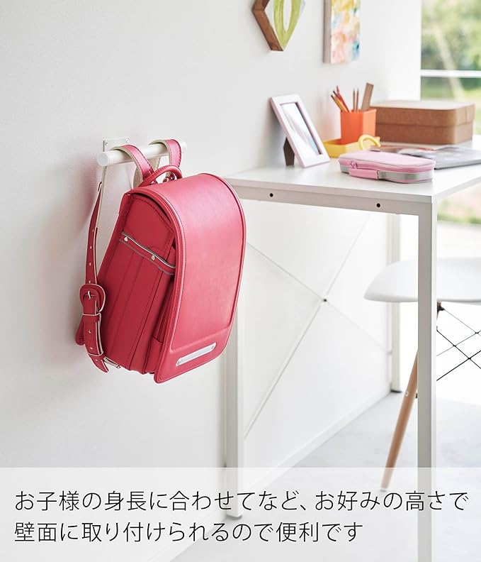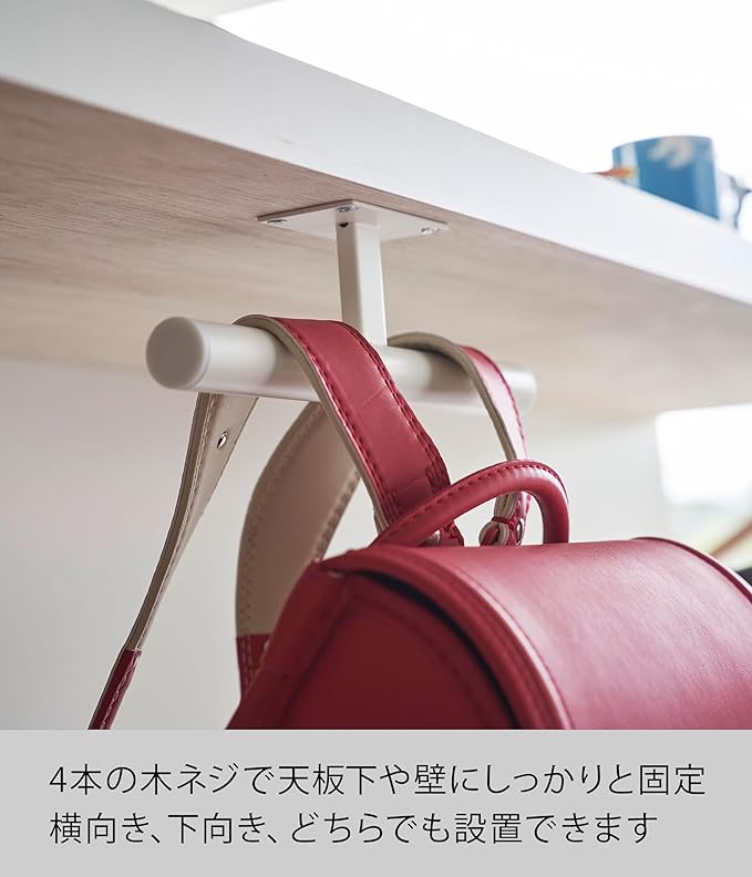 デスク下やキッチンカウンター下をランドセルの定位置に 木ネジでしっかりと取り付けできる、便利なランドセルやリュックの収納ハンガーです。勉強する場所に合わせて、デスクやキッチンカウンター、壁などにランドセル収納を追加することができます。リュックの収納にも便利です。子ども部屋にもリビングにも合う2色のカラーバリエーション カラーは、明るい印象のホワイトと、スタイリッシュなブラックをご用意しました。食卓にもリビングにもなじみやすいシンプルなモノトーンカラーです。壁紙の色やインテリアに合わせてお好きなカラーをお選びください。きょうだいで色分けするのもおすすめです。家事をしながら学習の見守りを リビング学習を習慣化しているなら、ランドセルの定位置もリビングにした方が利便性UP。 キッチンカウンターの天板下に取り付ければ、教科書や宿題のプリントをすぐに取り出せ、終わったらすぐにランドセルにしまえます。キッチンカウンターの天板裏に取り付ければ子供の宿題を見ながら家事ができます。天板下取り付けで忘れ物防止に ランドセルをハンガーに掛けたまま勉強道具を出し入れできて便利です。カウンターの天板下、学習机の天板下などに取り付ければ、出したものをそのまま卓上に置くのが自然な流れに。どこか別の場所に置いて失くした、せっかくやった宿題をランドセルにしまい忘れた……なんてお子さんのうっかりミスが防げます。10kgの重さに耐えられる。 木ネジでしっかり固定 木ネジでしっかりと固定するので、教科書やタブレットPCなどの勉強道具がぎっしりと詰まったランドセルも余裕で引っ掛けられます。耐荷重はなんと10kg。 横向き・下向きどちらにも設置可能です。お子さんの身長に合わせてお好みの高さに調整して設置してください。
