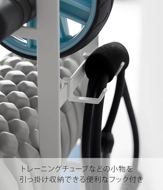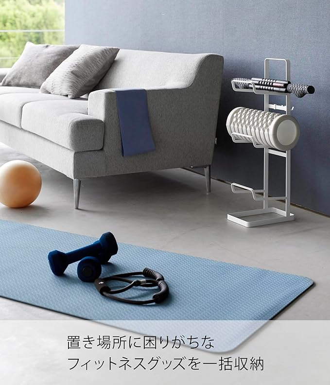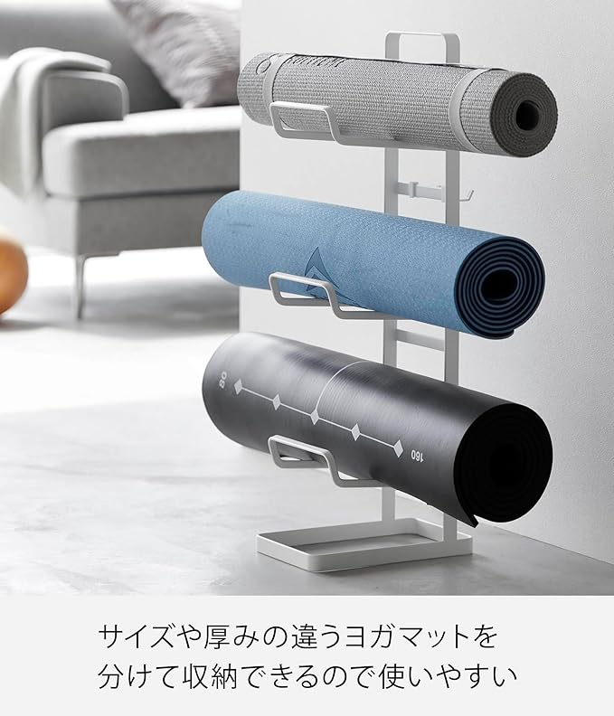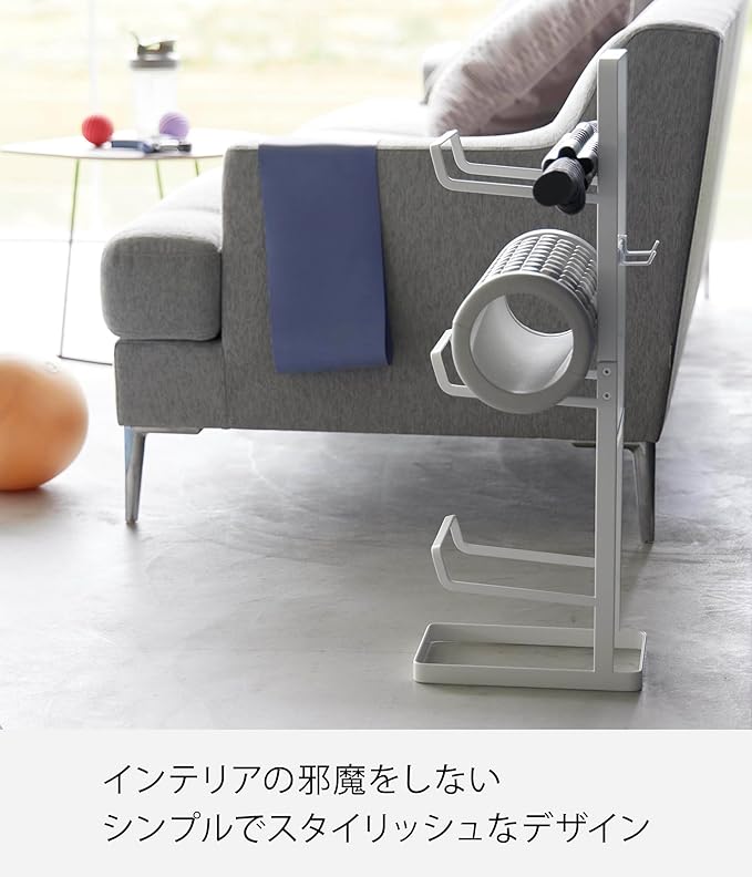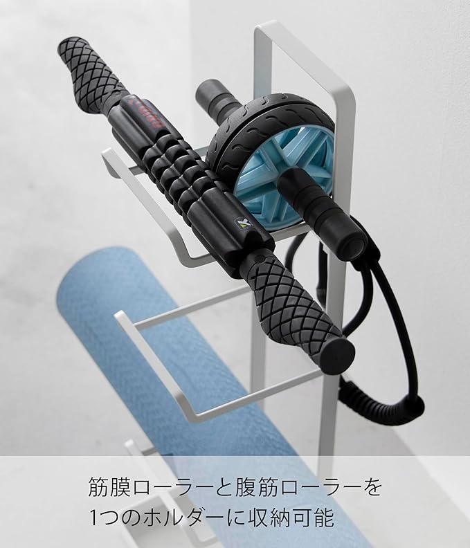 並べて収納で省スペース収納可能なフィットネスラック サイズや厚みの違うヨガマットを分けて収納できる、フィットネスグッズ収納ラックです。ヨガマットはそのまま立てかけると不安定だったり、バンド等をしていないと広がってしまいがちですが、横にしてラックにかけるだけで省スペースに収納できます。好みで選べる2つのカラーバリエーション フィットネスグッズ収納ラックのカラーは、ホワイトとブラックの2色をご用意いたしました。シンプルな色合いとデザインだから、リビングや寝室などの見える収納をしてもお部屋に自然となじんでくれます。出し入れや掃除も簡単なキャスター付き ラックの奥行きは24cm、横幅15cmです。ソファやテレビボードの横など、ちょっとした隙間に置きやすいコンパクトサイズが魅力です。サッと取り出して収納できるから、トレーニングの準備から片付けまで面倒さを感じさせません。複数まとめてもしっかり収まる ホルダー1つに筋膜ローラーと腹筋ローラーをまとめて収納できます。省スペースですっきり見せながら、エクササイズ器具を美しくディスプレイできるのが魅力。前後で収納して収納力アップ ラック後ろ側には好みで位置を変えられるフックが付属しています。ストレッチバンドやヘアゴムなどの小物グッズを引っ掛けられ収納力がアップします。
