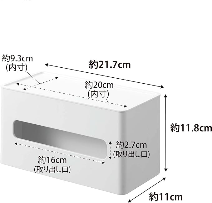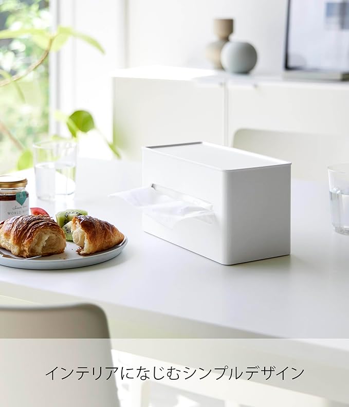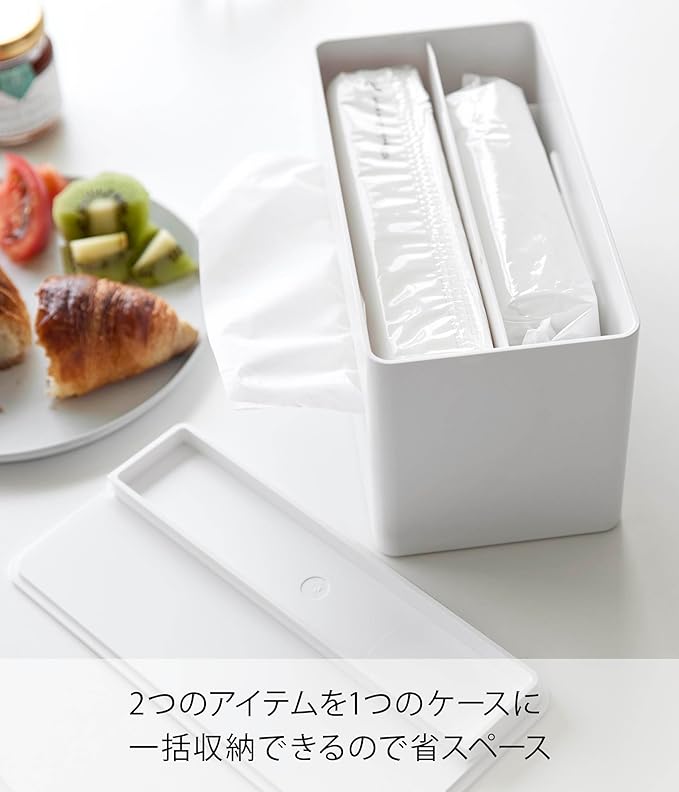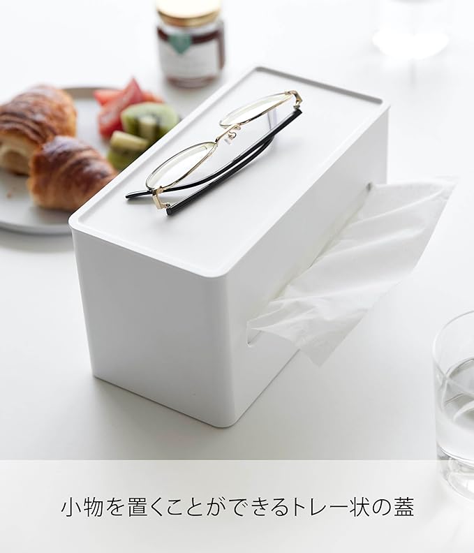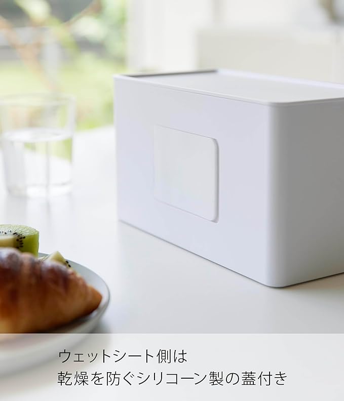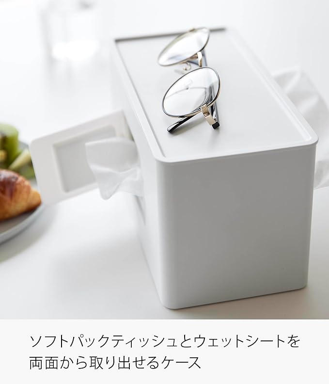 左右で一括収納、ティッシュ&ウェットシートケース 300部(150組)までのソフトパックティッシュ(袋入りティッシュ)とウェットシートを、左右に分けてまとめて収納できるスタイリッシュなケースです。ケースの上には小物も置けるから、散らかりがちな卓上をコンパクトにひとまとめにしたい方にぴったりのアイテムです。好みで選べる2つのカラーバリエーション ケースのカラーは、ホワイトとブラックの2色をご用意いたしました。シンプルなデザインだから、リビングやダイニング、洗面台などどこに置いても主張せず、フタで中身が隠れるから生活感を感じさせません。シートの乾燥やホコリから守る、密閉性のあるシリコーンフタ ウェットシートの取り出し口は縦幅4cm、横幅5cmで、シリコーン素材でできています。フタがしっかりと閉まるからウェットシートやおしり拭き、お掃除シートなど、濡れたままをキープしながらホコリからも守ってくれます。小物も置ける上部のトレー フタはトレー状になっているので、メガネや目薬、ヘアクリップなどの小物類を収納するのにぴったりです。よく使うアイテムをひとまとめに収納できるからお出かけ用品を置いたり、食事前後の内服薬やサプリメントを飲む方の飲み忘れ防止にも役立ちます。安定感のある滑り止め付き 底面には滑り止めが付いています。ティッシュやウェットシートを取るときにズレずにサッと取り出せて、接地面に傷を付ける心配も抑えられます。