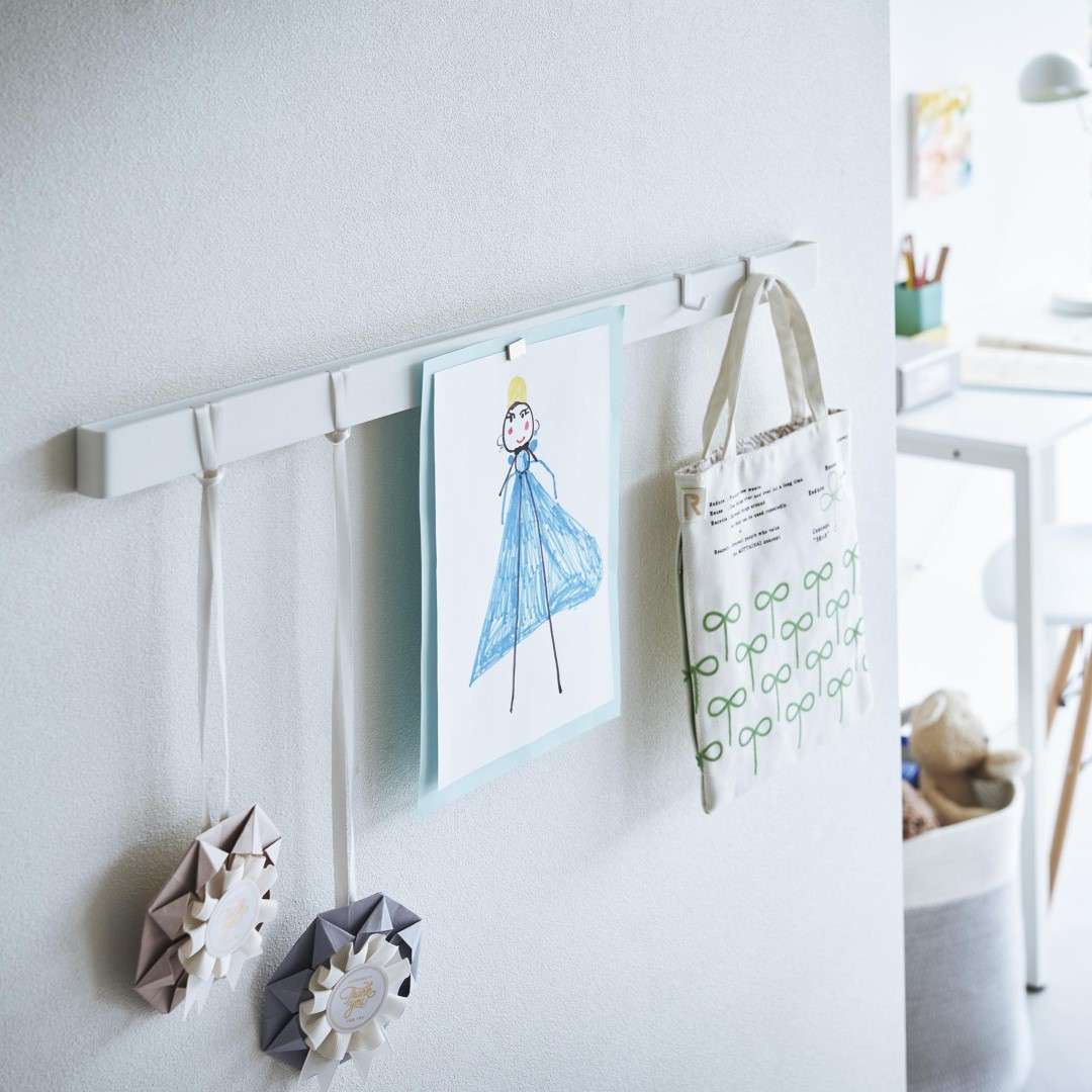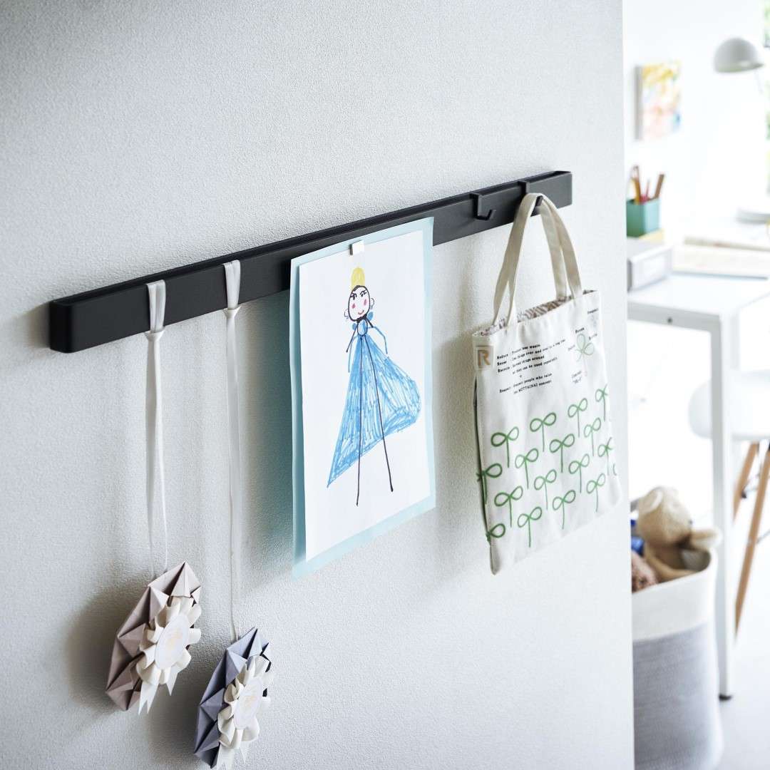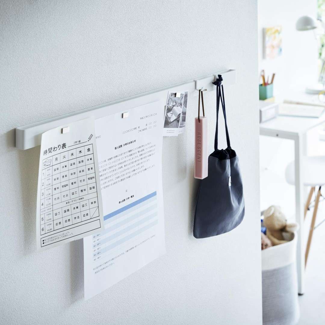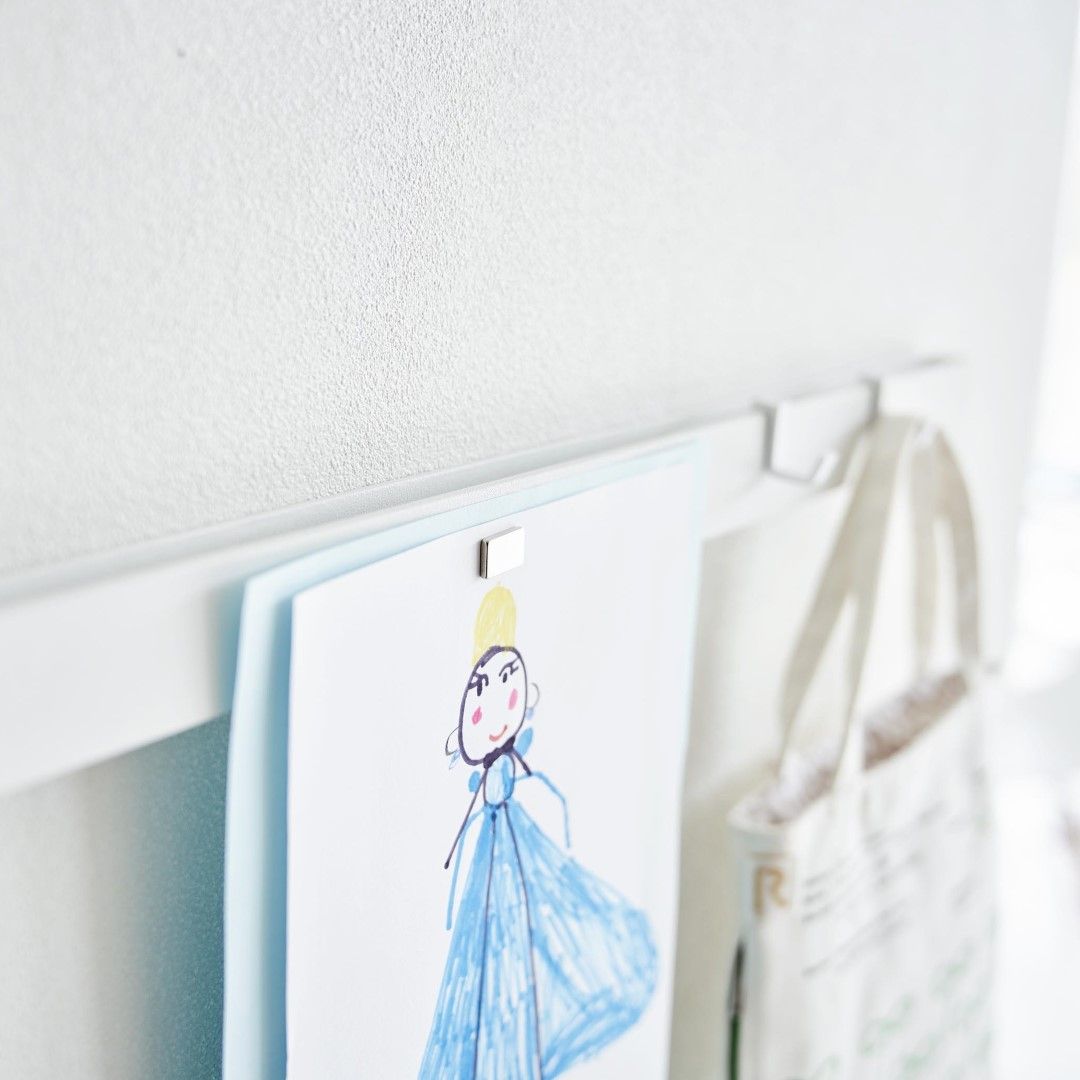 石こうボード壁にマグネット収納できるスチールバー 穴を空けたりテープ跡を残したくないお子さまの作品も、きれいな状態を保ったままマグネットで飾れます。時間割や年間予定表もまとめて張り出し。「その日貰ってきたプリントは貼っておく」などルールを設けてみるのも◎。子ども部屋にもリビングにも合う2色のカラーバリエーション カラーは、明るい印象のホワイトと、スタイリッシュなブラックをご用意しました。リビングにも子ども部屋にもなじみやすいシンプルなモノトーンカラーです。壁紙の色やインテリアに合わせてお好きなカラーをお選びください。フックを使って引っ掛け収納も 付属のフックを使えば引っ掛け収納も可能です。幼稚園や運動会で貰ってきたメダルなどの記念品を引っ掛けて保管するのにも役立ちます。頑張った証が飾られているのを目にする度に自然とお子さんのやる気もUP。 お出掛け小物の壁面収納に 玄関に取り付ければお出掛け小物の収納にもお役立ち。帽子やキーケース、ポシェットなどこまごました物をまとめて壁面に収納できるので場所を取りません。ペットのお出かけ用グッズのリードやハーネス、お散歩用バッグなどを引っ掛けておく使い方もできます。壁の穴が目立ちにくい石こうボードピン取り付け 石こうボードピンで設置するので、取り外したときに壁の穴が目立ちにくいのがうれしいポイント。大きな力は必要なく、コインを使って指でピンをぐっと押し込むだけ。女性でも簡単に取り付けが完了します。付属の木ネジを使えば柱や板壁に取り付けることも可能です。