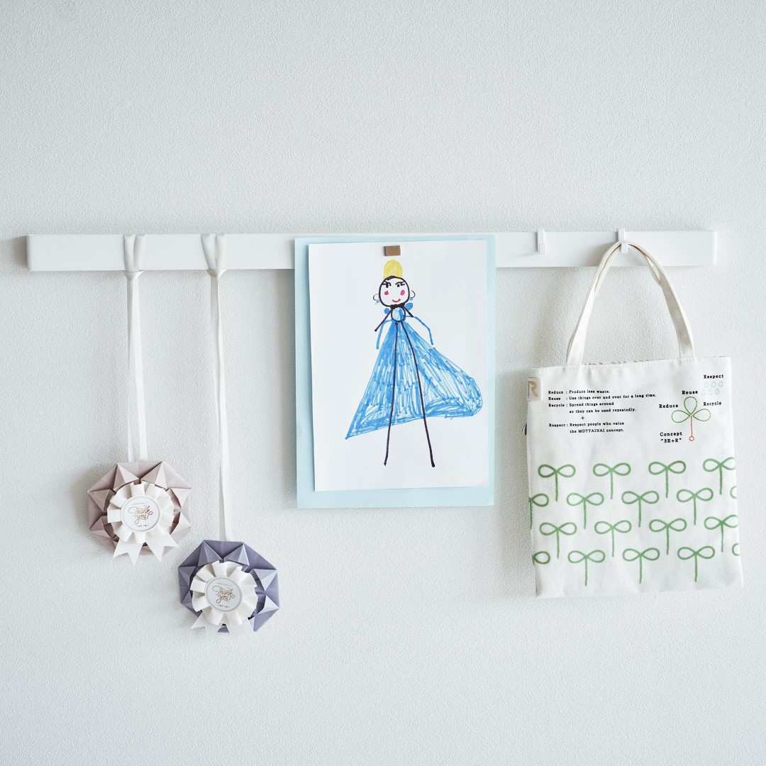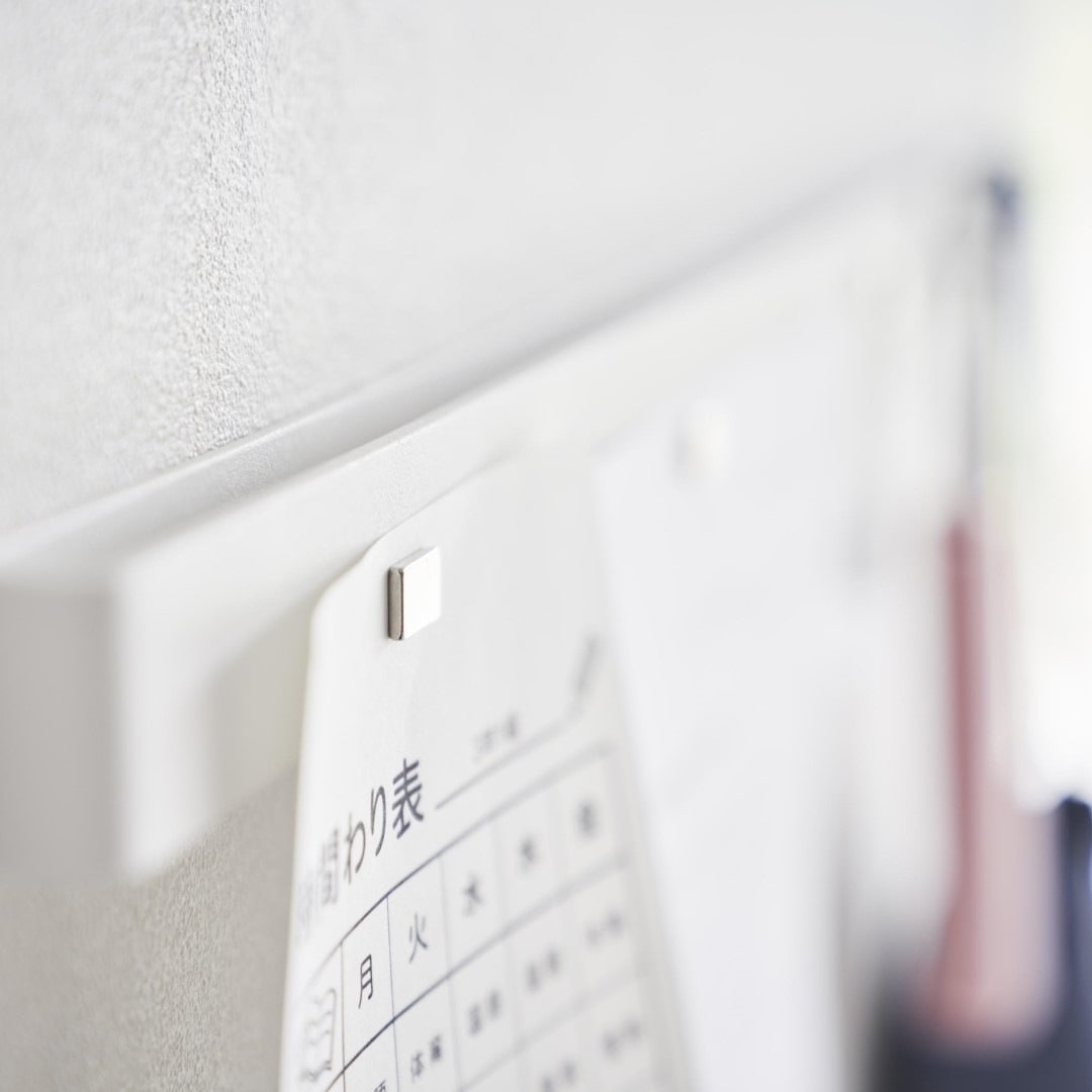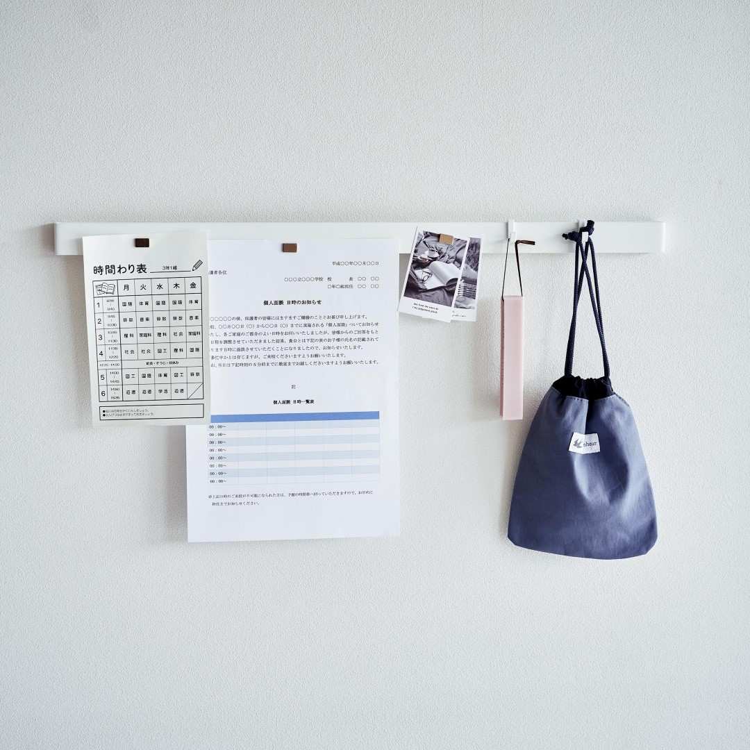 石こうボード壁にマグネット収納できるスチールバー 穴を空けたりテープ跡を残したくないお子さまの作品も、きれいな状態を保ったままマグネットで飾れます。時間割や年間予定表もまとめて張り出し。「その日貰ってきたプリントは貼っておく」などルールを設けてみるのも◎。子ども部屋にもリビングにも合う2色のカラーバリエーション カラーは、明るい印象のホワイトと、スタイリッシュなブラックをご用意しました。リビングにも子ども部屋にもなじみやすいシンプルなモノトーンカラーです。壁紙の色やインテリアに合わせてお好きなカラーをお選びください。フックを使って引っ掛け収納も 付属のフックを使えば引っ掛け収納も可能です。幼稚園や運動会で貰ってきたメダルなどの記念品を引っ掛けて保管するのにも役立ちます。頑張った証が飾られているのを目にする度に自然とお子さんのやる気もUP。 お出掛け小物の壁面収納に 玄関に取り付ければお出掛け小物の収納にもお役立ち。帽子やキーケース、ポシェットなどこまごました物をまとめて壁面に収納できるので場所を取りません。ペットのお出かけ用グッズのリードやハーネス、お散歩用バッグなどを引っ掛けておく使い方もできます。壁の穴が目立ちにくい石こうボードピン取り付け 石こうボードピンで設置するので、取り外したときに壁の穴が目立ちにくいのがうれしいポイント。大きな力は必要なく、コインを使って指でピンをぐっと押し込むだけ。女性でも簡単に取り付けが完了します。付属の木ネジを使えば柱や板壁に取り付けることも可能です。