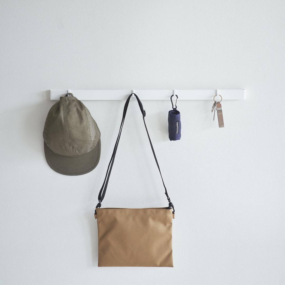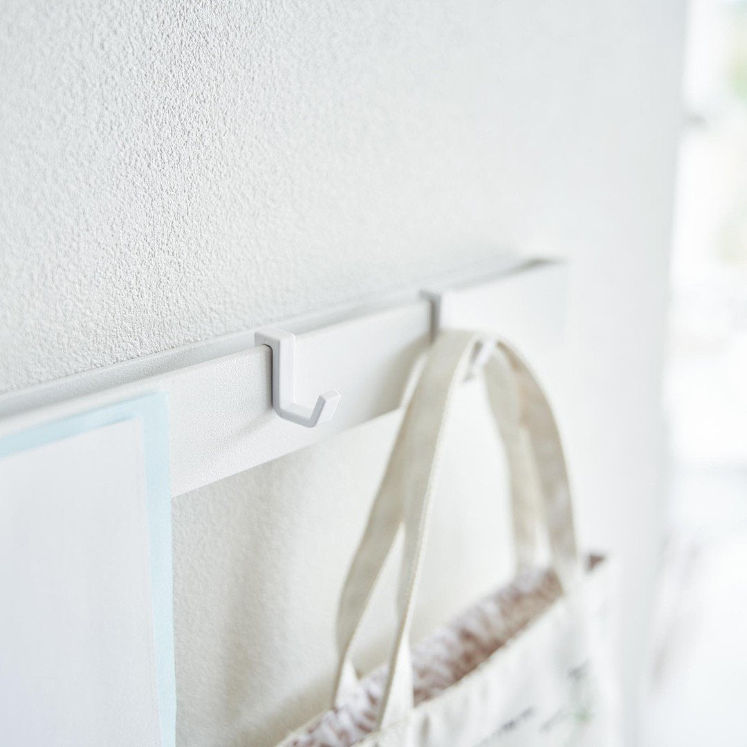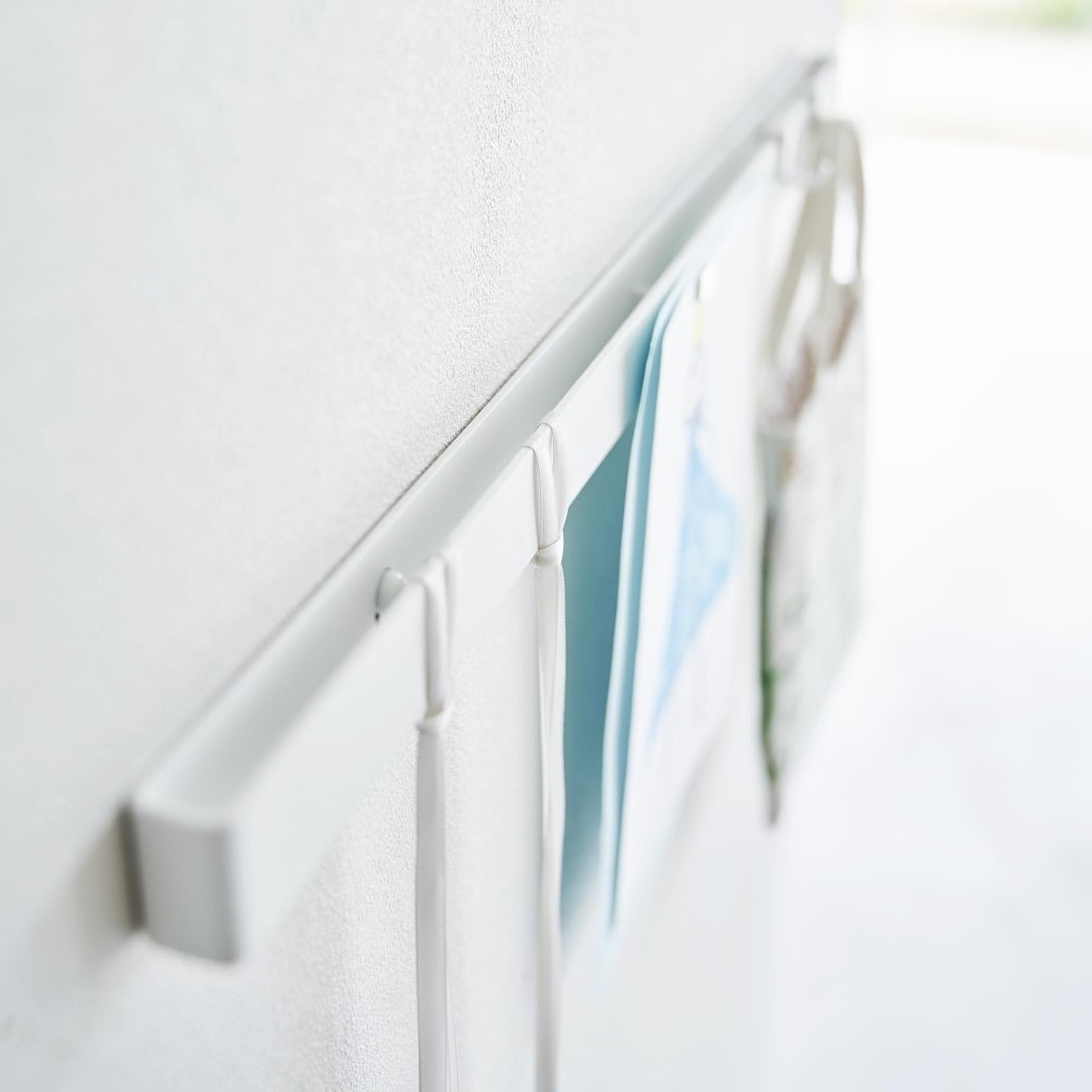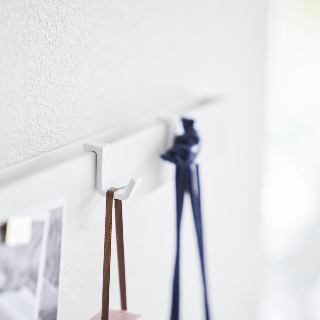 石こうボード壁にマグネット収納できるスチールバー 穴を空けたりテープ跡を残したくないお子さまの作品も、きれいな状態を保ったままマグネットで飾れます。時間割や年間予定表もまとめて張り出し。「その日貰ってきたプリントは貼っておく」などルールを設けてみるのも◎。子ども部屋にもリビングにも合う2色のカラーバリエーション カラーは、明るい印象のホワイトと、スタイリッシュなブラックをご用意しました。リビングにも子ども部屋にもなじみやすいシンプルなモノトーンカラーです。壁紙の色やインテリアに合わせてお好きなカラーをお選びください。フックを使って引っ掛け収納も 付属のフックを使えば引っ掛け収納も可能です。幼稚園や運動会で貰ってきたメダルなどの記念品を引っ掛けて保管するのにも役立ちます。頑張った証が飾られているのを目にする度に自然とお子さんのやる気もUP。 お出掛け小物の壁面収納に 玄関に取り付ければお出掛け小物の収納にもお役立ち。帽子やキーケース、ポシェットなどこまごました物をまとめて壁面に収納できるので場所を取りません。ペットのお出かけ用グッズのリードやハーネス、お散歩用バッグなどを引っ掛けておく使い方もできます。壁の穴が目立ちにくい石こうボードピン取り付け 石こうボードピンで設置するので、取り外したときに壁の穴が目立ちにくいのがうれしいポイント。大きな力は必要なく、コインを使って指でピンをぐっと押し込むだけ。女性でも簡単に取り付けが完了します。付属の木ネジを使えば柱や板壁に取り付けることも可能です。
