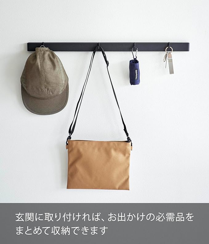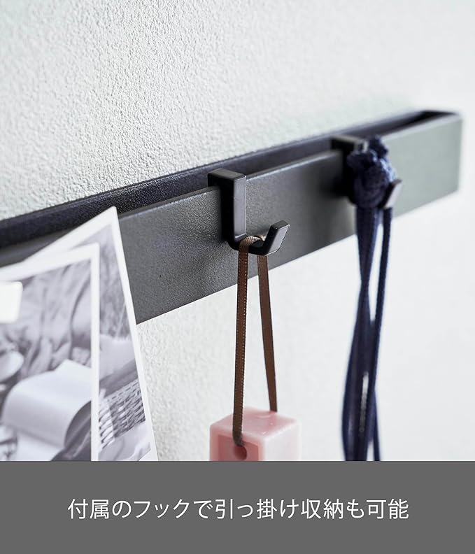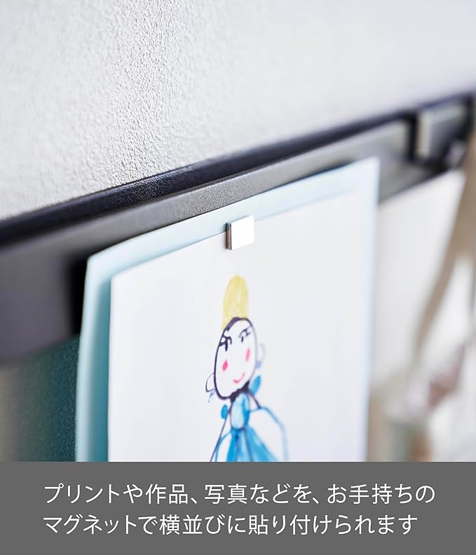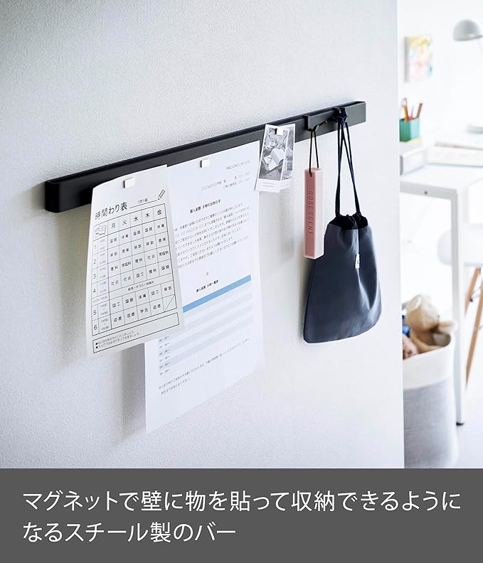 マグネットで壁に収納できるようになるスチールバー。プリントや写真などを横並びに貼り付けることができます。お子様のプリントや時間割表、作品などを貼り付けるのに便利。付属フックで手提げバッグなどの収納ができます。玄関に取り付ければお出かけの必需品をまとめて収納できます。壁の穴が目立たない石こうボードピンで簡単取り付け。