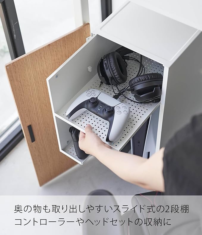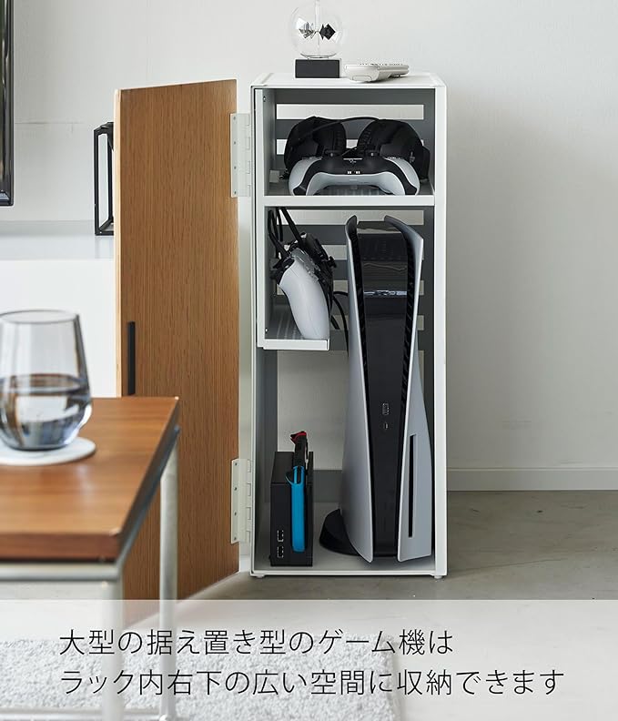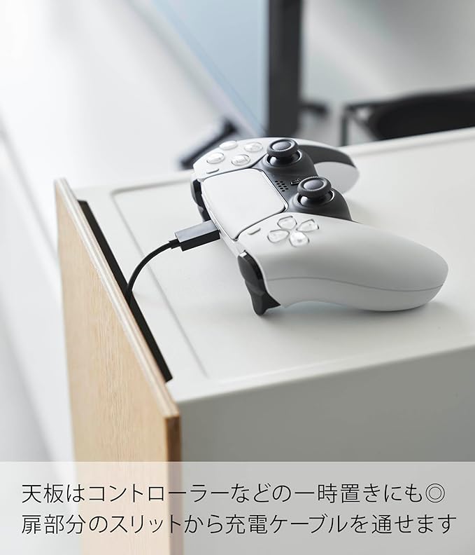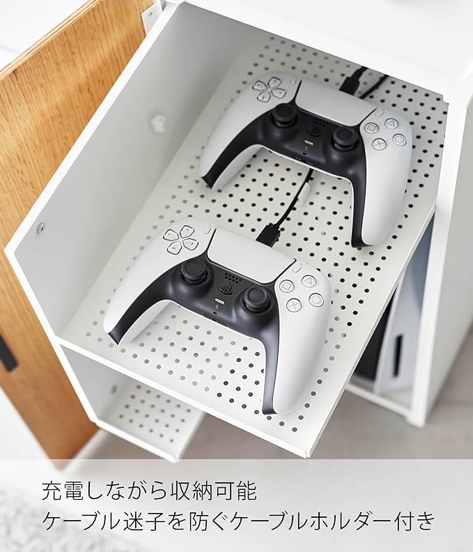ゲーム機やコントローラーを隠してすっきり収納 リビングなどで雑然としがちなゲーム機やコントローラーなどを取り出しやすいラックです。大容量ながらも奥のものが取り出しやすいスライド式の棚は、コントローラーやヘッドセットの収納にぴったりです。上部の棚はコントローラーを2つ並べても余裕のある広さ。下部の棚にはコントローラーを立てて収納できます。インテリアにマッチする2色のカラーバリエーション カラーは、明るい印象のホワイトと、スタイリッシュなブラックをご用意しました。扉はそれぞれのカラーリングに合わせて、ホワイトはナチュラルな色味に、ブラックは重厚感のある色味が採用されています。お部屋のインテリアに合わせてお好きなカラーをお選びください。「充電ケーブルがない。」を防ぐホルダー付き 大型の据え置き型ゲーム機はラック内右下の広い部分に。小型のゲーム機は左の部分に収納できます。コントローラーは充電しながら収納が可能です。ケーブルが迷子になるのを防ぐケーブルホルダー付きなので、充電の度にケーブルを探すといったわずらわしさから解放されます。スリットがあるから充電したままコントローラーを天板に 天板はコントローラーなどの一時置きにもご使用いただけます。扉上部のスリットからケーブルを通せるので、充電したままのコントローラーを天板に出してもケーブルを挟まずに扉を閉められます。ゲーム機からの熱をしっかり排熱。 ケーブルがごちゃつかずスッキリ ラックの裏には排熱穴がしっかりと空いており、ゲーム機から発生する熱をラック内に溜め込まず外部に放出します。排熱穴からケーブルの抜き差しもスムーズに行えます。ラック裏から直接ケーブルを通すことで見た目もスッキリとした印象に。