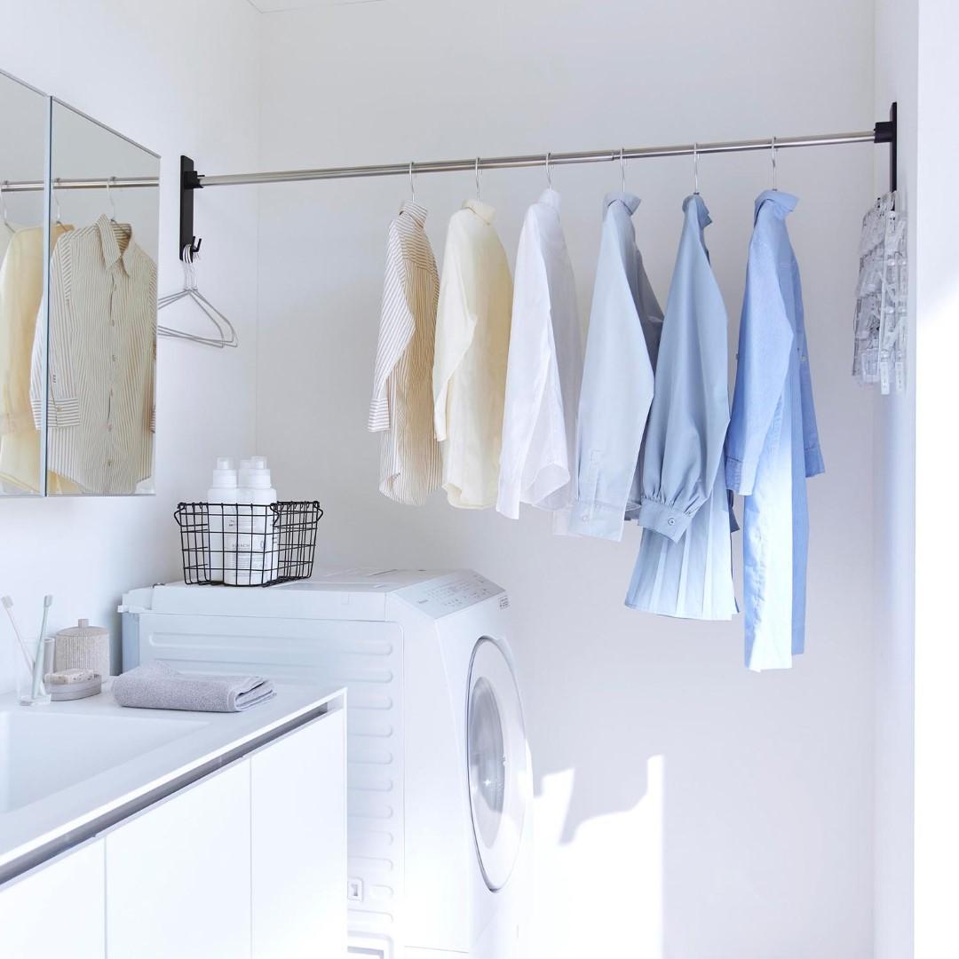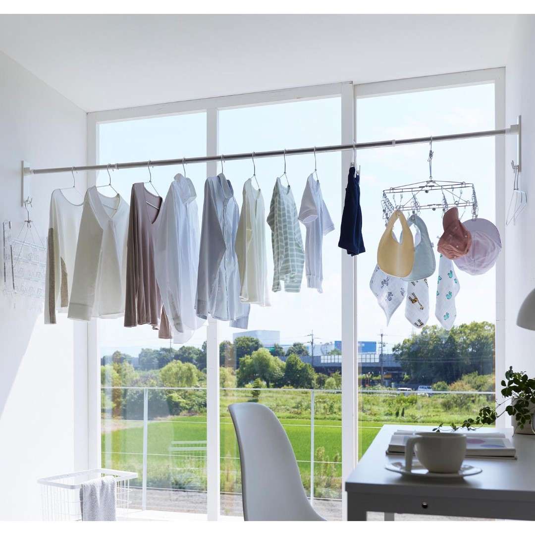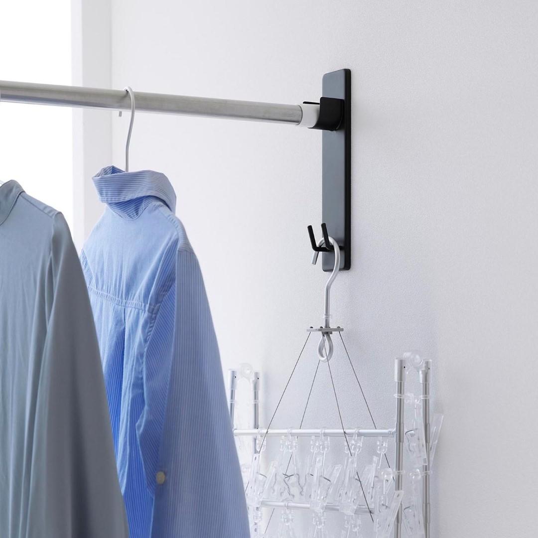 取り付け簡単。 家の中に物干しスペースを作れちゃう 部屋の中に室内干しをするスペースを簡単に増設できる、物干し竿ホルダーです。石こうボードピンを使うから取り付けはあっという間。洗濯物を干さないときには物干し竿を外しておけば見た目もスッキリとし動線の邪魔にもなりません。リビング空間にぴったりな2色のカラーバリエーション カラーは、明るい印象のホワイトと、スタイリッシュなブラックをご用意しました。どんなインテリアのトイレにも合わせやすいシンプルなモノトーンカラーです。壁紙の色などに合わせてなどお好きなカラーをお選びください。室内干しがしにくい季節にお役立ち 花粉や黄砂が気になる季節、外干しがしにくくなる梅雨は室内干しの機会が増えます。室内なら花粉や雨に困ることもないので安心して洗濯物の乾燥ができます。また冬場には乾燥対策にあえて室内干しをする家庭も多いのでは。ハンガー・ピンチハンガーを収納できるフック付き おすすめの設置場所は窓際です。部屋干しであっても太陽の陽気で窓際の方が効率よく乾きます。ホルダーの下部にはフックが付いており、使っていないハンガーやピンチハンガーの収納場所としてもご使用いただけます。※物干し竿は付属しておりません。壁の穴が目立ちにくい石こうボードピン取り付け 石こうボードピンで設置するので、取り外したときに壁の穴が目立ちにくいのがうれしいポイント。大きな力は必要なく、コインを使って指でピンをぐっと押し込むだけ。女性でも簡単に取り付けが完了します。付属の木ネジを使えば柱や板壁に取り付けることも可能です。