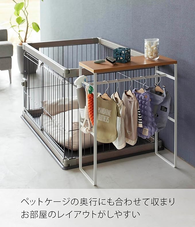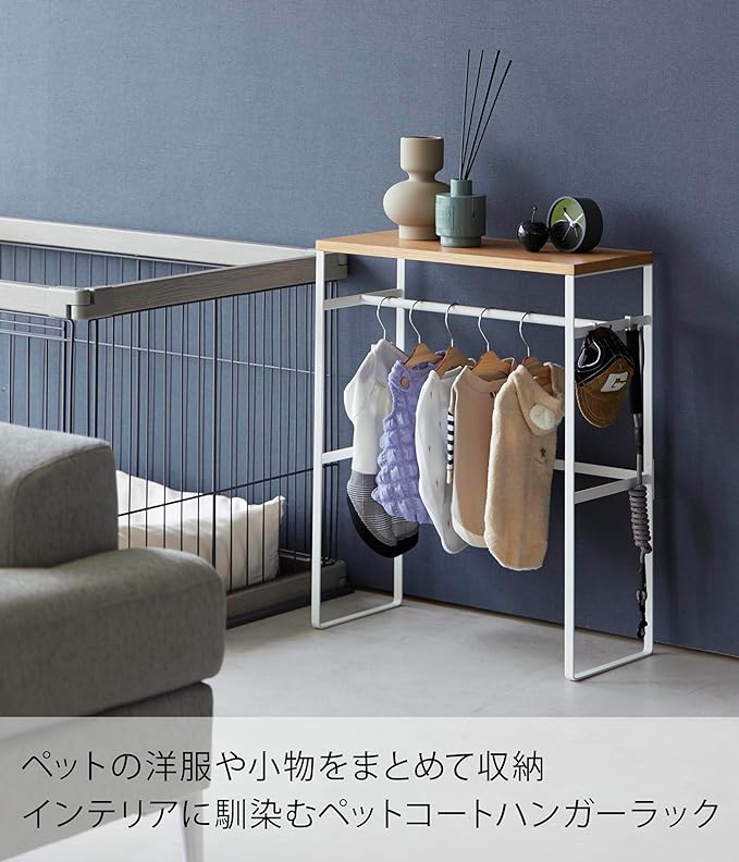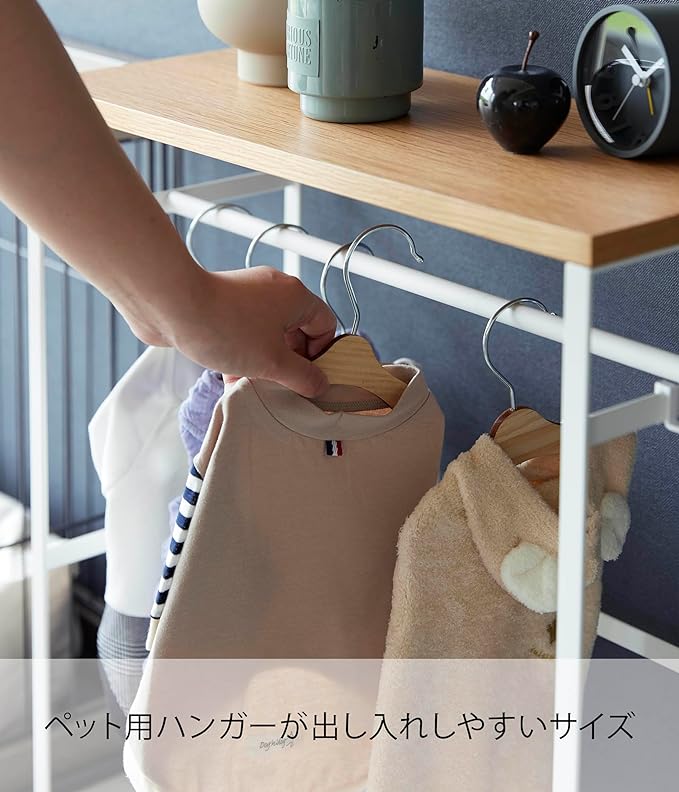 ペット用ハンガーラックでペット小物をまとめて収納 ペットの洋服や小物をまとめて収納しておけるハンガーラックです。ペット用のミニサイズのハンガーが出し入れしやすいちょうどいいサイズです。お出かけグッズがここにあると覚えたら、この場所に向かうだけで「お散歩だ。」とすごく喜んで後をついてきそう。リビング空間にぴったりな2色のカラーバリエーション カラーは、明るい印象のホワイトと、スタイリッシュなブラックをご用意しました。リビングにも玄関にもマッチしやすいシンプルなモノトーンカラーです。家具や壁紙の色などに合わせてなどお好きなカラーをお選びください。サイドの付属フックで小物を引っ掛け収納 ラックのサイドにはフックがあり、お散歩用のリードやバッグなどはここに収納することもできます。近場のお散歩、ドッグランに行くとき……などリードを使い分けているのなら、複数あるリードの中から必要なものを瞬間的に手に取れるというメリットも。おやつストックもハンガーラックにまとめて収納 天板にはおやつのストックを置いておいたりできて便利。ご褒美のおやつは定位置を決めておくと出し入れの面倒くささがかからず、ペットにすぐに与えられます。また、ペット用の収納ラックとしてだけでなくコンソールテーブルといった使い方もできます。玄関先に置いておけるスリムさが◎奥行きが21cmとスリムなので玄関に置いても邪魔にならないサイズ感です。ペットコートハンガーラックを玄関に置いておけば、洋服やリードを片付けたり、足を拭いたりといったお出かけ後のお世話が玄関で完結します。