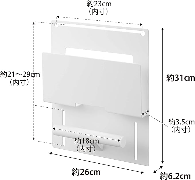 カラーボックスのネジで設置完了のタブレット&ランドセルホルダー カラーボックスのネジを活用して簡単に設置できるタブレット&ランドセル収納ラックです。カラーボックス横の空きスペースにタブレット&ランドセル収納が新たに誕生。コードは下からも接続可能で、充電しながら収納できます。子ども部屋にもリビングにも合う2色のカラーバリエーション カラーは、明るい印象のホワイトと、スタイリッシュなブラックをご用意しました。食卓にもリビングにもなじみやすいシンプルなモノトーンカラーです。インテリアに合わせてお好きなカラーをお選びください。きょうだいで色分けするのもおすすめです。収納したまま充電が可能 タブレットホルダーは下部に充電用のスリットが入っています。タブレットをホルダーに収納したまま充電ができるので出し入れの手間がかかりません。充電のためにタブレットを出しっ放しにしていたら、ランドセルに戻し忘れた。なんてうっかりミスも起こりづらいです。マグネット対応のスチール製。 時間割チェックにも スチール製なのでマグネットをくっつけられます。時間割表を貼り付けておけば、翌日の授業に合わせた教科書の入れ替えもスムーズ。提出物や貰ってきたプリントの出し忘れ・紛失の防止にもお役立ちです。カラーボックス横だけでなく、壁面にも対応 付属の木ネジや石こうボード用アンカーボルトを使えば壁面にも取り付けが可能です。リビング、子ども部屋、玄関などライフスタイルに合った場所に自由に取り付け。取り付けの際にはお子様の身長の高さに合わせて、ランドセルの掛け外しがしやすい位置に設置してください。
