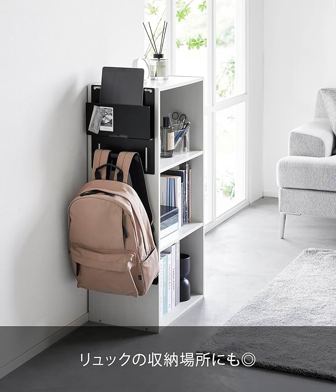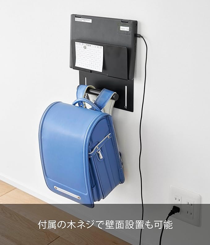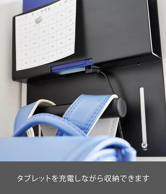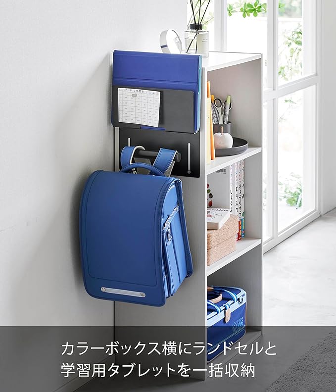 カラーボックス横にランドセルと学習用タブレットを充電しながら収納できる。小中学生に必須の学習タブレットをランドセルやバッグと一緒に収納できます。カラーボックスのネジを利用して簡単設置。通学に必要な準備物をまとめて収納できます。付属のネジで壁面にも取り付け可能。コードは下からも接続可能。充電しながら収納できます。