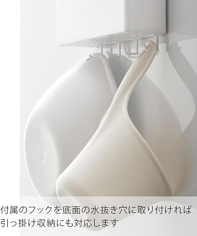 フィルムフックでお好みの位置に簡単取り付け。浮かせるのでぬめらず衛生的。フィルムフックに掛けるだけ。光沢のある壁面に取り付けられます。ガラスドアにも。掃除用品の収納に。タイルにも取り付け可能。コンロまわりの壁面に。仕切り板付き。ケアグッズなどの収納に。ドライヤーやブラシの収納に。付属のフックを底面の水抜き穴に簡単取り付け。